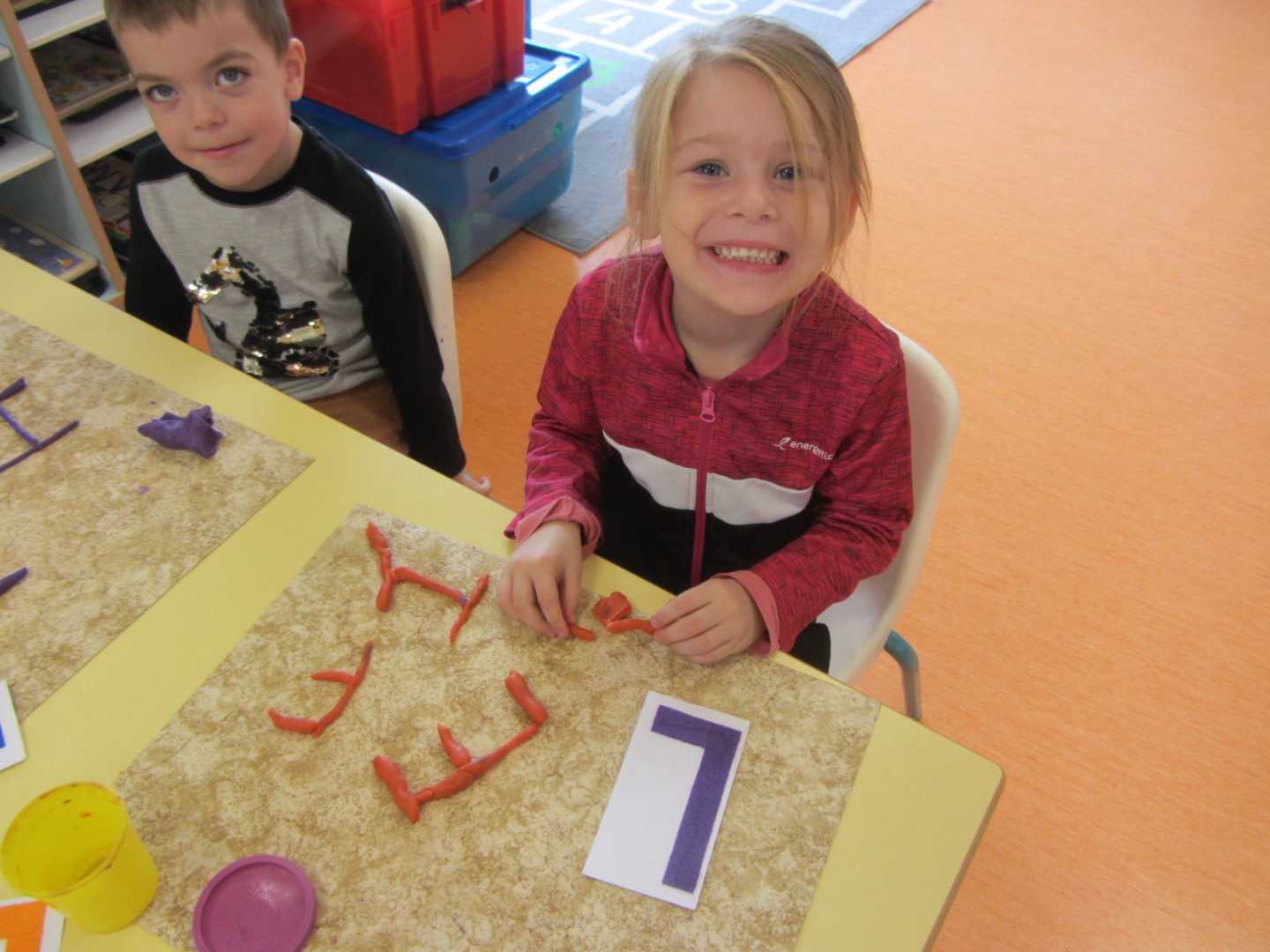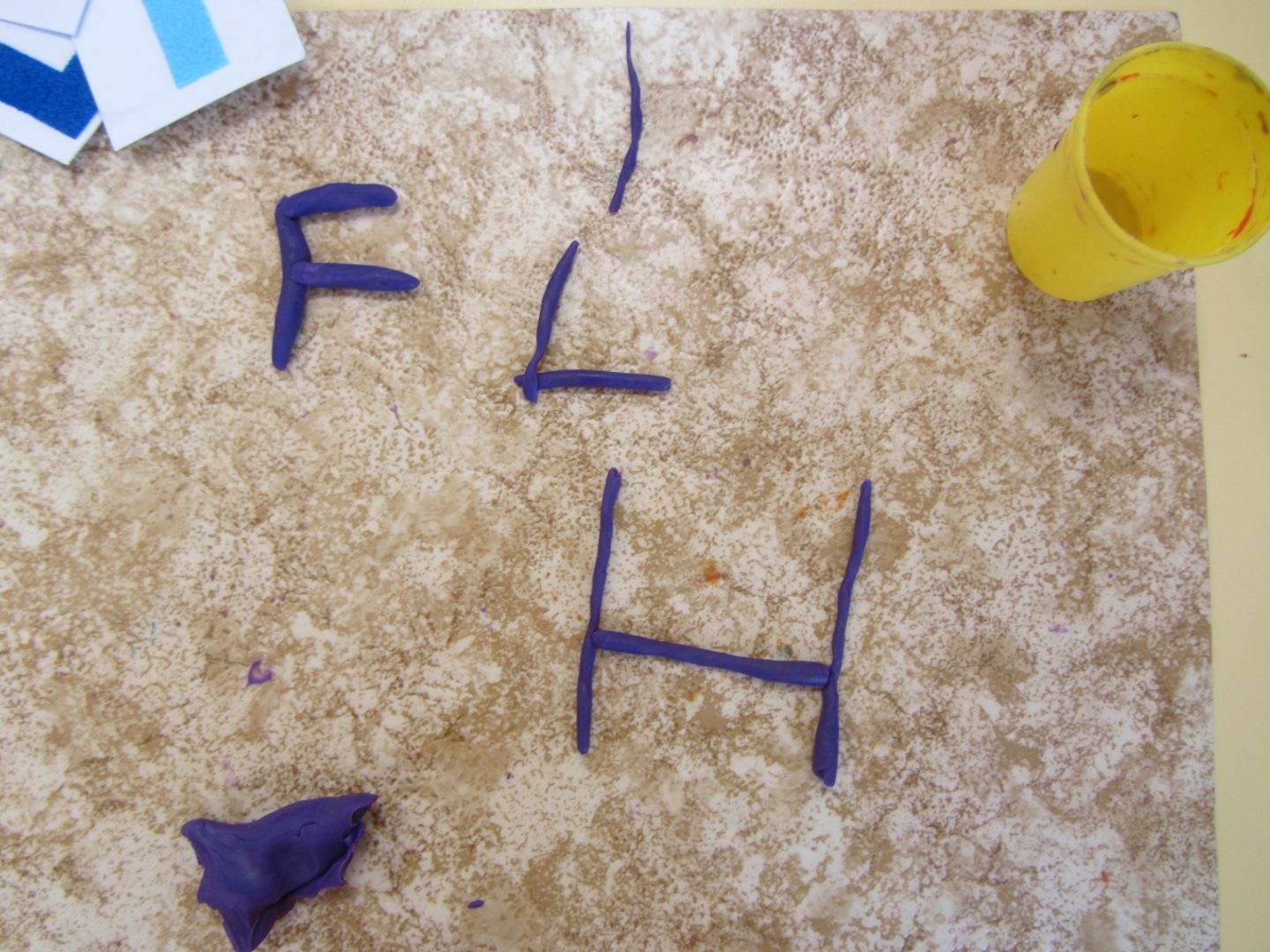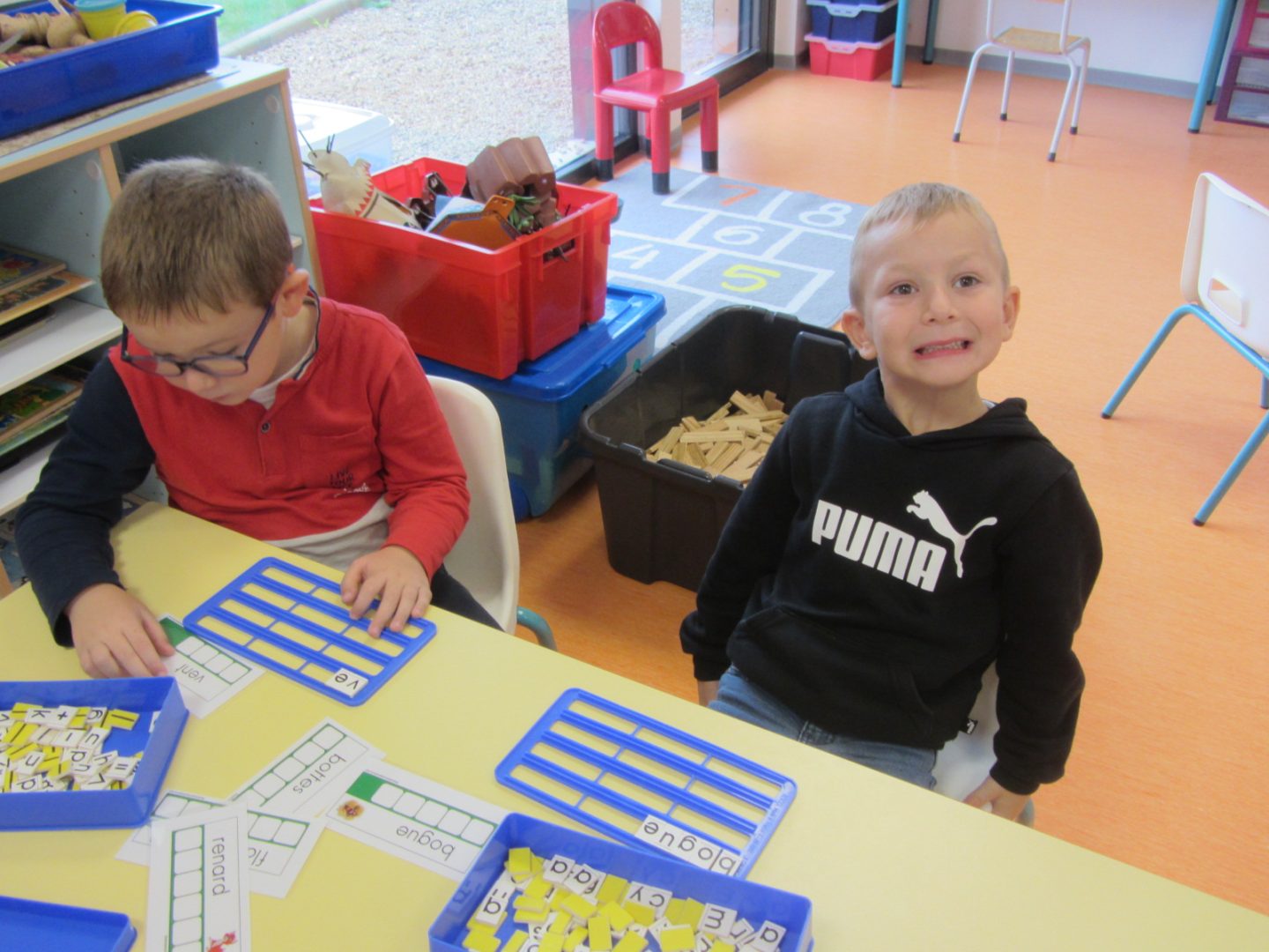 – Nous avons découvert les lettres écrites uniquement avec des lignes horizontales et verticales, celle que nous pouvons donc écrire tout seul maintenant. Nous les avons entouré puis construites avec différents jeux de la classe.