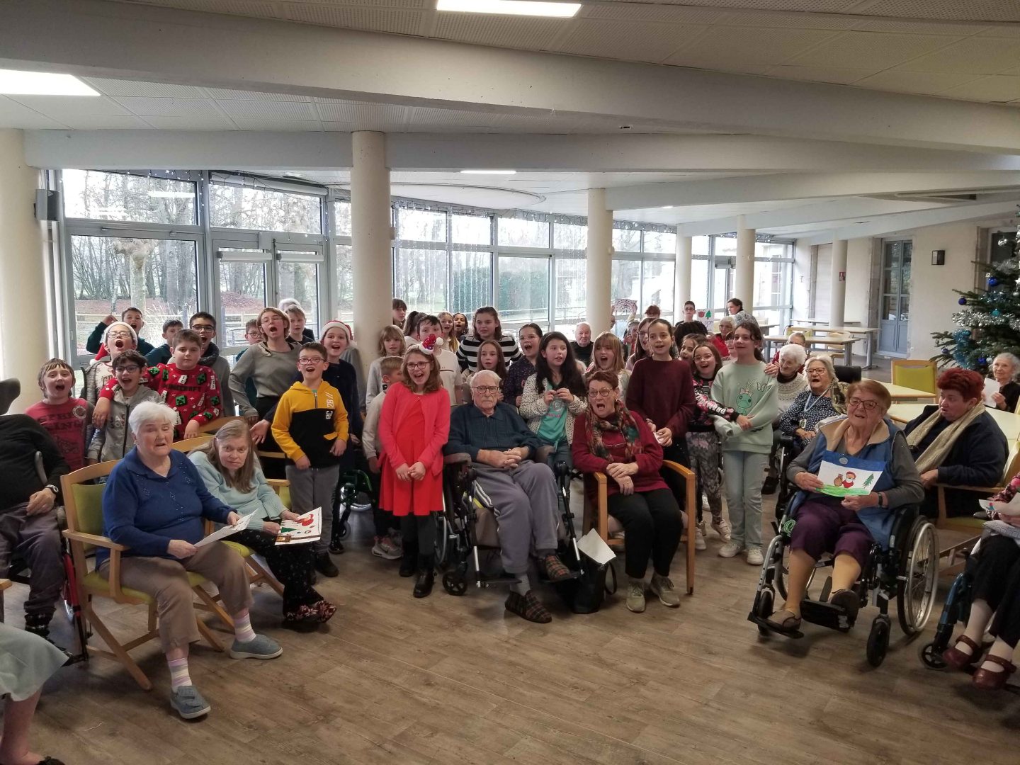 Puis, les enfants, qui avaient préparé des dessins de Noël en classe, ont pu les distribuer aux résidents. Ils en ont profité pour discuter et échanger avec eux. Ce moment a beaucoup plu aux élèves !