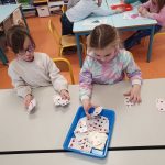 – nous avons travaillé la décomposition du 7. Tout d’abord il fallait associer deux cartes pour que leur total fasse 7 puis nous avons complété la page du 7 de notre cahier des nombres.