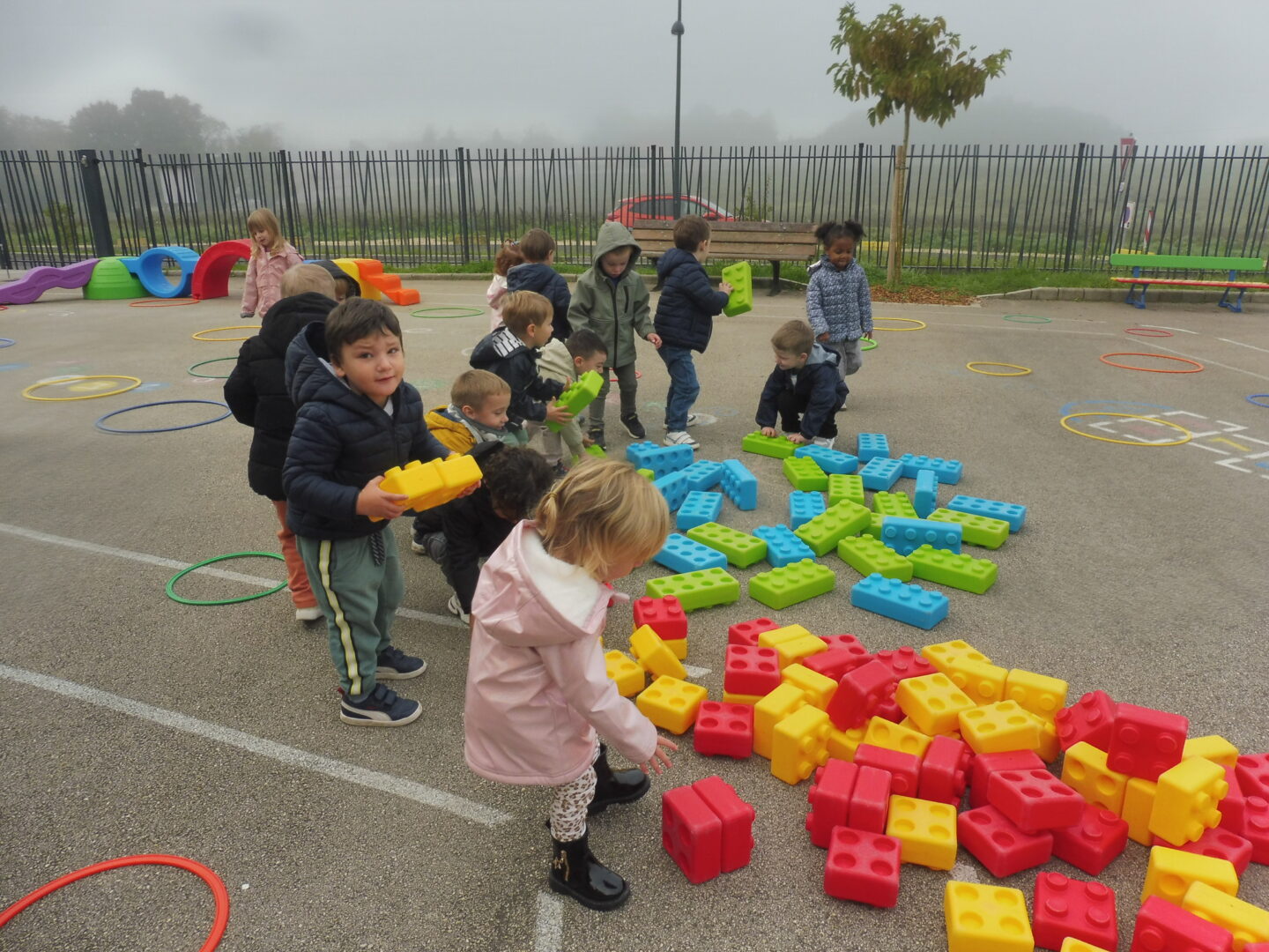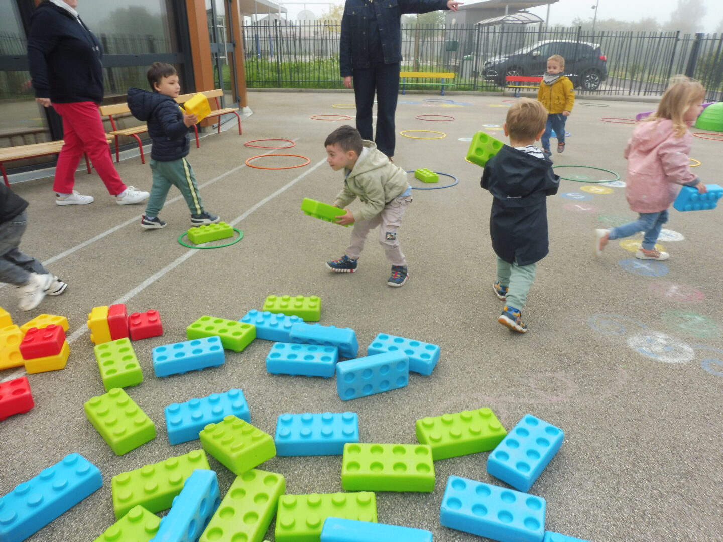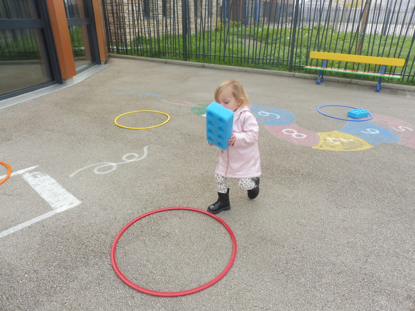 Dans la cour, pendant la séance de sport, la maîtresse nous a demandé de placer une brique dans chaque cerceau.