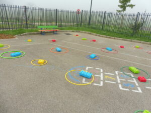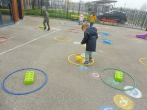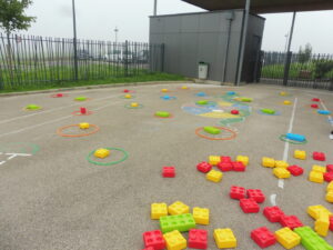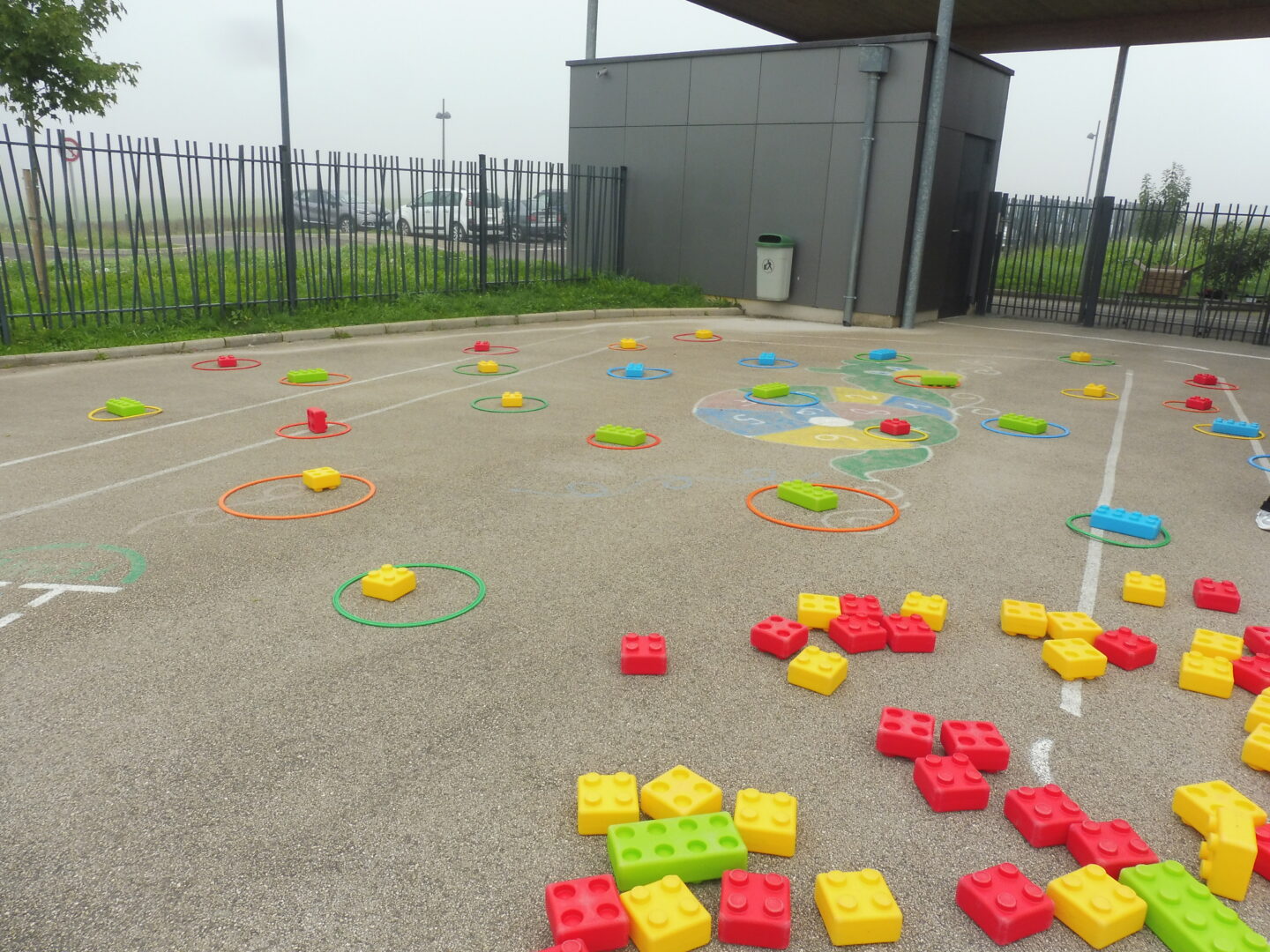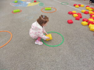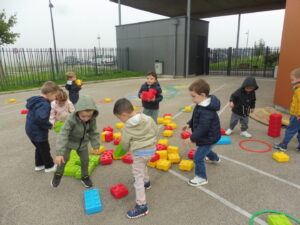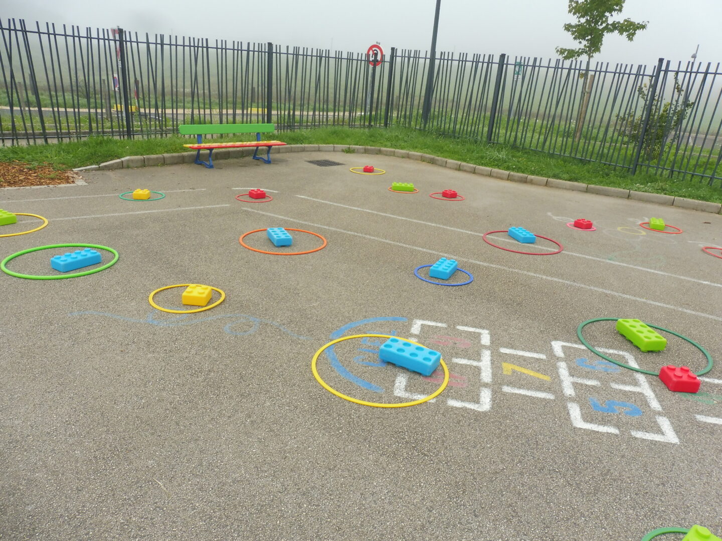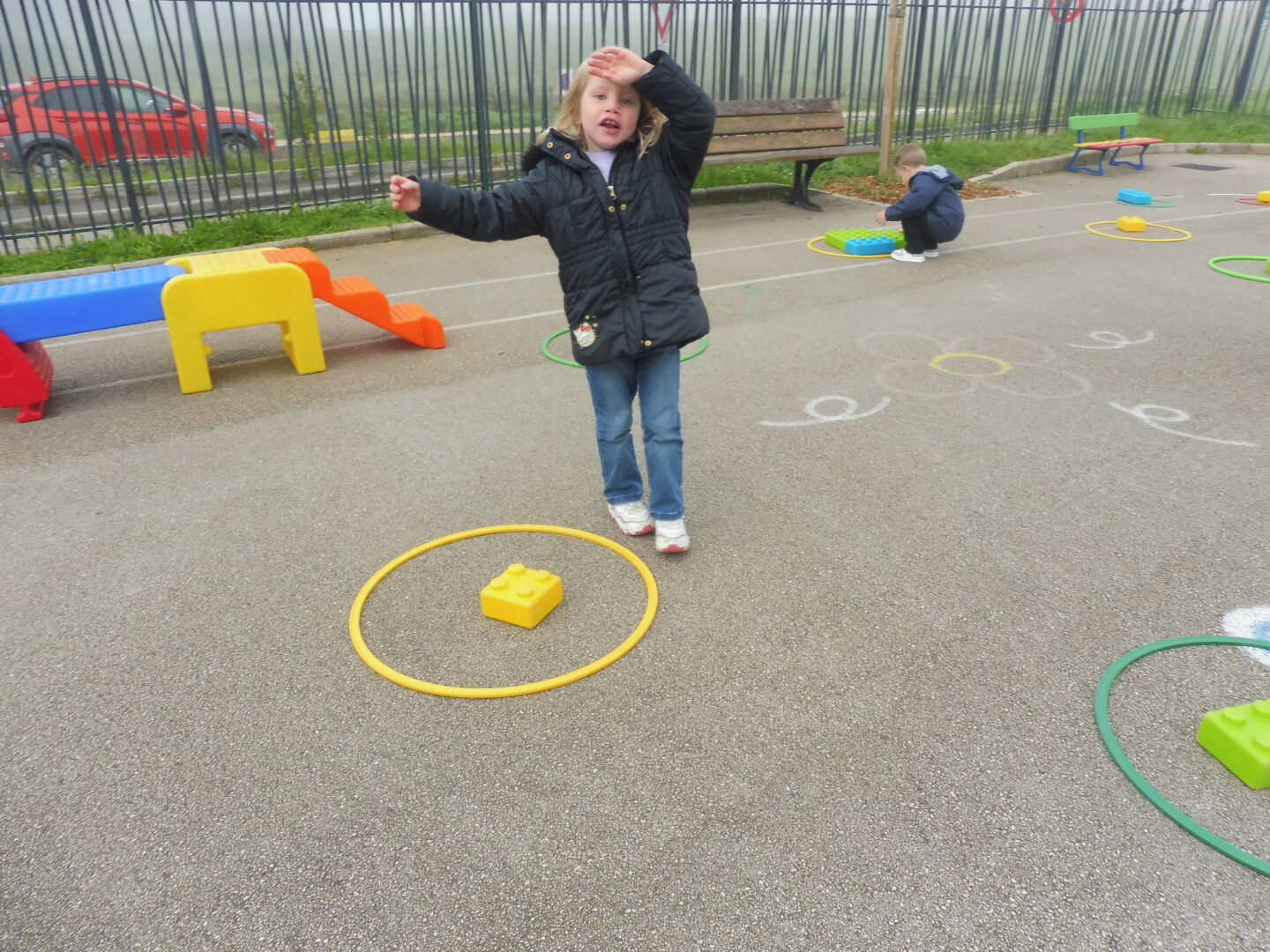 Dans la cour, pendant la séance de sport, la maîtresse nous a demandé de placer une brique dans chaque cerceau.