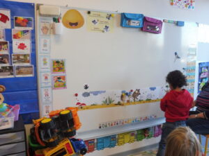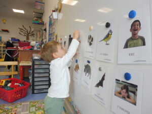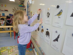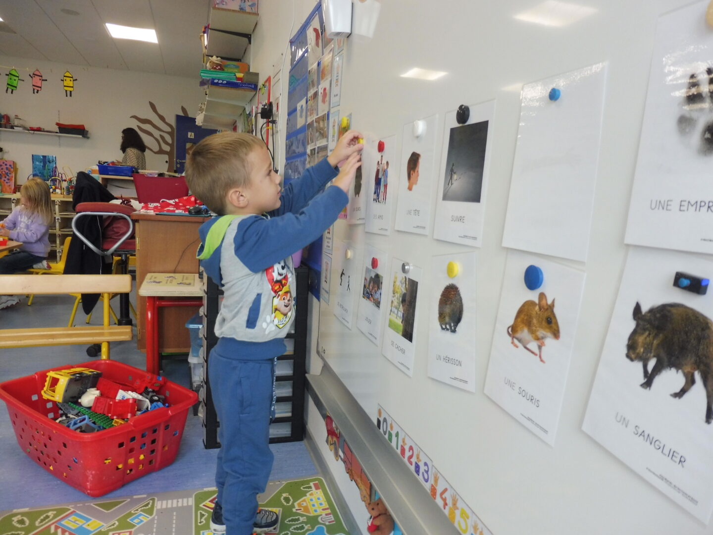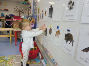 En langage oral, nous avons continué notre travail autour de l’album « Sur les traces de souris ». Pour vérifier que nous connaissons bien les mots de vocabulaire de l’histoire, nous avons fait un jeu avec la maîtresse. La maîtresse nous dit un mot, nous devons retourner l’image correspondante au mot.