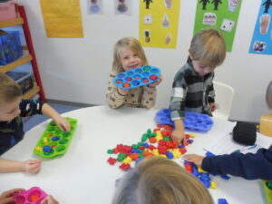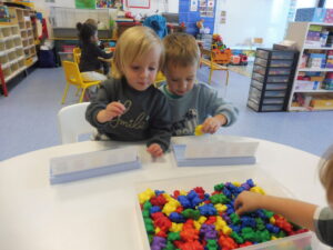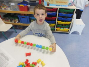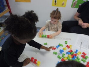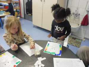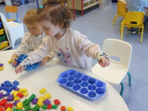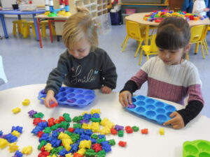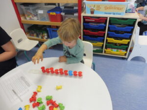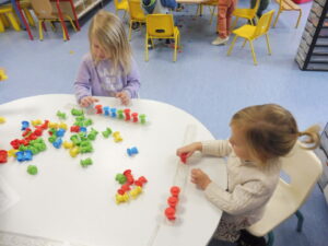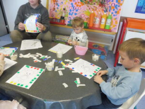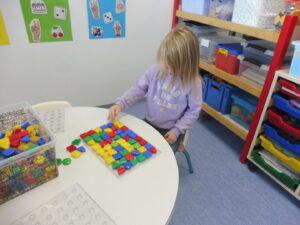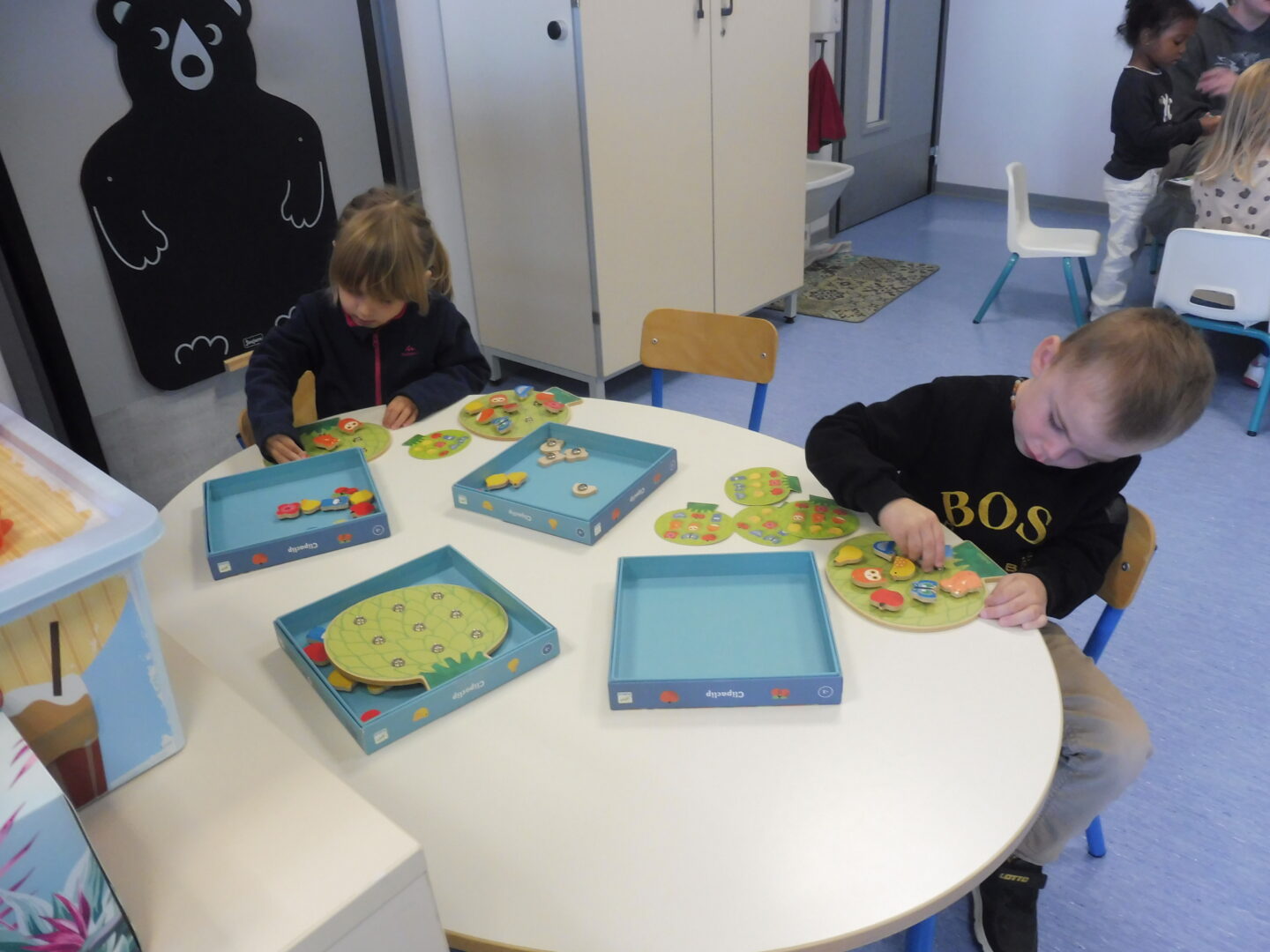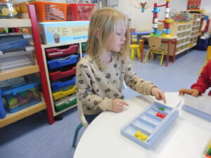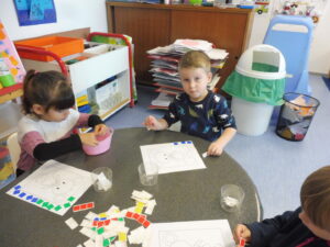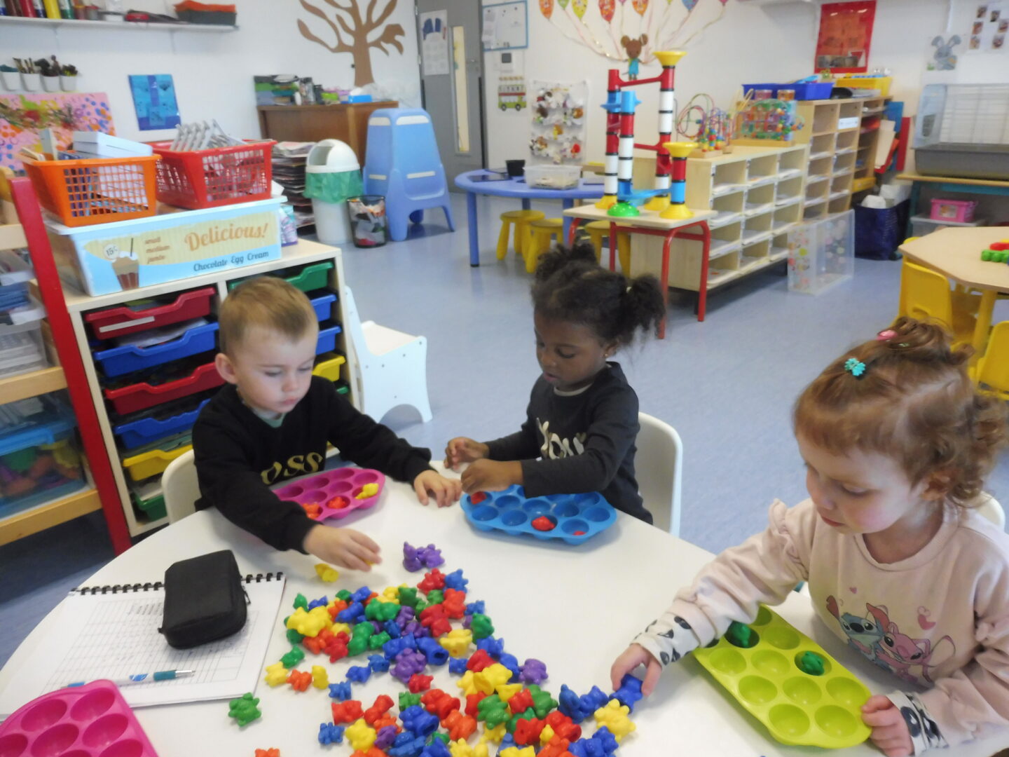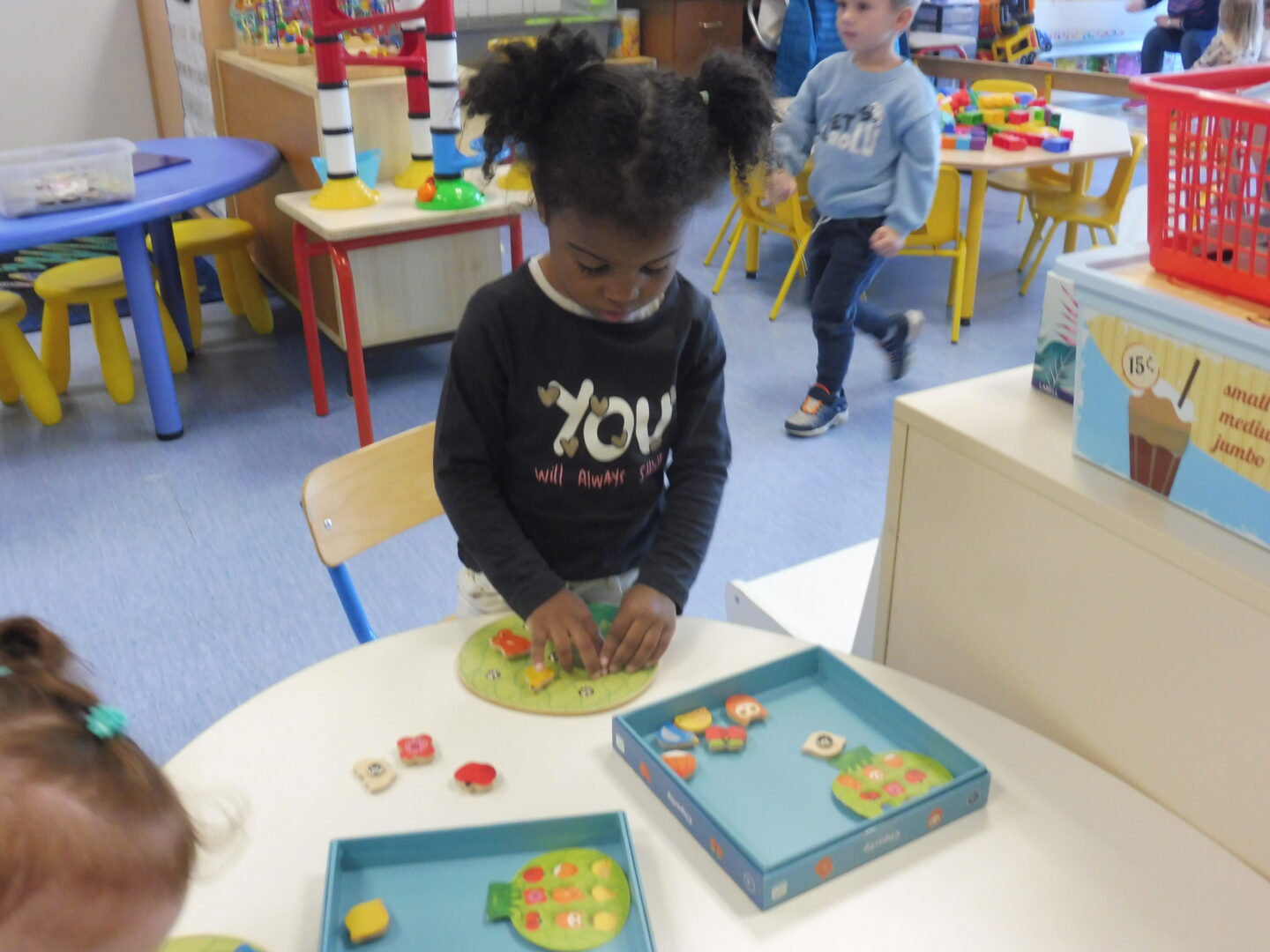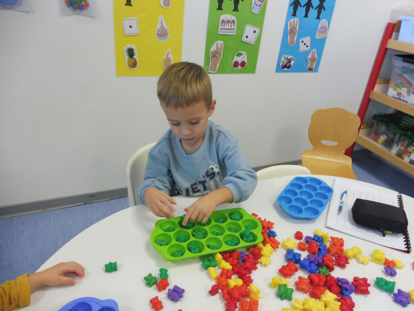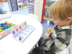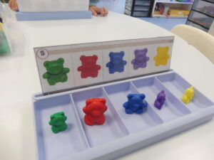 Nous avons également associé des couleurs en jouant avec les boîtes à compter. Dans la case, nous devons placer les ours de même couleur que sur la fiche consigne.