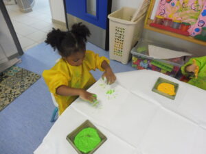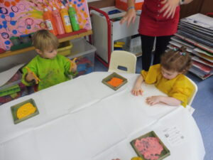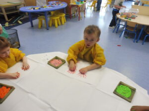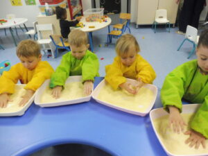 En graphisme, nous avons repris les différentes actions de la comptine des deux mains : taper, frotter, poser et gratter. D’abord on s’est entraîné dans la semoule puis ensuite on a refait avec de la peinture sur une feuille.