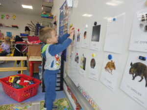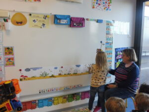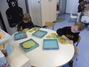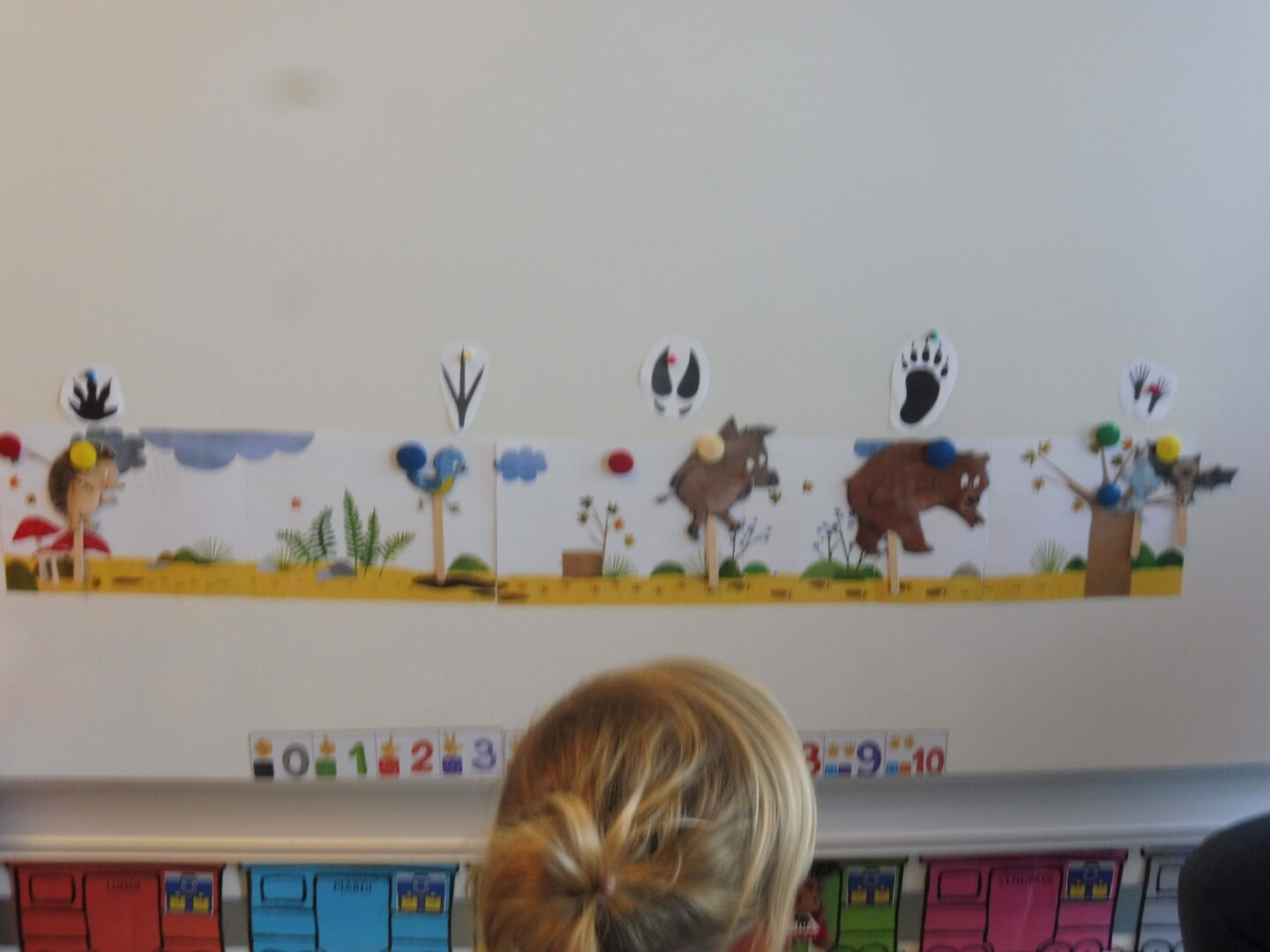 Ensuite, nous avons raconté l’histoire avec des marionnettes. Nous avons replacé les animaux dans l’ordre chronologique de l’histoire et nous avons aussi associé l’animal à son empreinte.
