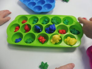 Ensuite, en classe, nous avons placé un ours dans chaque trou du bac à glaçons.