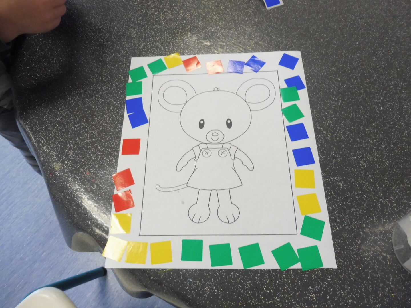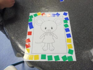En motricité fine, la maîtresse nous a demandé de coller des gommettes autour de Kimi.
