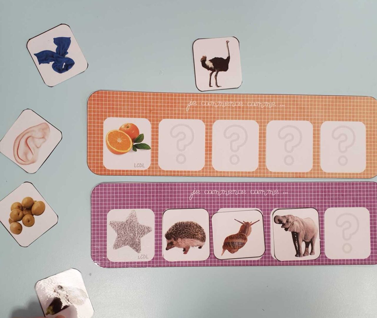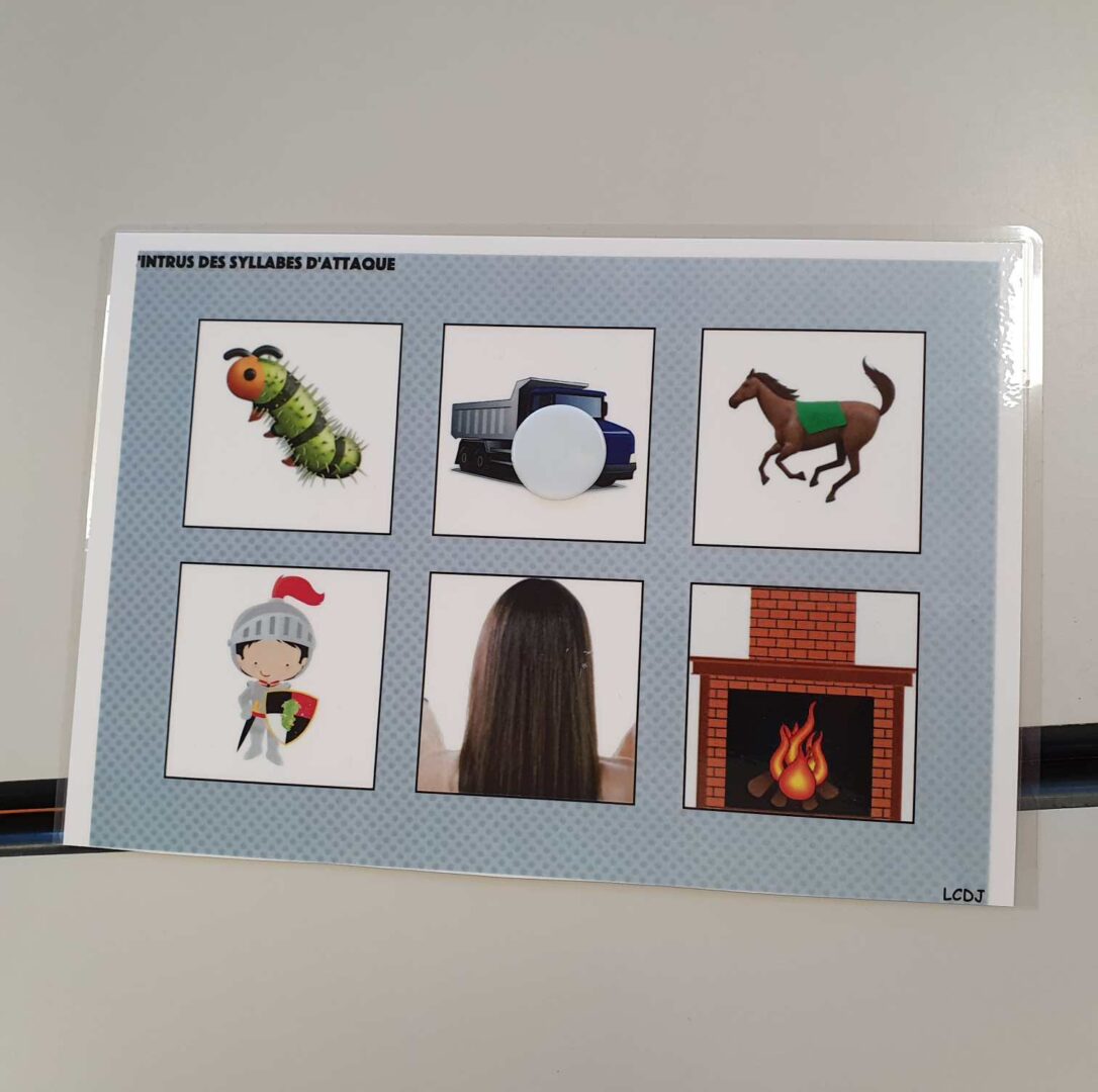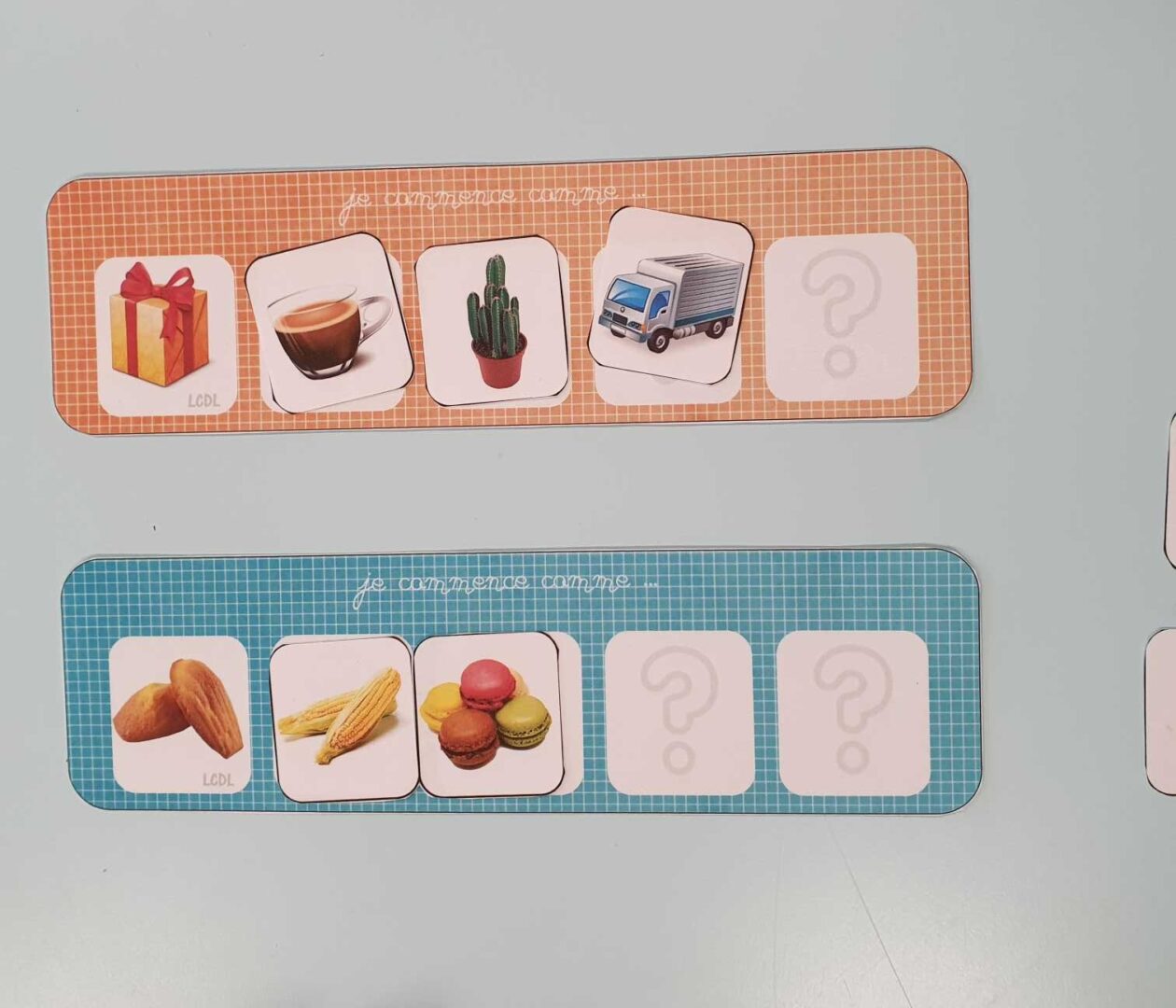 Nous avons aussi joué à différents jeux : placer nos étiquettes à côté du mot avec la même syllabe d’attaque, placer un jeton sur l’intrus, identifier un mot commençant par une syllabe imposée…