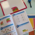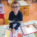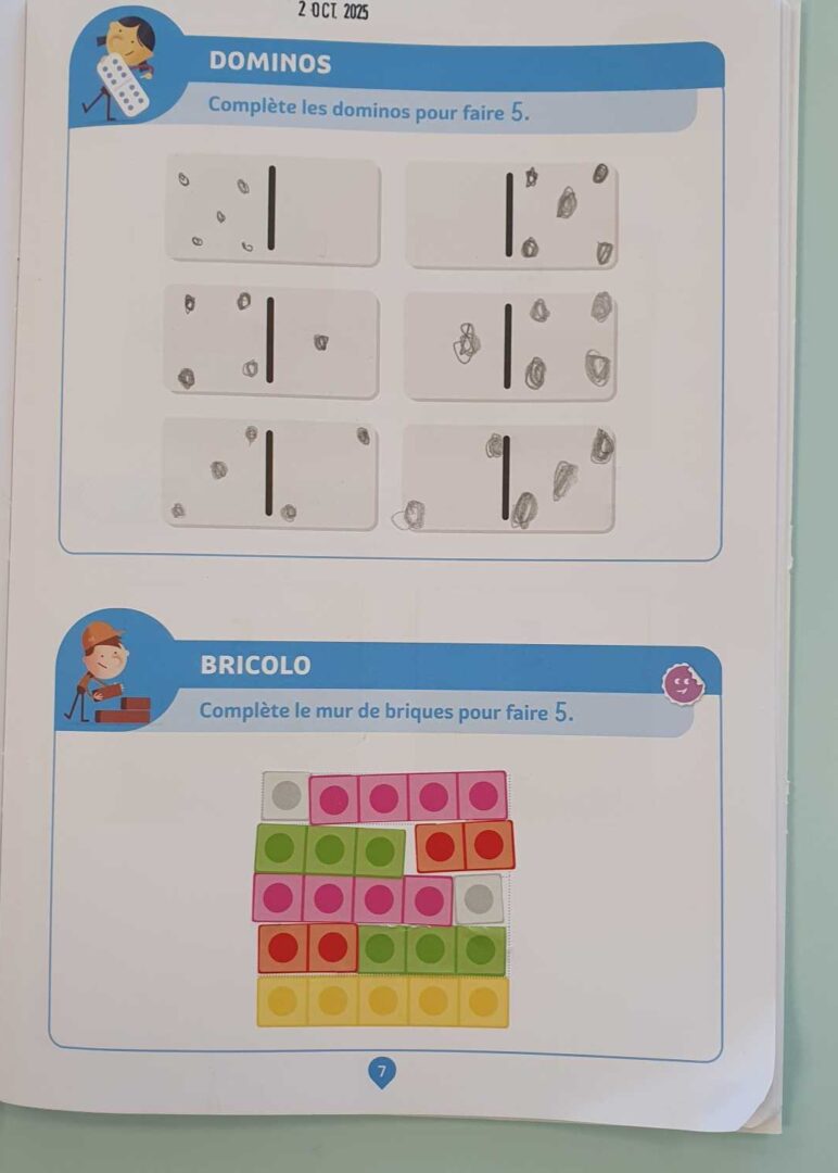Nous avons finalisé notre travail sur la décomposition du 5. Nous avons construit 6 tours différentes de 5 cubes en 2 couleurs puis nous avons complété notre cahier des nombres (dessiner tous les dominos du 5 possible et construire le mur du 5). Normalement maintenant nous pouvons répondre vite que 4 et 1 ça fait 5, 2 et 3 ça fait 5.