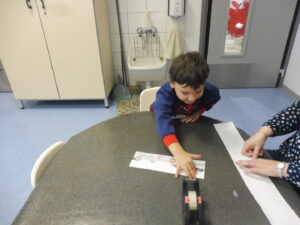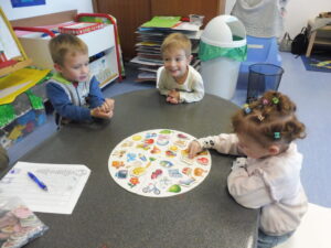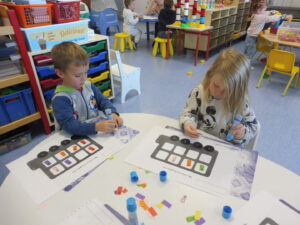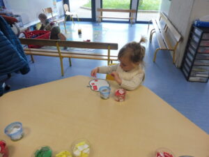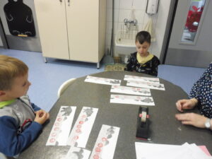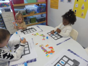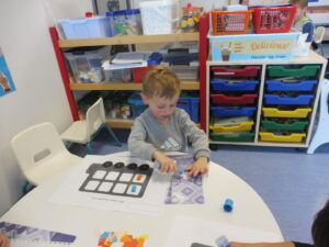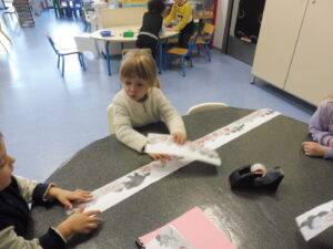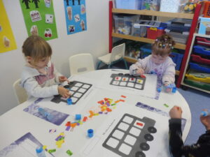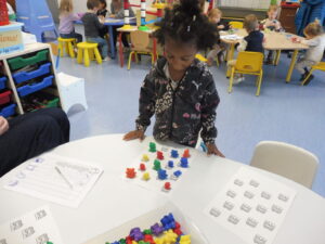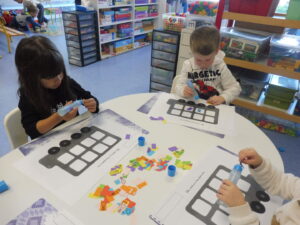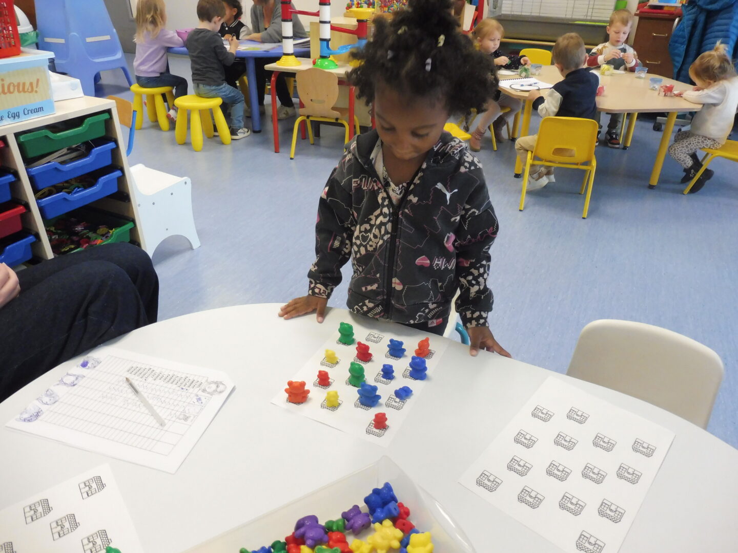 En numération, pour voir si nous savions faire une distribution, la maîtresse nous a demandé de placer un ours sur chaque maison.