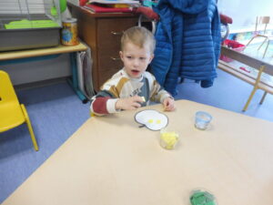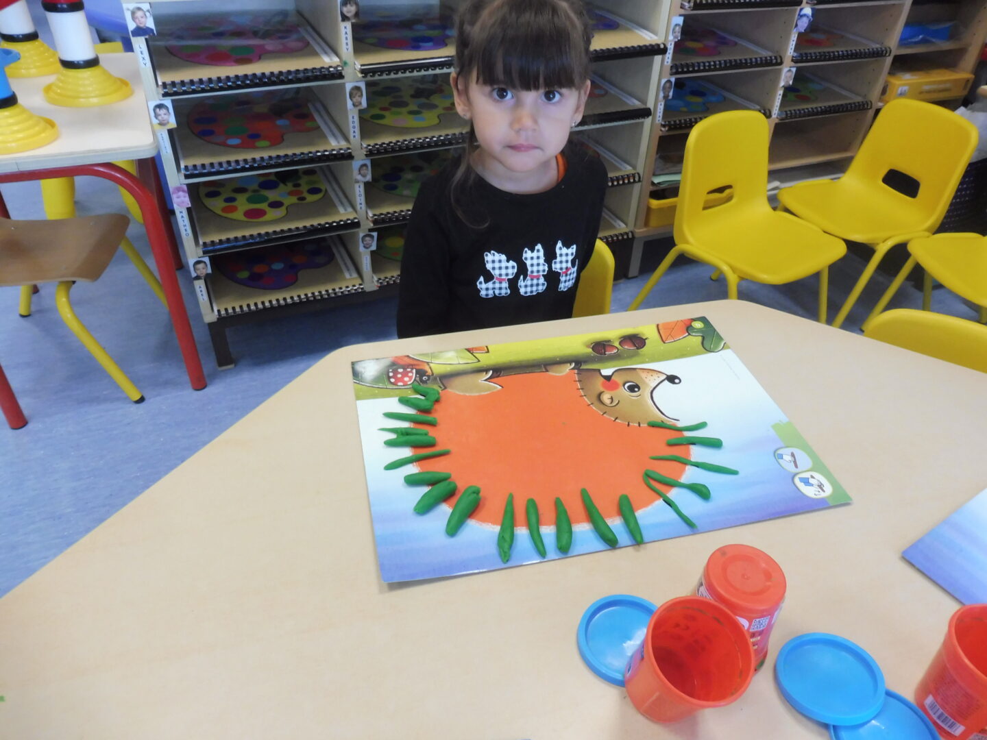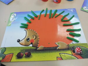 Puis avec la pâte à modeler, nous avons fait des colombins pour représenter les piquants du hérisson.