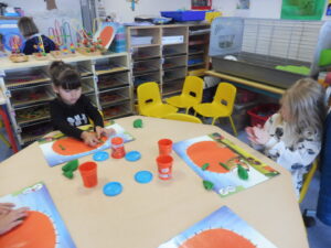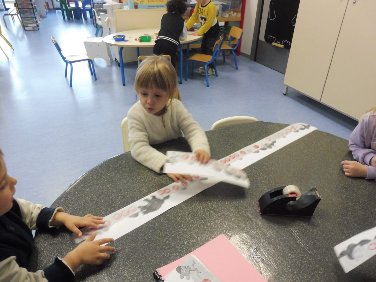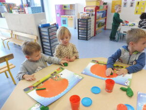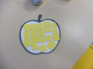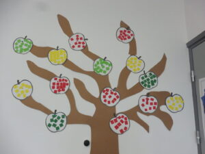 En arts visuels, nous avons décoré des pommes avec des petits carrés de mousse. Puis nous avons accroché les pommes sur l’arbre de la classe.
