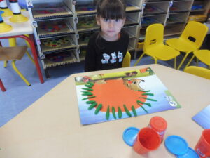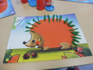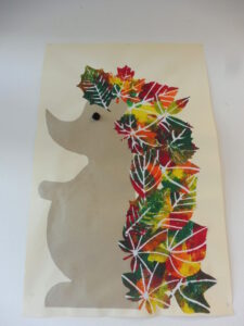 Comme dans l’histoire il y a un hérisson, nous avons fait un hérisson avec des feuilles d’automne.
