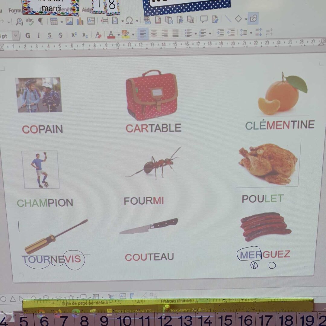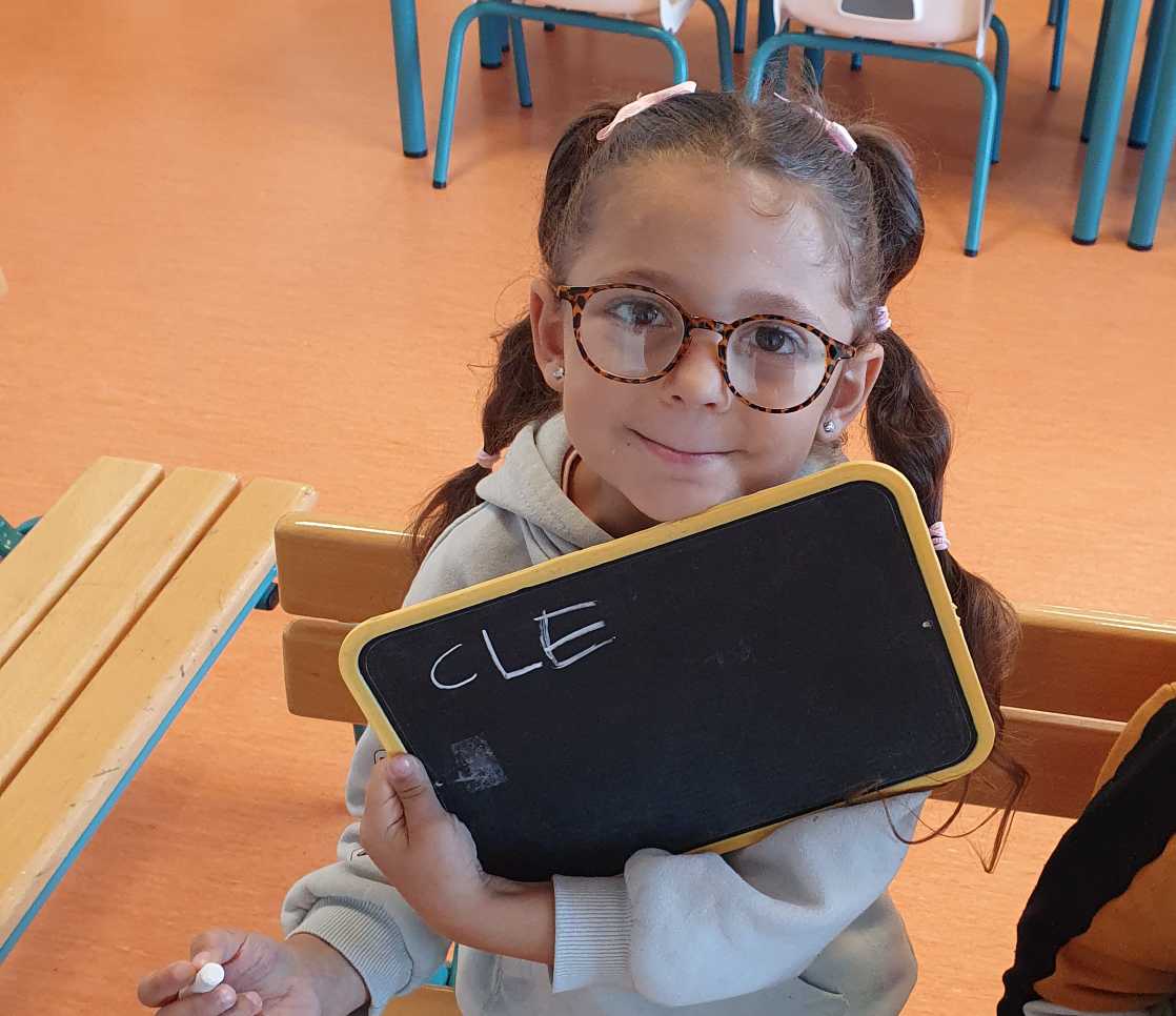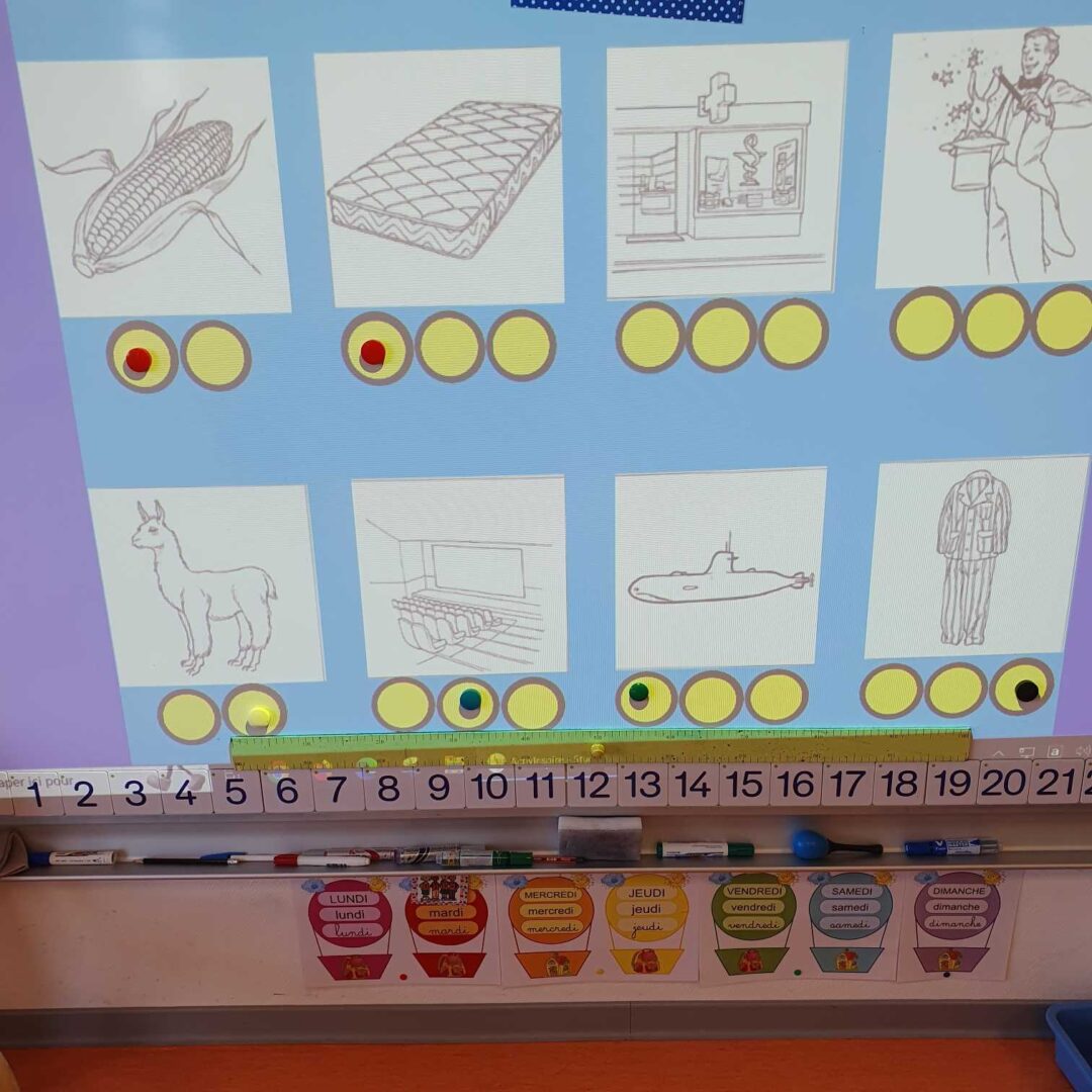 Nous avons aussi écrit des mots d’une syllabe à l’aide d’autres mots. Il fallait chercher parmi tous les mots au tableau celui contenant la syllabe demandée puis l’écrire sur son ardoise (clé de clémentine, table de cartable, pain de copain, vis de tournevis…)