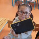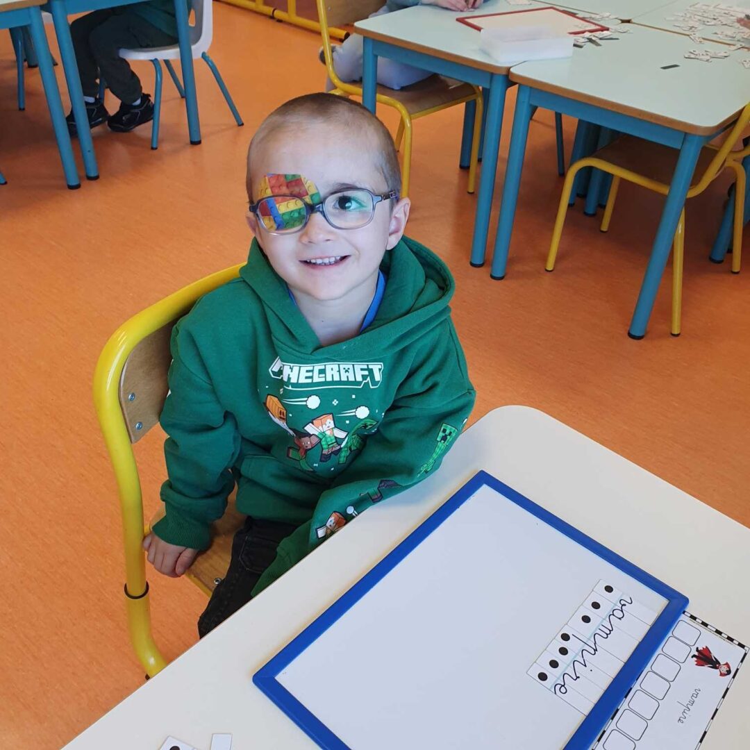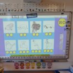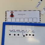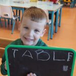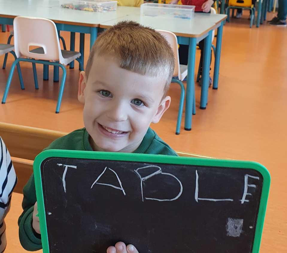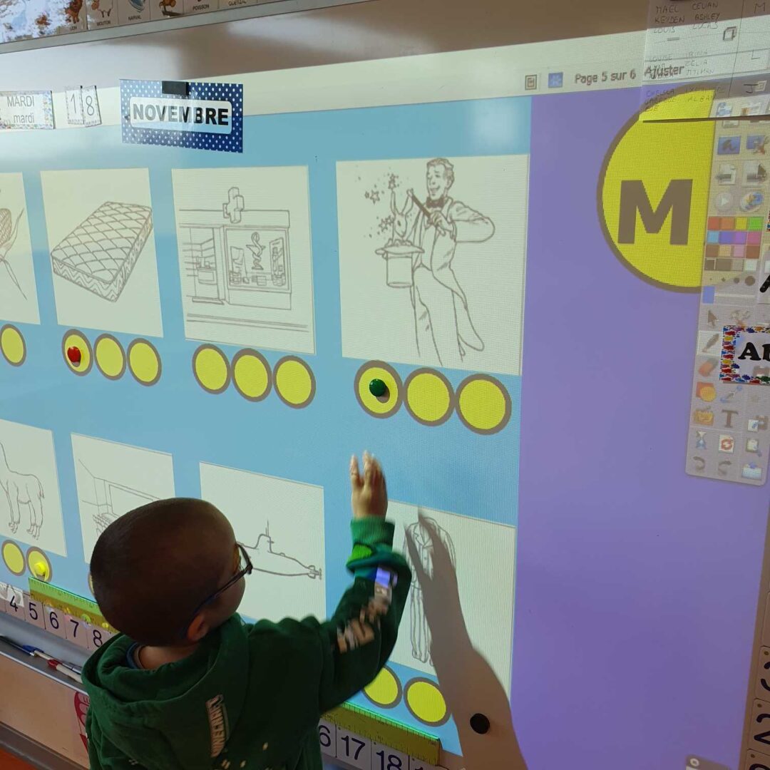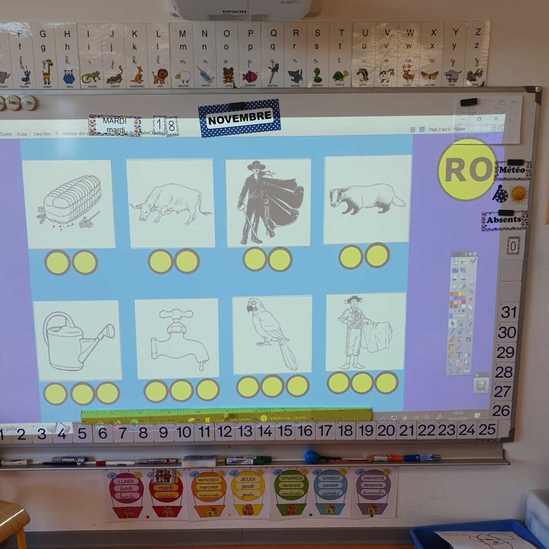 Nous avons aussi écrit des mots d’une syllabe à l’aide d’autres mots. Il fallait chercher parmi tous les mots au tableau celui contenant la syllabe demandée puis l’écrire sur son ardoise (clé de clémentine, table de cartable, pain de copain, vis de tournevis…)