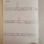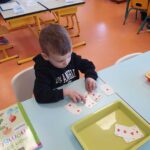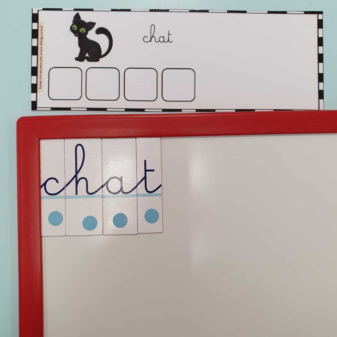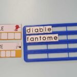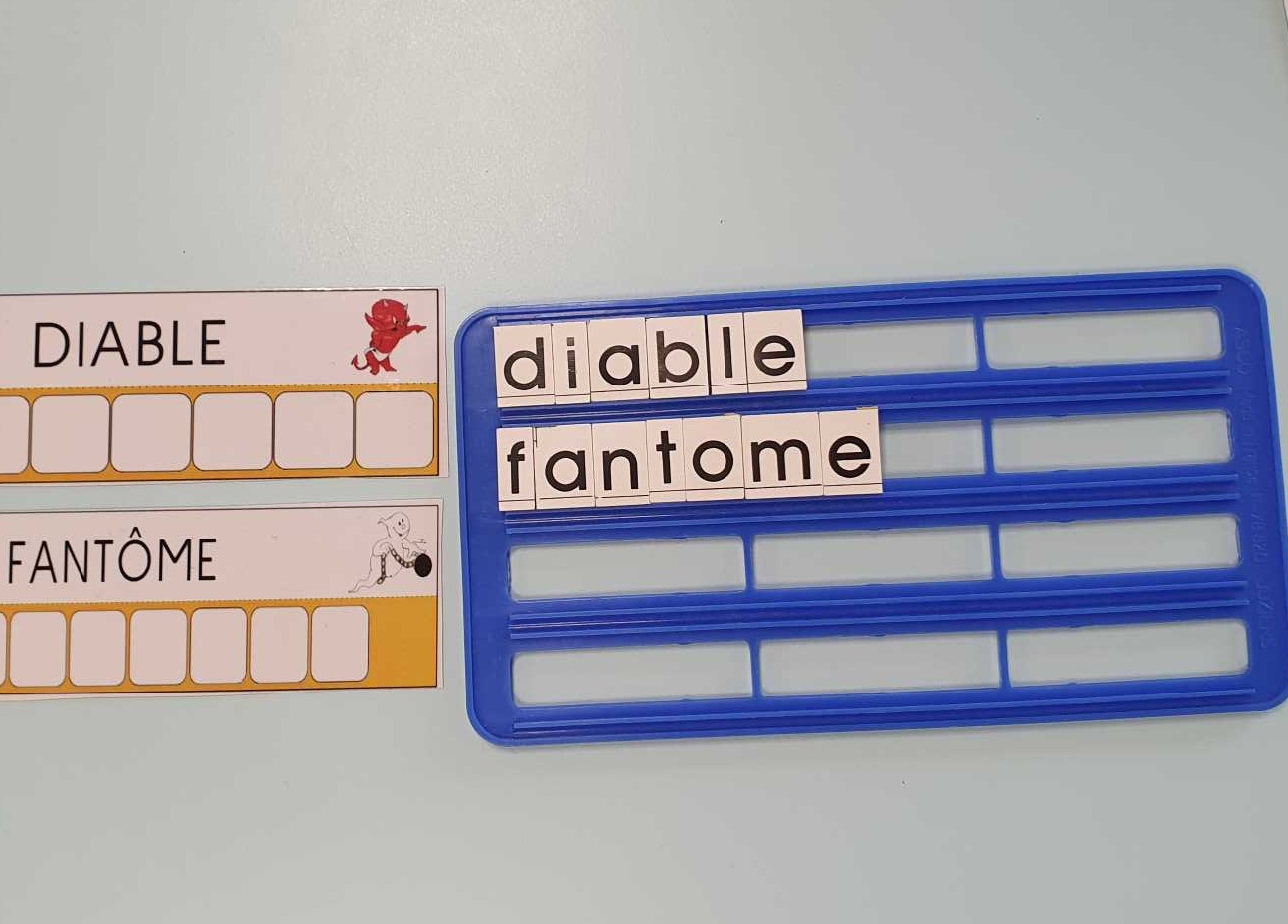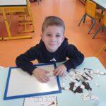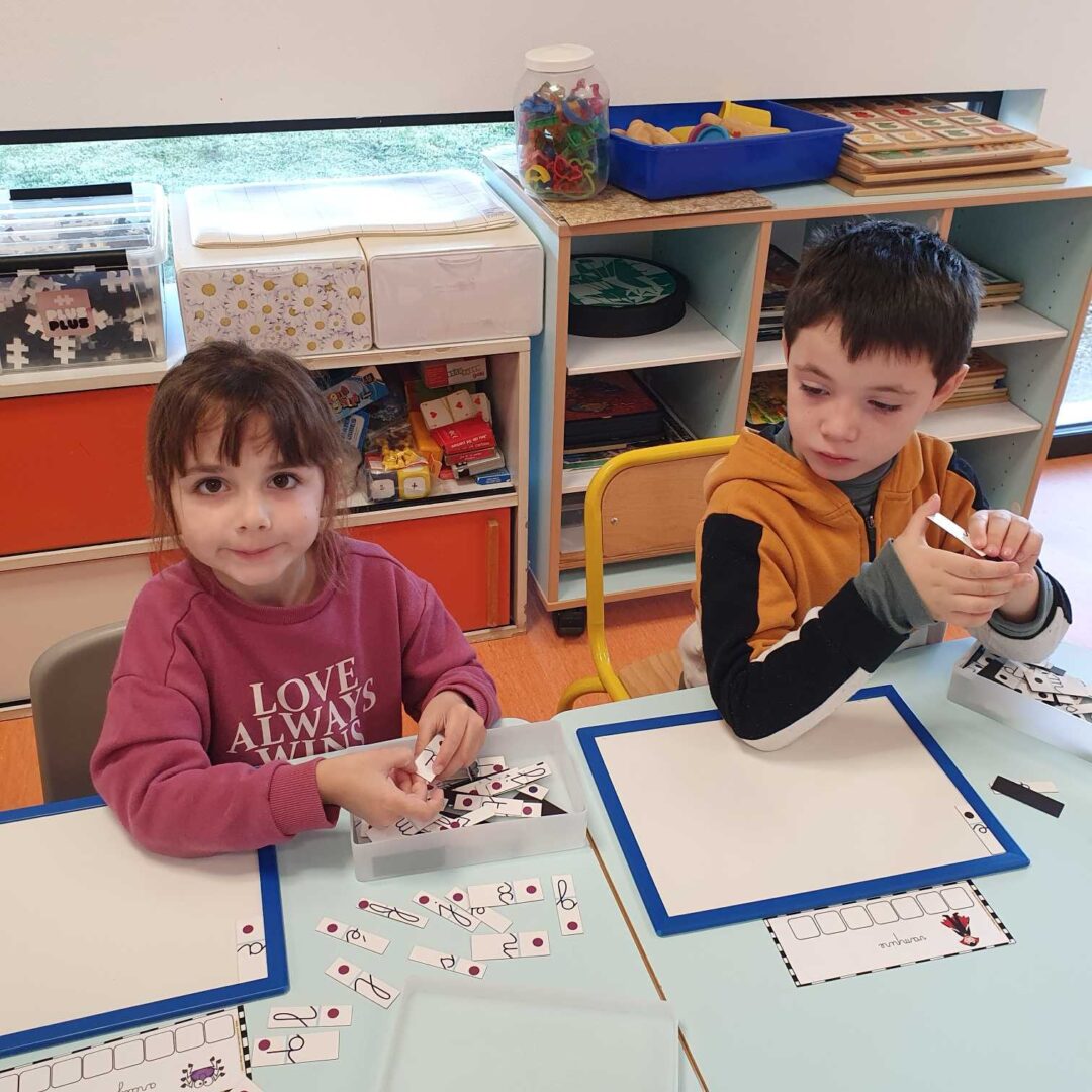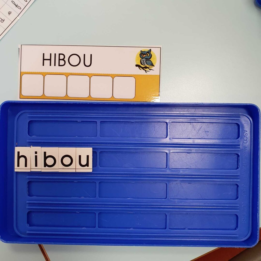 Nous continuons de jouer avec nos lettres mobiles. Pour la première fois nous avions des lettres cursives pour reproduire notre modèle qui était aussi en écriture cursive mais ce n’est pas si facile car comme toutes les lettres sont attachées entre elles c’est difficile de les identifier.