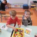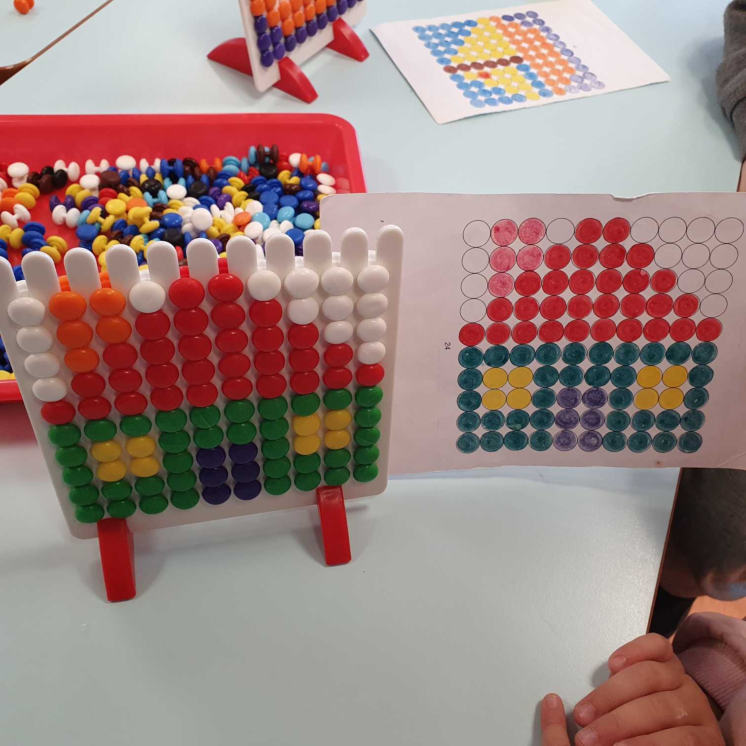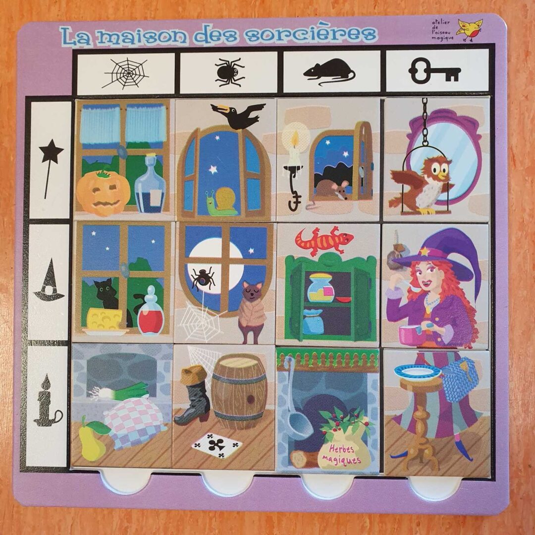 Nous avons aussi joué avec notre jeu : la maison des sorcières. Le modèle à reproduire était éclaté. Avouons que cet atelier a été un échec car il faut bien regarder tous les détails pour pouvoir reproduire correctement le modèle et cela demandait trop d’attention !