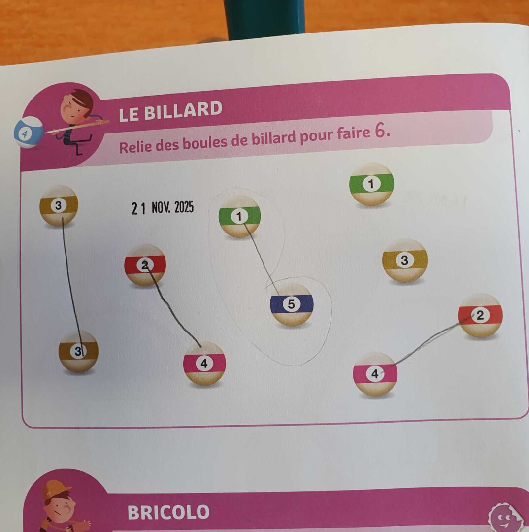 Nous avons aussi terminé notre travail sur le 6 en finalisant le billard et le bricolo sur notre cahier des nombres.