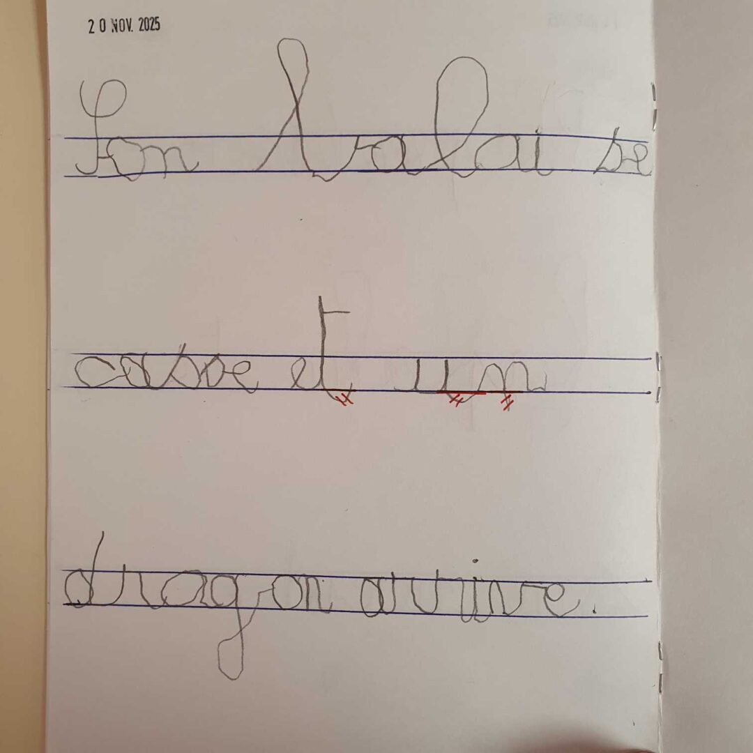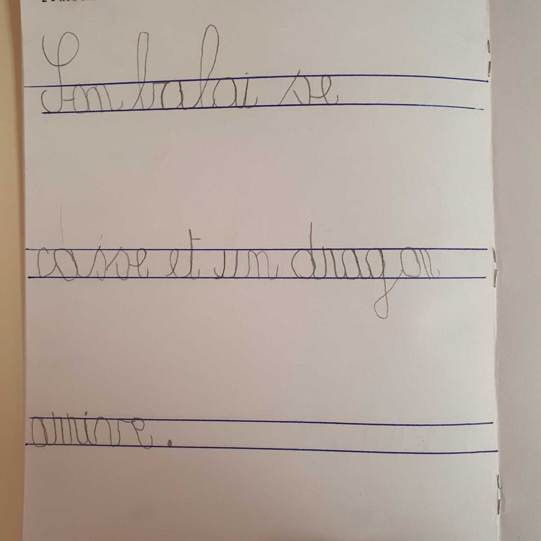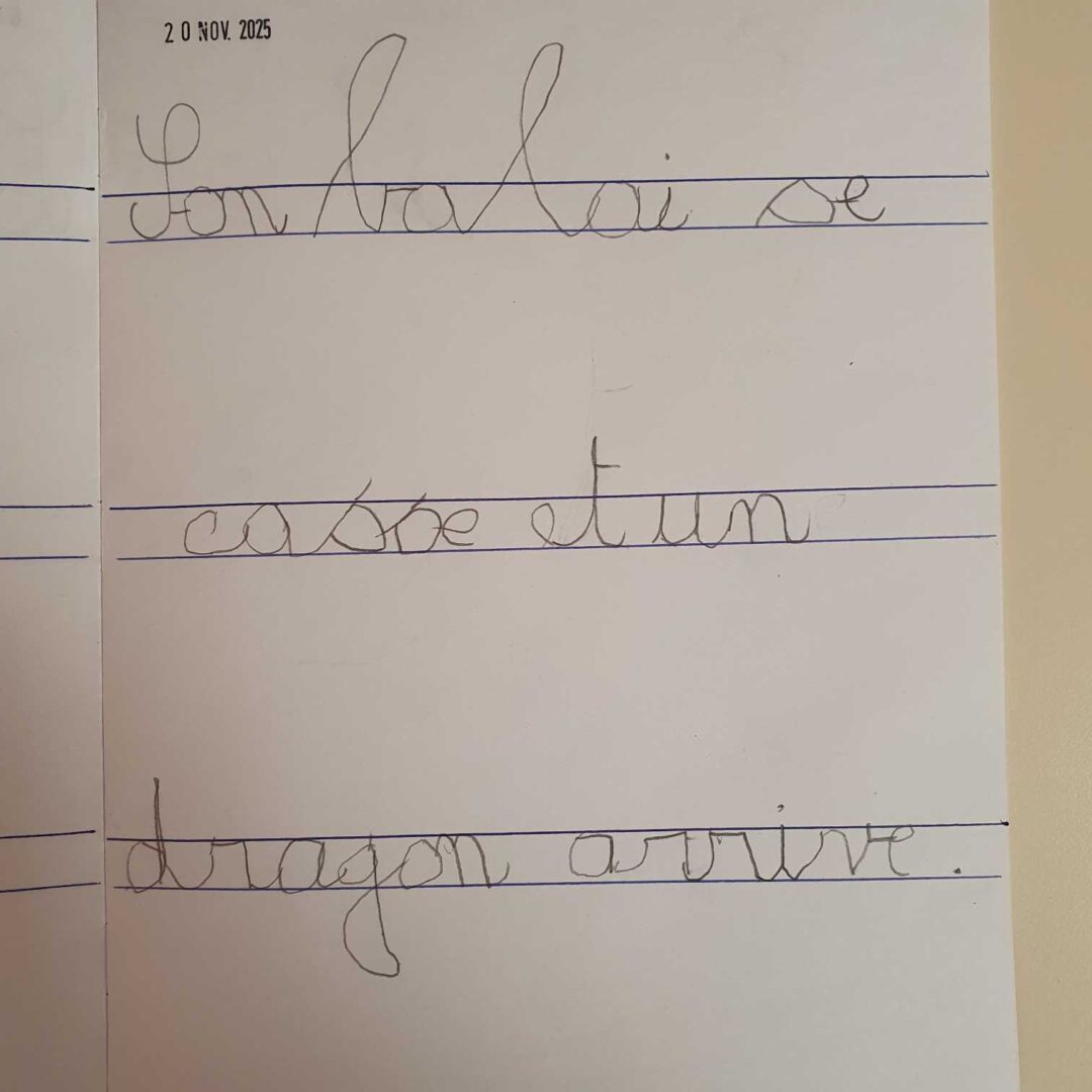 Nous avons aussi reproduit des mots écrits en capitales avec nos lettres scriptes, et oui nous travaillons encore sur la correspondance entre les différentes graphies, et il y a même certains élèves qui ont encore besoin de l’alphabet pour faire cette correspondance.