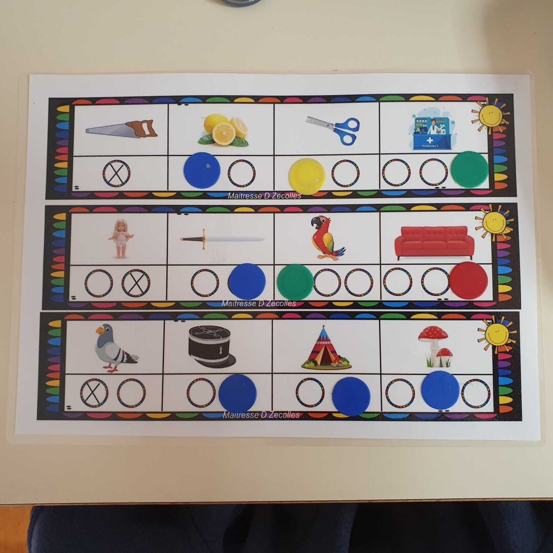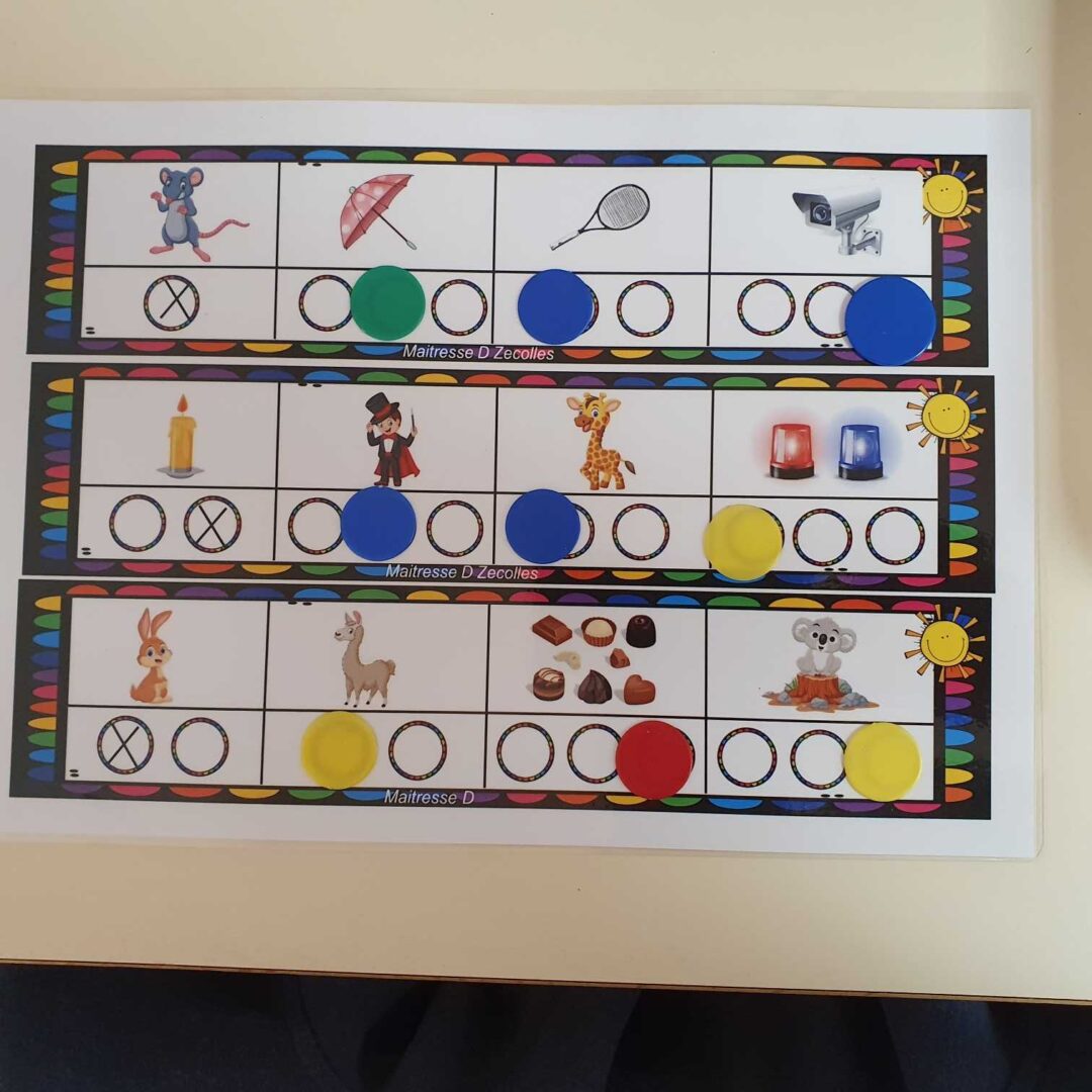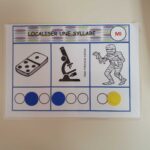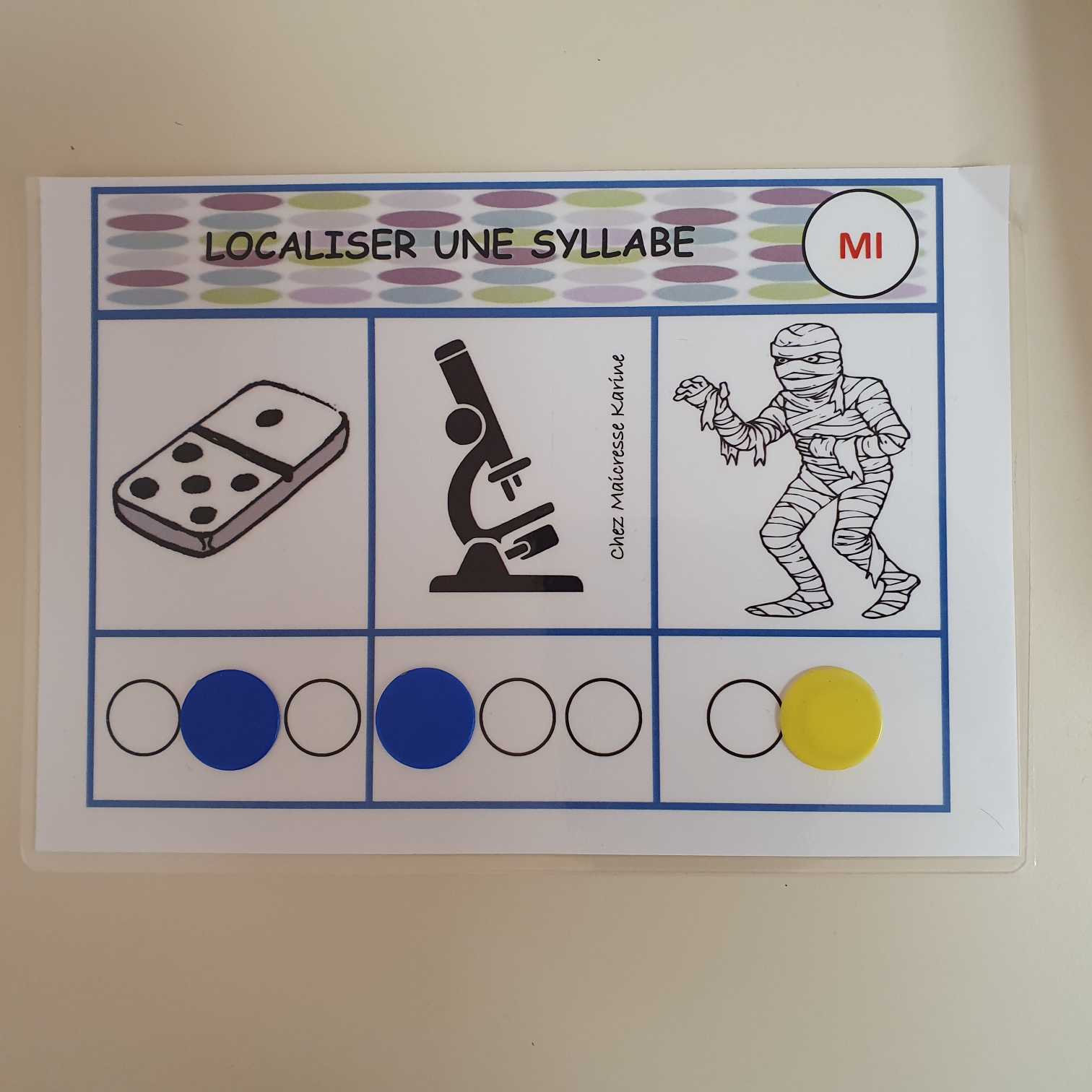 Nous avons travaillé sur la localisation des syllabes. Il faut déjà bien mémoriser la syllabe recherchée puis la placer dans le mot en faisant une croix dans la syllabe correspondante. Nous avons déjà travaillé collectivement au tableau pour établir comment il fallait faire puis individuellement sur nos feuilles.