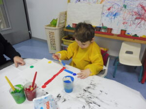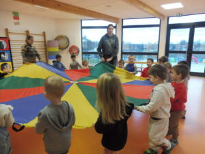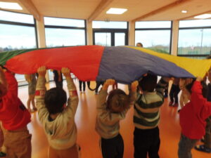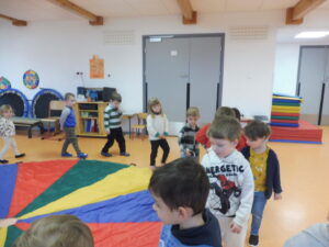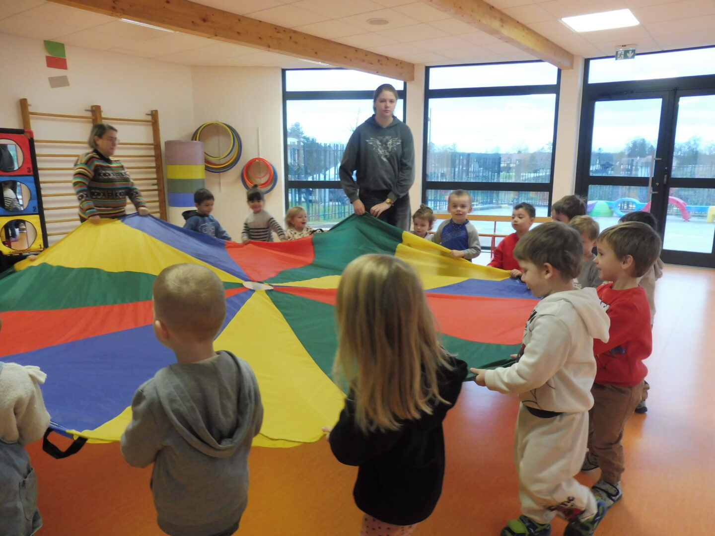 Nous nous sommes tous mis autour et nous avons levé le parachute, nous l’avons baissé. Puis nous avons fait des vagues, tourné avec le parachute et nous nous sommes cachés dessous. Pour finir, nous avons tourné autour du parachute et nous avons fait la ronde avec de la musique.