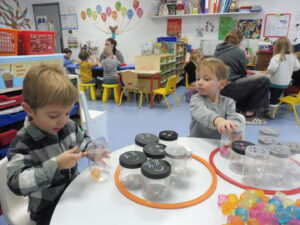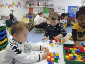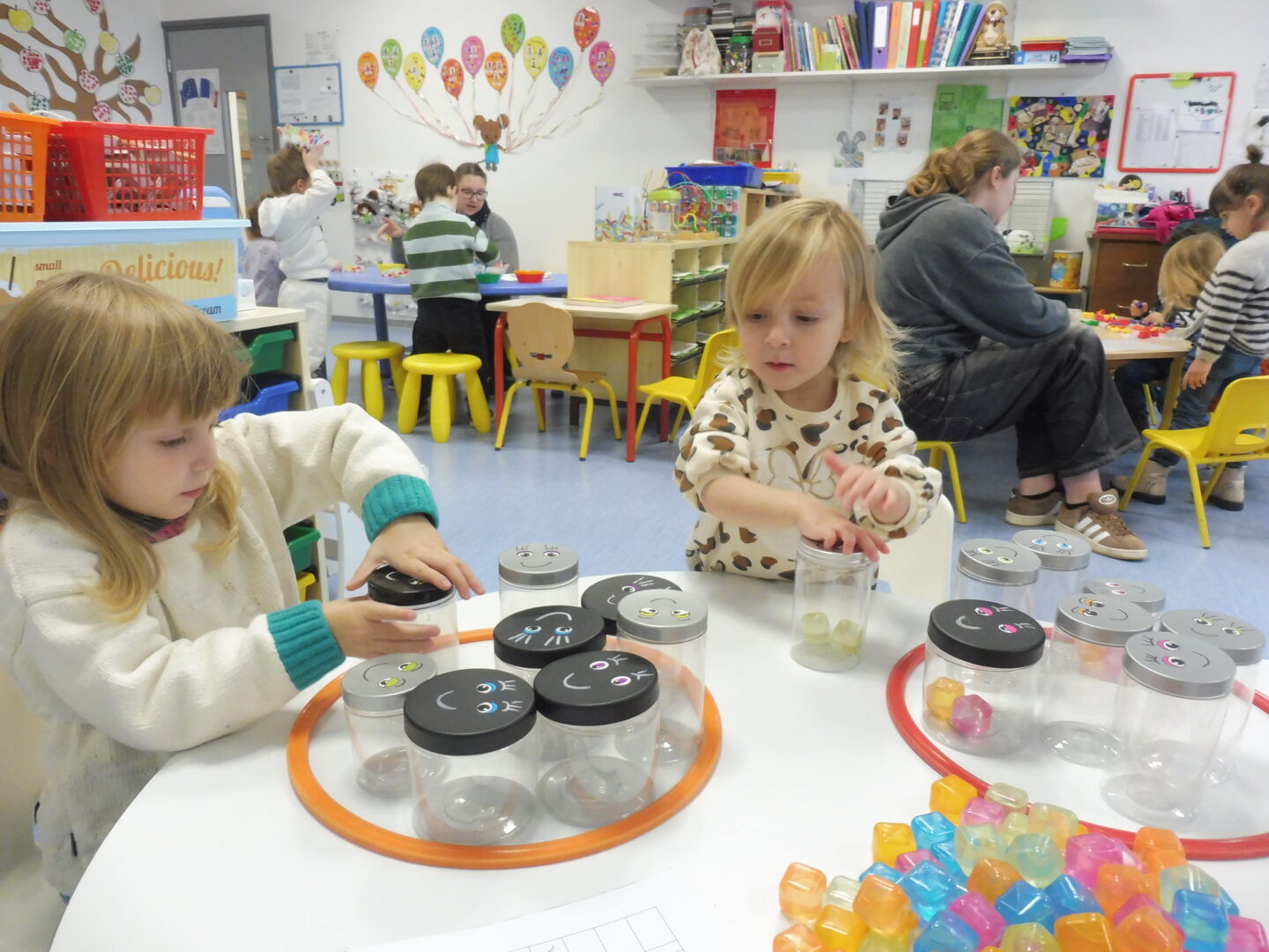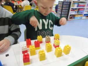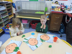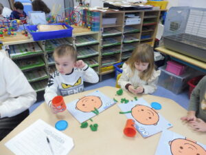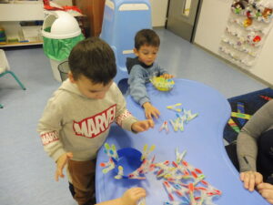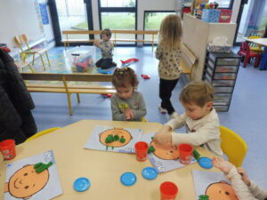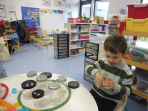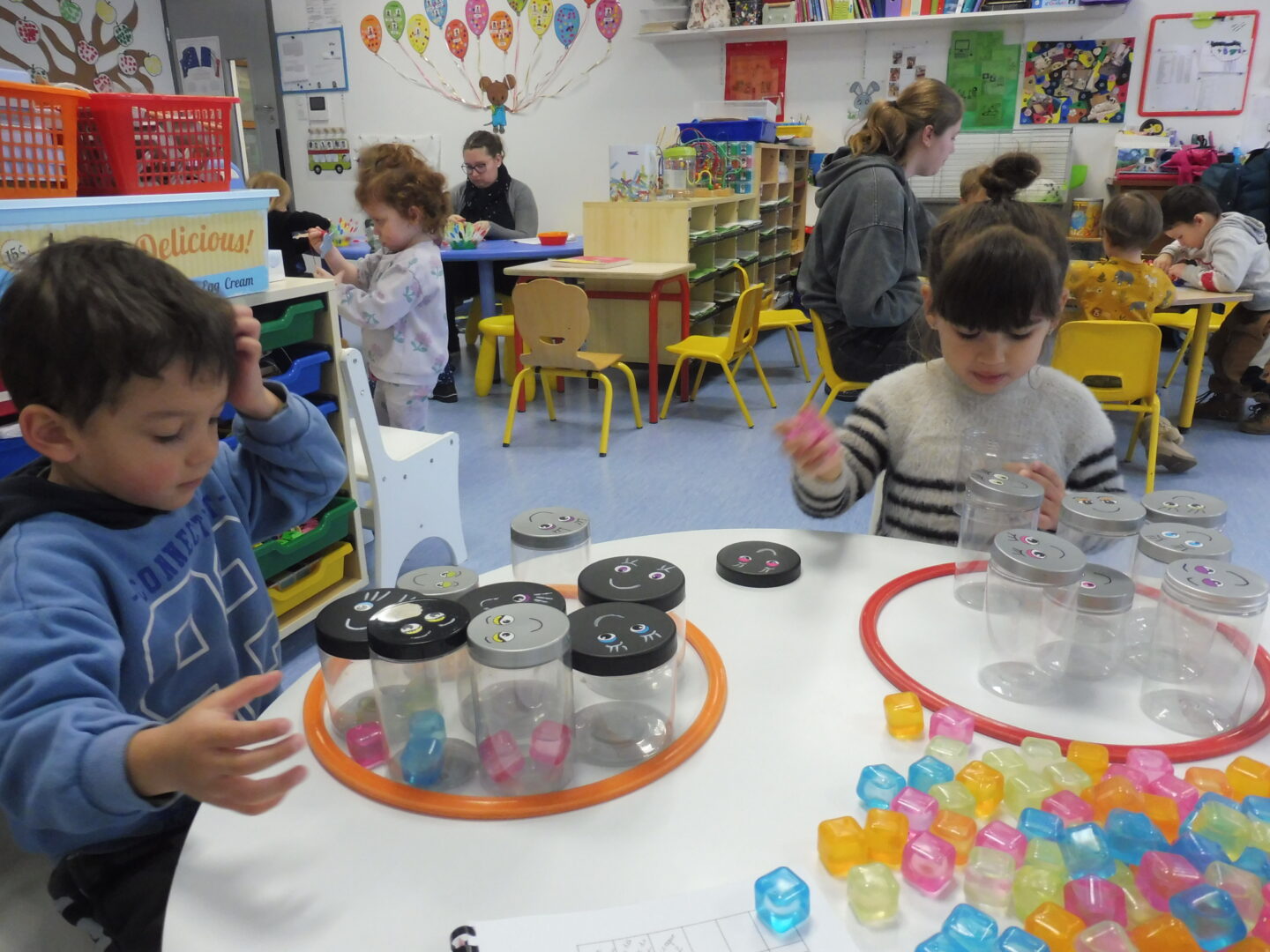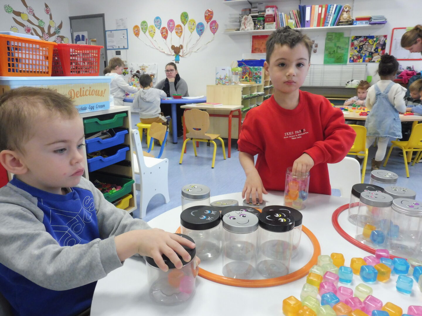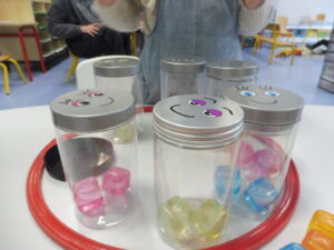 Nous avons joué à Croque le 2 : nous devons mettre 2 bonbons dans chaque boîte bonhomme.