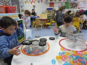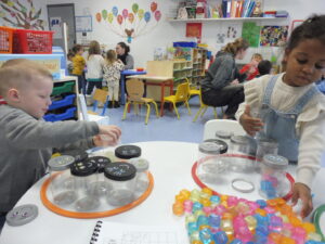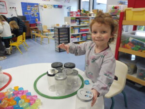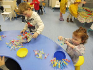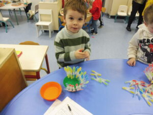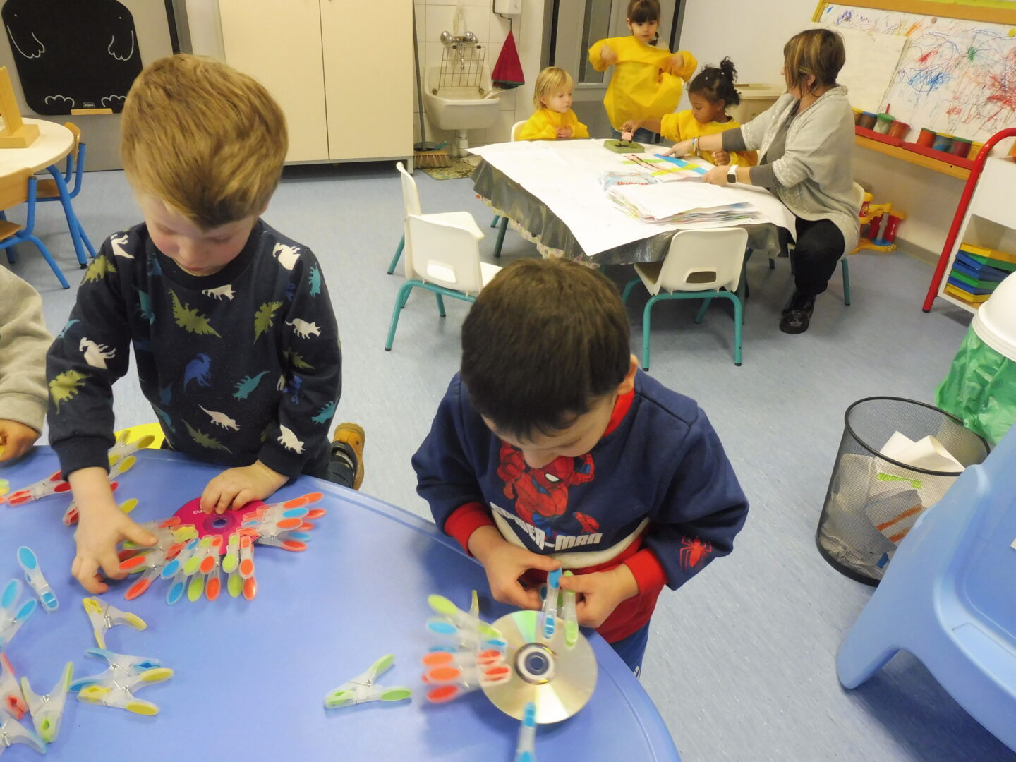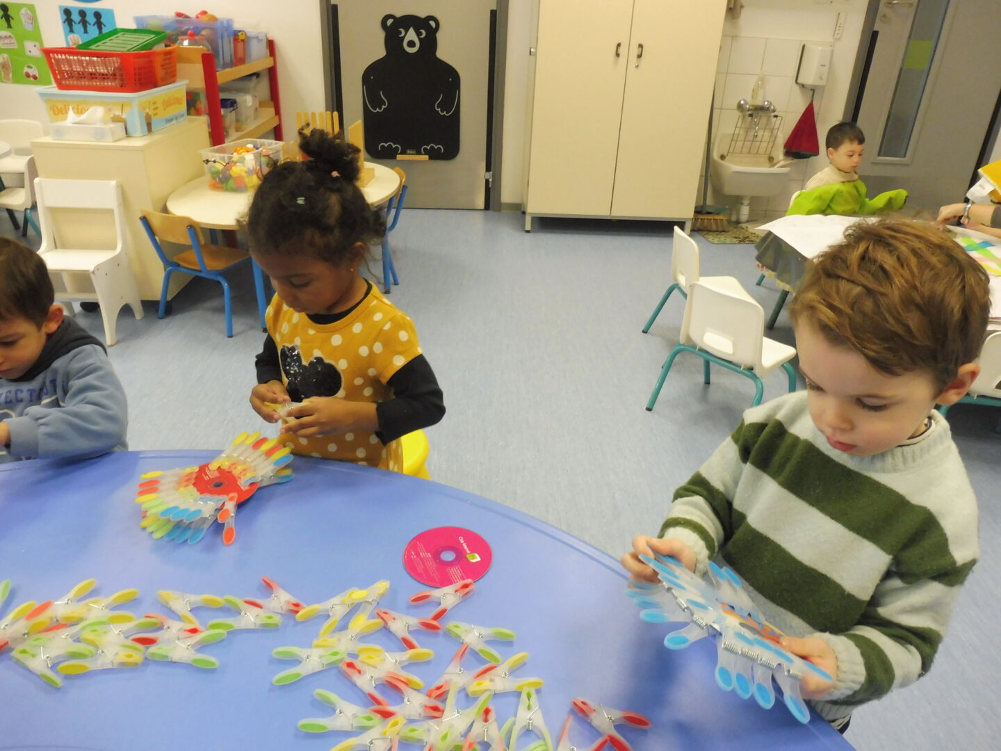 Nous avons aussi appris à utiliser les pinces à linges (cela nous servira pour bien tenir notre crayon). Nous avons accroché des pinces autour de l’assiette et autour du CD.