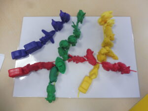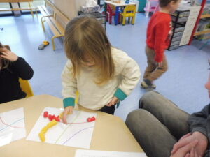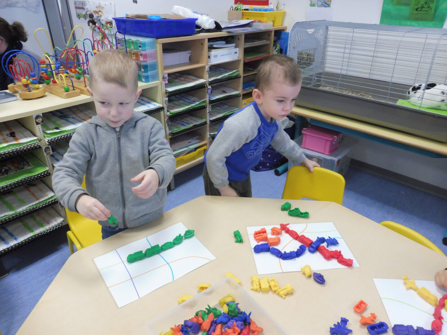En motricité fine, nous avons placé les voitures ou les animaux les uns derrière les autres sur les lignes de couleurs.