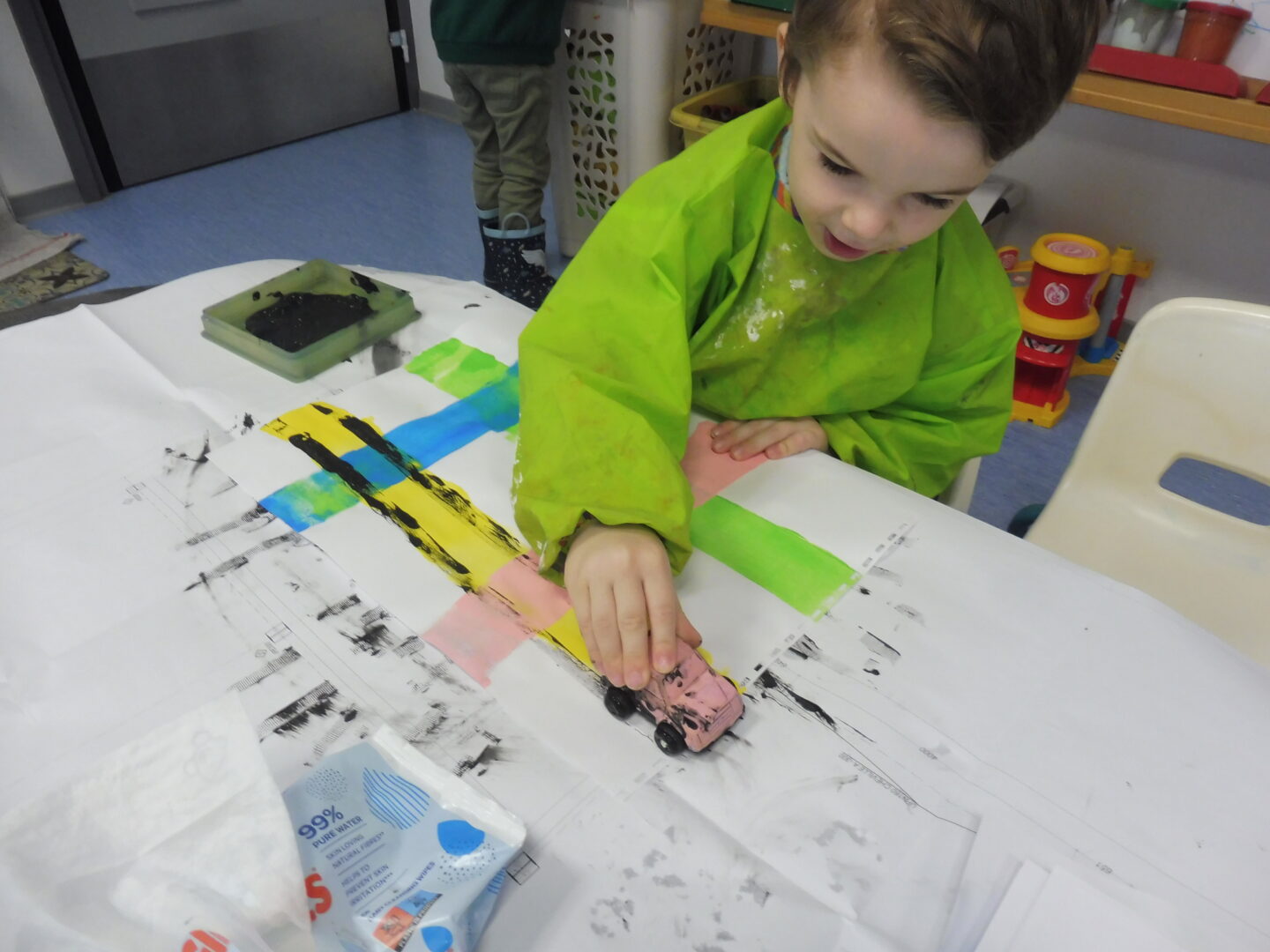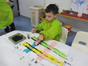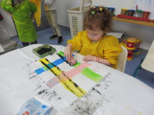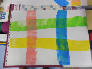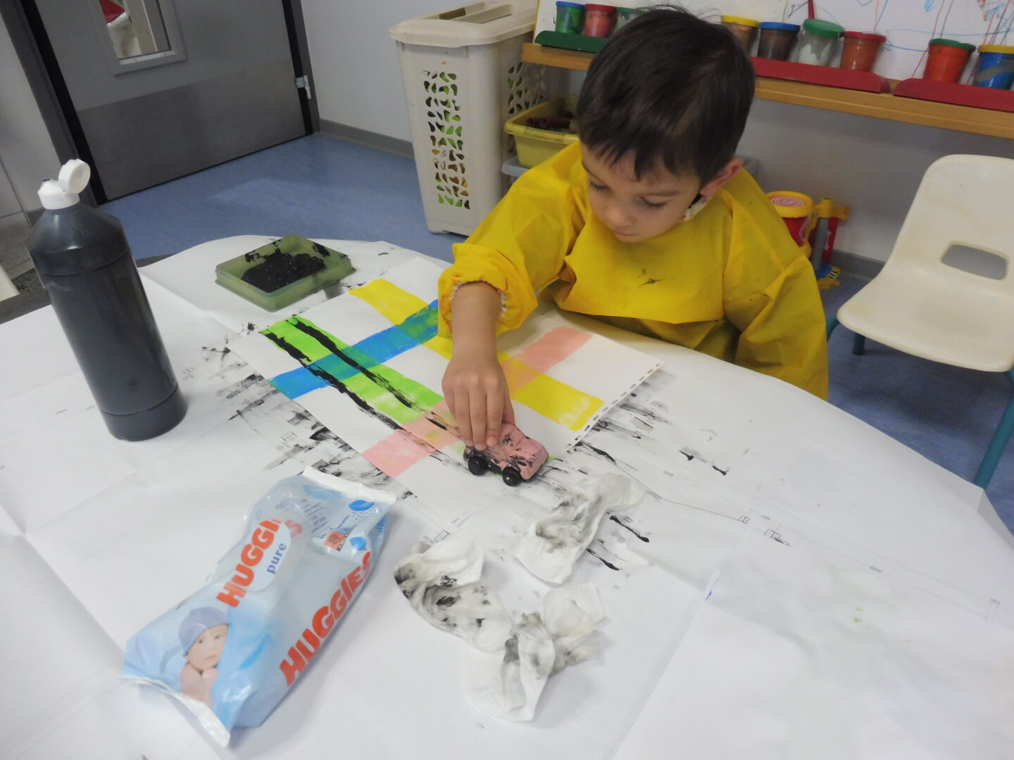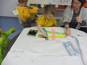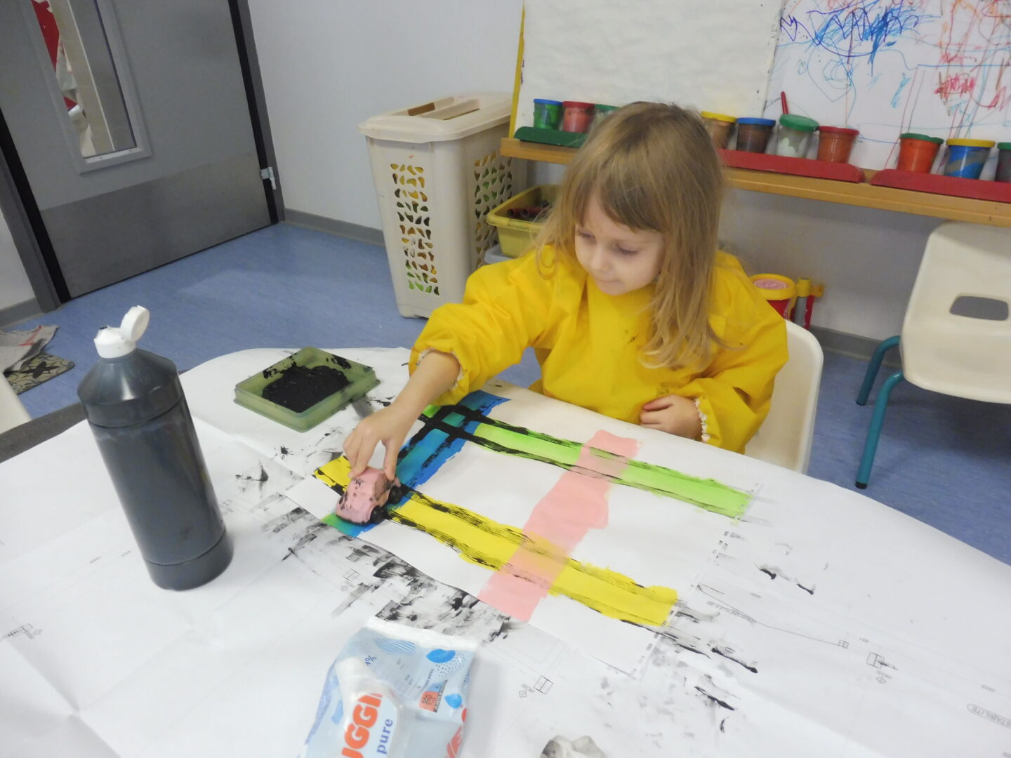 En graphisme, nous avons terminé notre travail sur la ligne continue. Avec le rouleau, nous avons tracé des routes de couleur.
