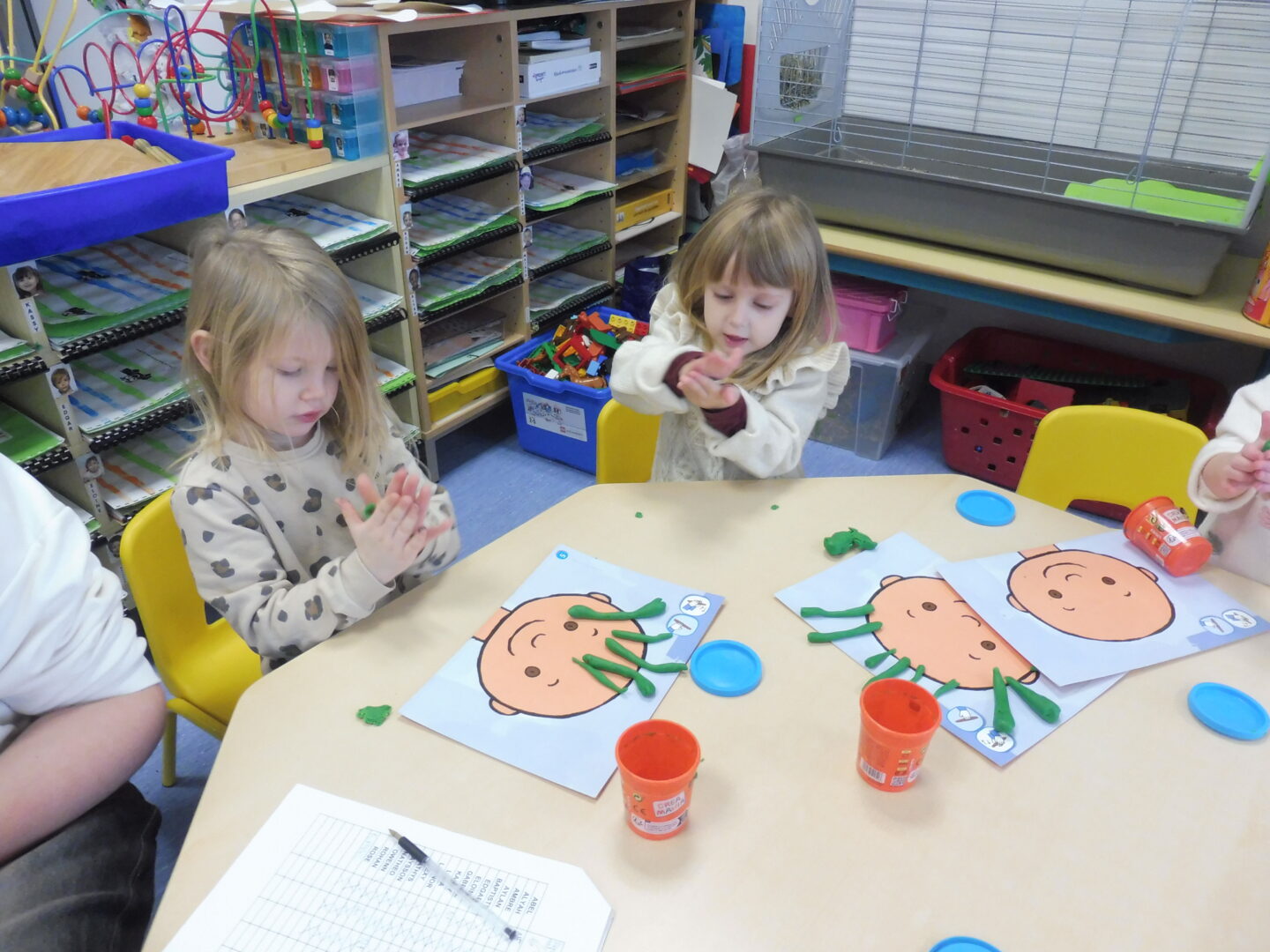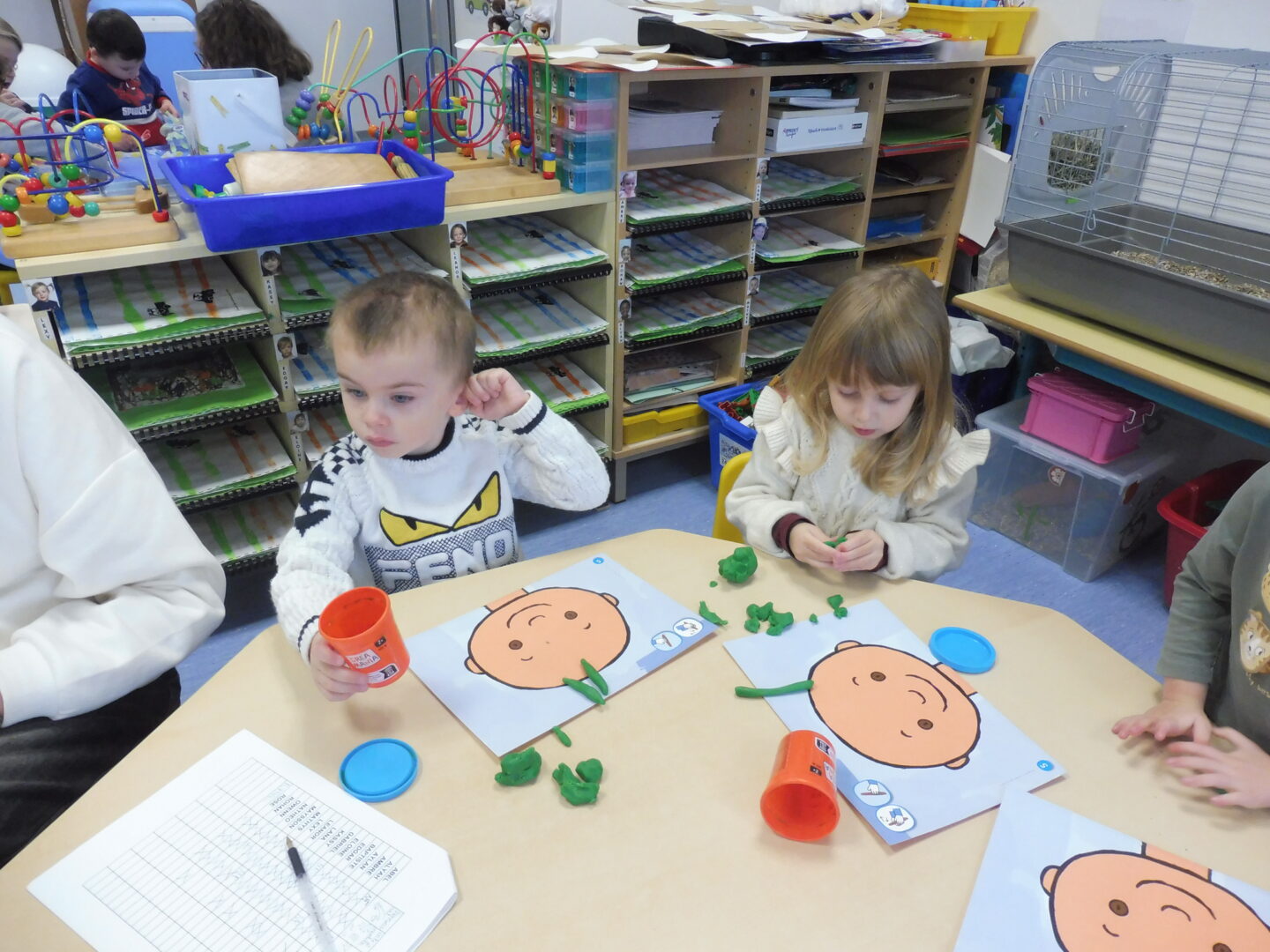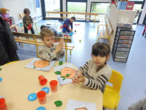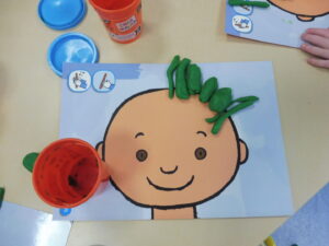 Pour finir, avec la pâte à modeler, nous avons fait les cheveux du garçon.