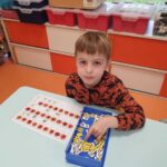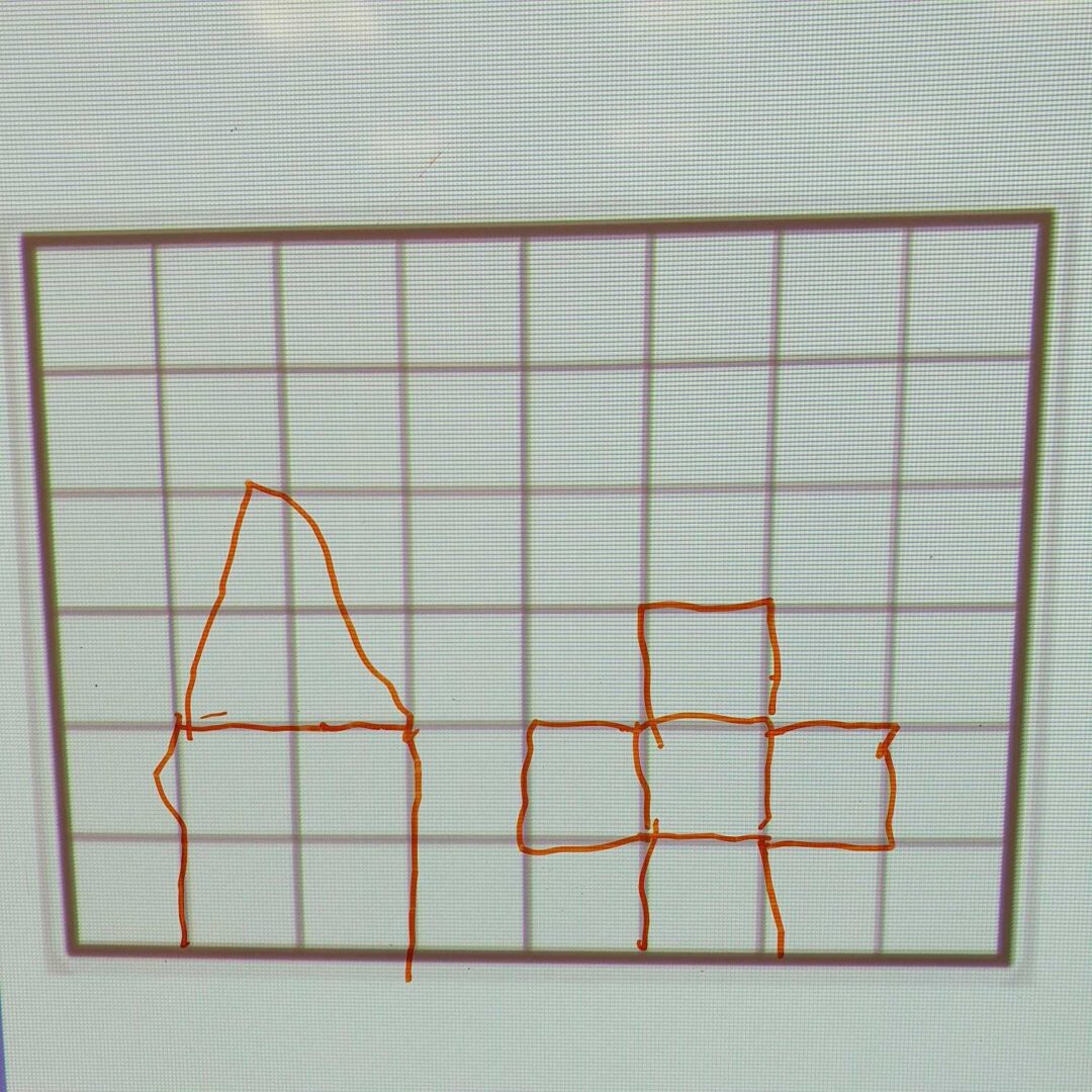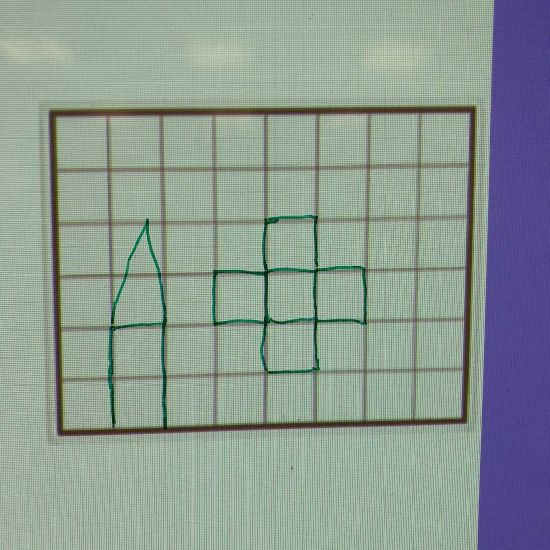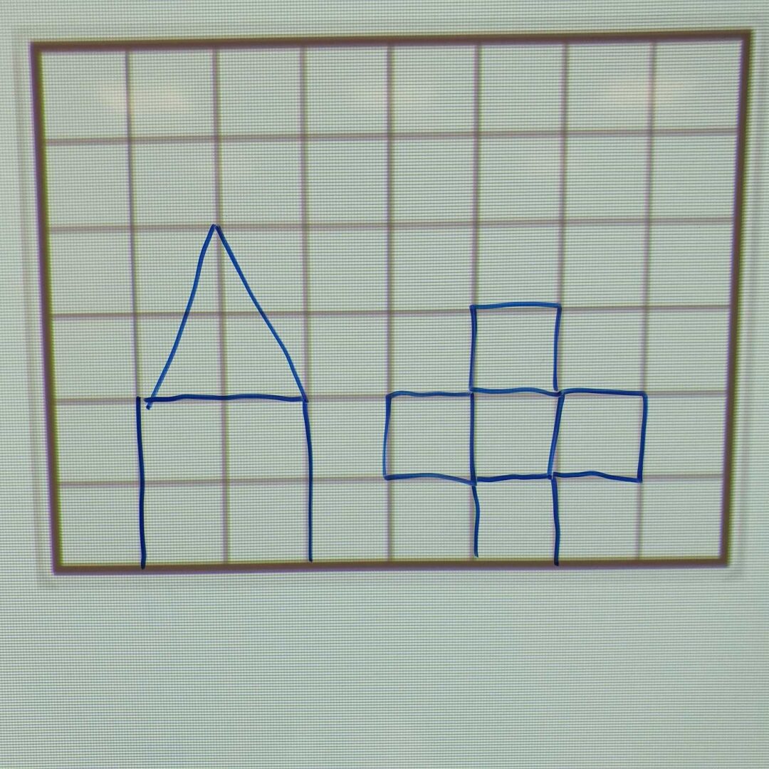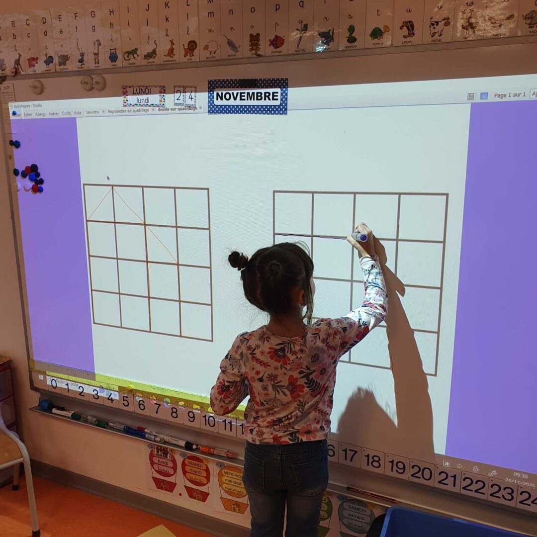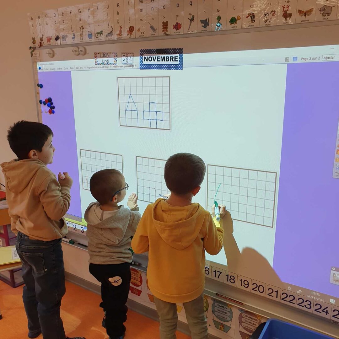 Nous avons essayé de reproduire des figures sur un quadrillage sur le tableau. La maîtresse faisait une figure, nous la reproduisions puis nous regardions nos erreurs.
