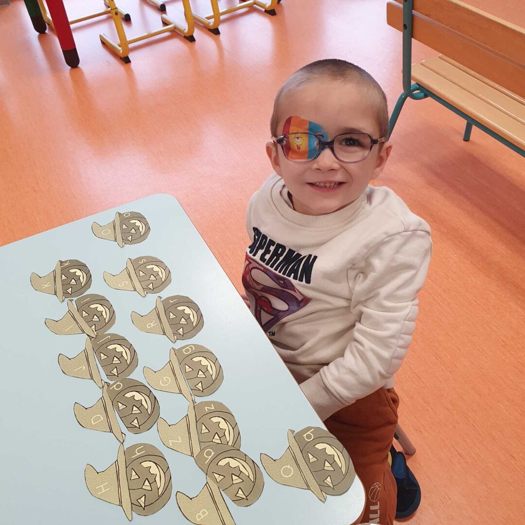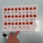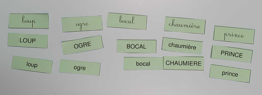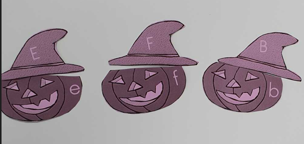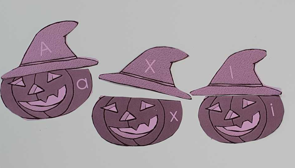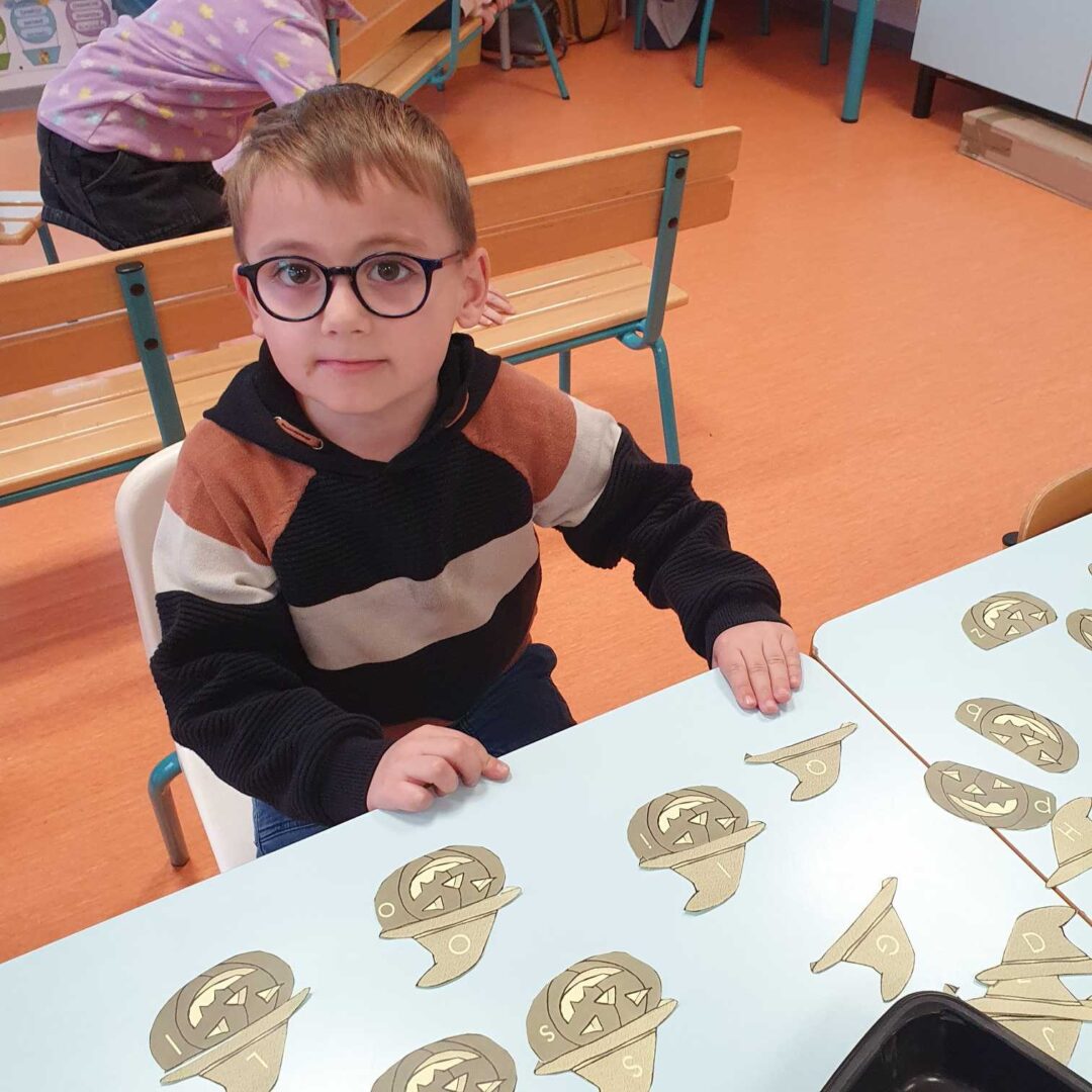 Nous continuons de travailler sur la correspondance entre les différentes graphies d’une lettre. Nous avons posé la lettre scripte sous chaque citrouille notée d’une lettre capitale, nous avons associé la citrouille et son chapeau (capitale sur le chapeau et scripte sur la citrouille), nous avons associé des mots dans les 3 écritures puis nous avons aussi joué au bingo avec Lily (elle tirait une lettre scripte que nous devions associer à nos lettres capitales de la citrouille).