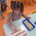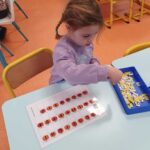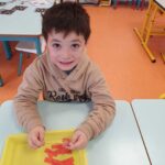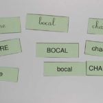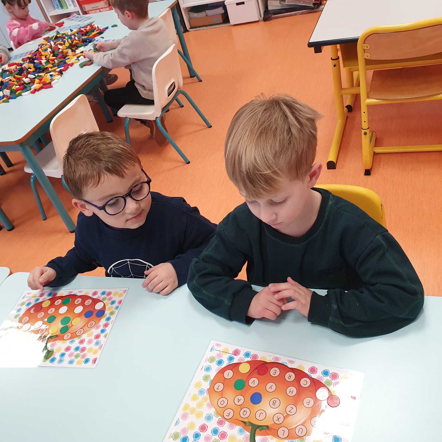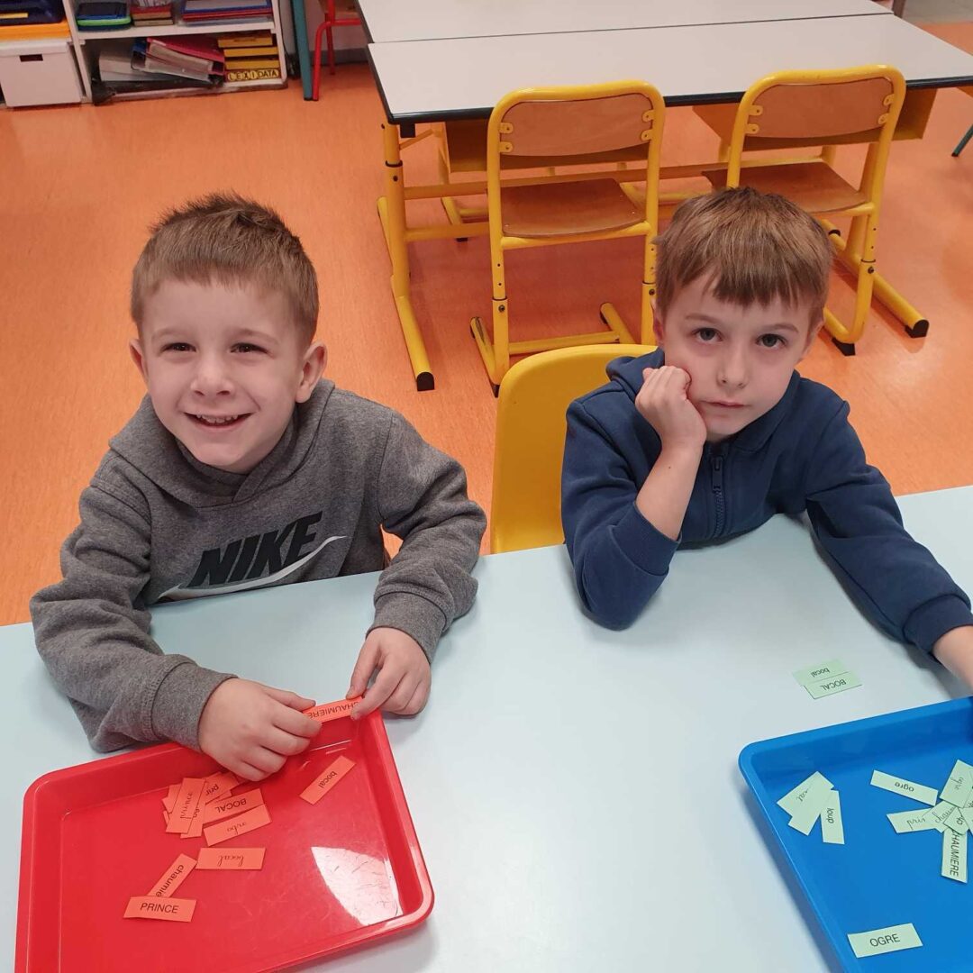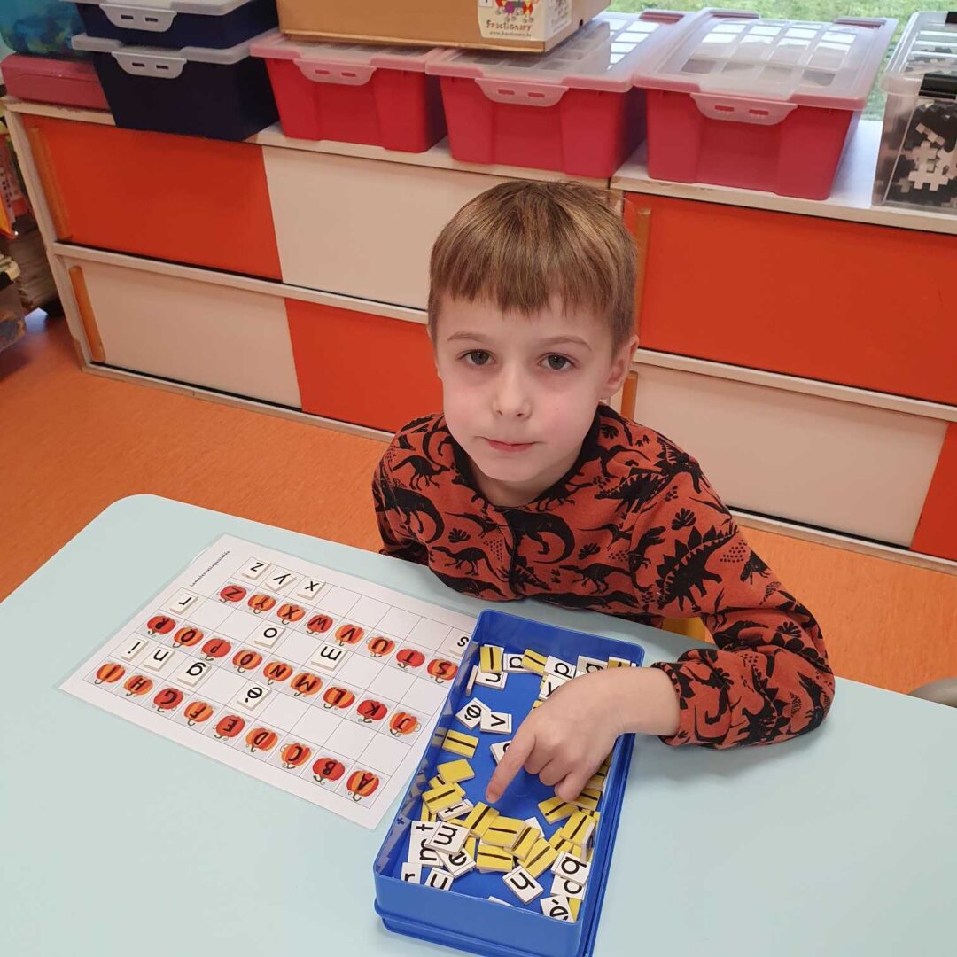 Nous continuons de travailler sur la correspondance entre les différentes graphies d’une lettre. Nous avons posé la lettre scripte sous chaque citrouille notée d’une lettre capitale, nous avons associé la citrouille et son chapeau (capitale sur le chapeau et scripte sur la citrouille), nous avons associé des mots dans les 3 écritures puis nous avons aussi joué au bingo avec Lily (elle tirait une lettre scripte que nous devions associer à nos lettres capitales de la citrouille).