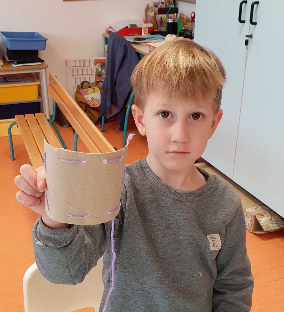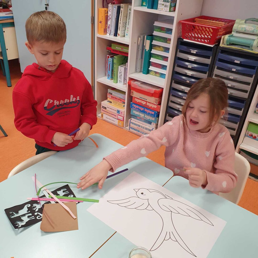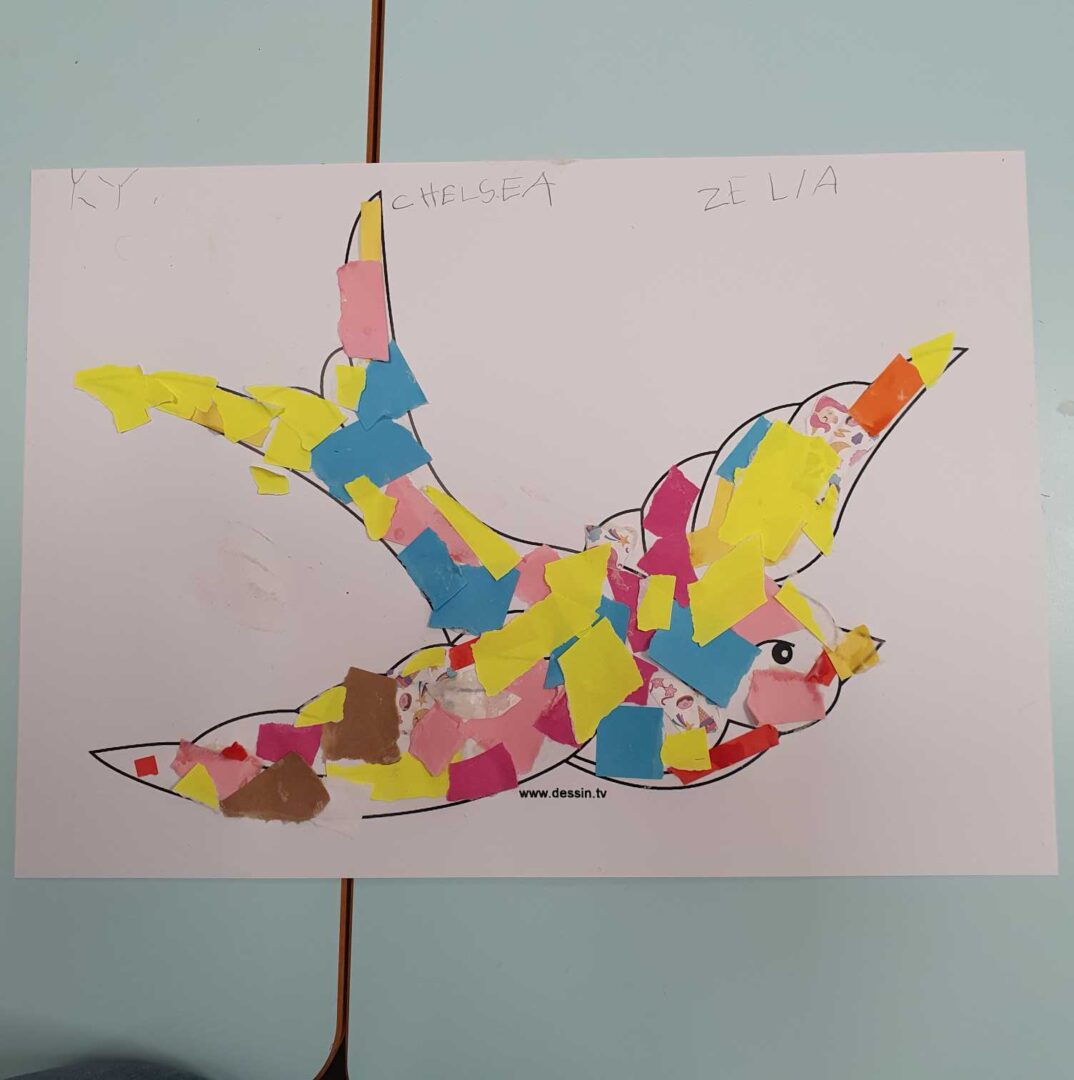 Et vendredi matin, Manon est intervenue dans la classe. Elle nous a présenté le roi Capriccio qui jetait ses jouets dès qu’il ne voulait plus jouer avec. Heureusement avec la fée Rosa, nous lui avons appris que nous pouvions trier les jouets (à garder, à réparer, à donner, à jeter). Pour nous remercier de l’avoir aidé avec Capriccio, elle nous a appris une recette de colle (farine + eau) et nous a donné de beaux oiseaux à décorer. Nous avons décidé d’utiliser les déchets de la poubelle de la classe pour les décorer. Mais dans les affaires à réparer, il y avait une chaussette trouée et on ne pouvait pas la réparer avec de la colle alors Manon nous a montré comment coudre, nous nous sommes entraînés pour montrer au roi Capriccio. Manon nous a prévenus que la prochaine fois, elle viendrait avec un autre personnage qui s’appelle Gaston et qui est vert, nous n’avons pas trouvé qui cela pouvait être (grenouille, serpent, Hulk….). La réponse sera pour la semaine prochaine…