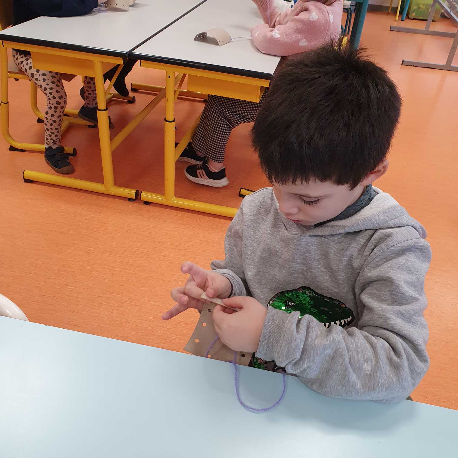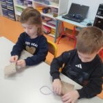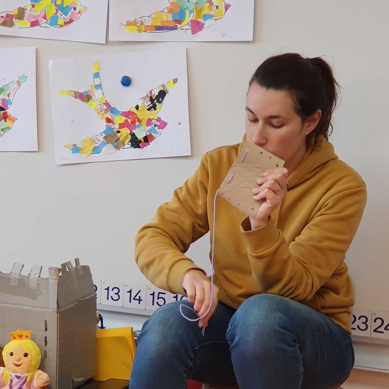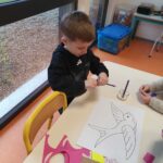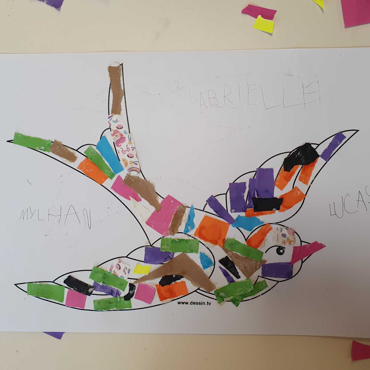 Et vendredi matin, Manon est intervenue dans la classe. Elle nous a présenté le roi Capriccio qui jetait ses jouets dès qu’il ne voulait plus jouer avec. Heureusement avec la fée Rosa, nous lui avons appris que nous pouvions trier les jouets (à garder, à réparer, à donner, à jeter). Pour nous remercier de l’avoir aidé avec Capriccio, elle nous a appris une recette de colle (farine + eau) et nous a donné de beaux oiseaux à décorer. Nous avons décidé d’utiliser les déchets de la poubelle de la classe pour les décorer. Mais dans les affaires à réparer, il y avait une chaussette trouée et on ne pouvait pas la réparer avec de la colle alors Manon nous a montré comment coudre, nous nous sommes entraînés pour montrer au roi Capriccio. Manon nous a prévenus que la prochaine fois, elle viendrait avec un autre personnage qui s’appelle Gaston et qui est vert, nous n’avons pas trouvé qui cela pouvait être (grenouille, serpent, Hulk….). La réponse sera pour la semaine prochaine…