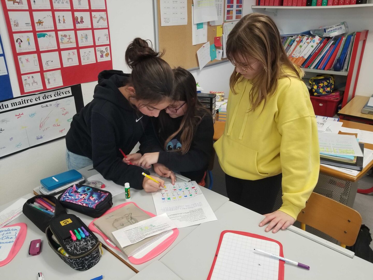 Les élèves s’organisent comme ils veulent mais à la fin des 50 minutes, la classe ne doit rendre qu’une seule solution pour chaque problème, ce qui implique de l’entraide, de la coopération, de la patience, de la concentration, de la motivation,…
