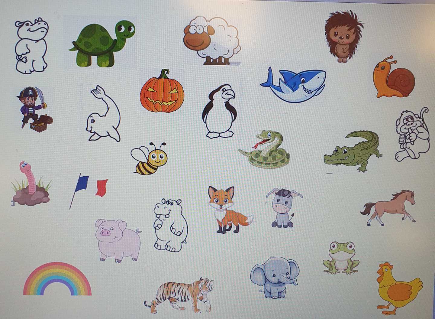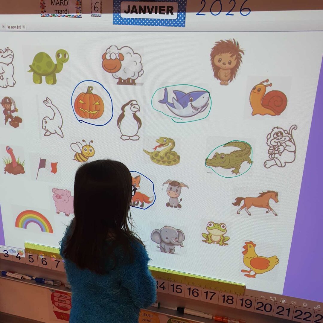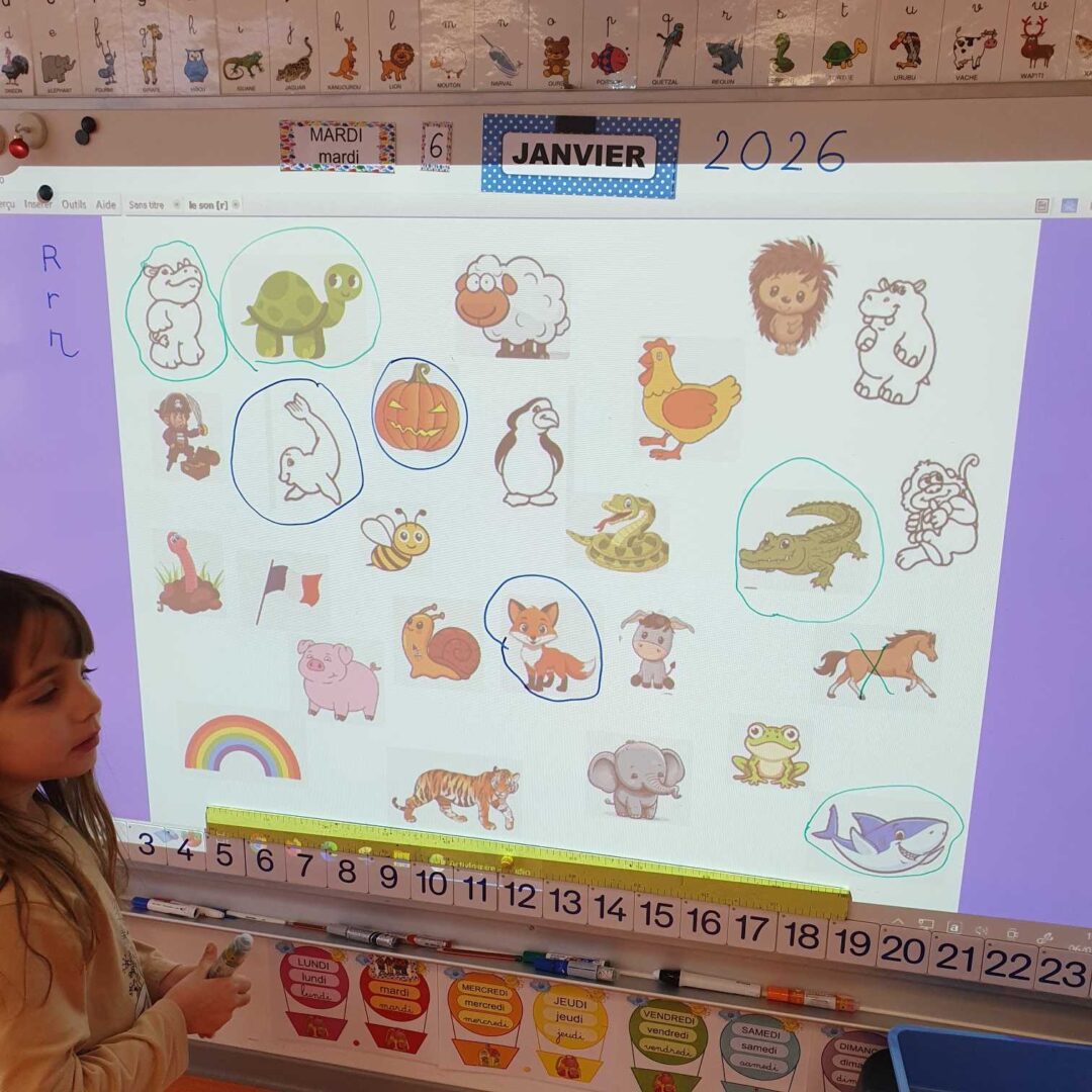 – nous nous sommes intéressés à la lettre R de roi et reine, et nous avons entouré (ou barré) les dessins selon que leur nom contenait le son [r] ou non.