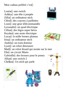 – nous avons dit à maîtresse notre cadeau préféré de Noël