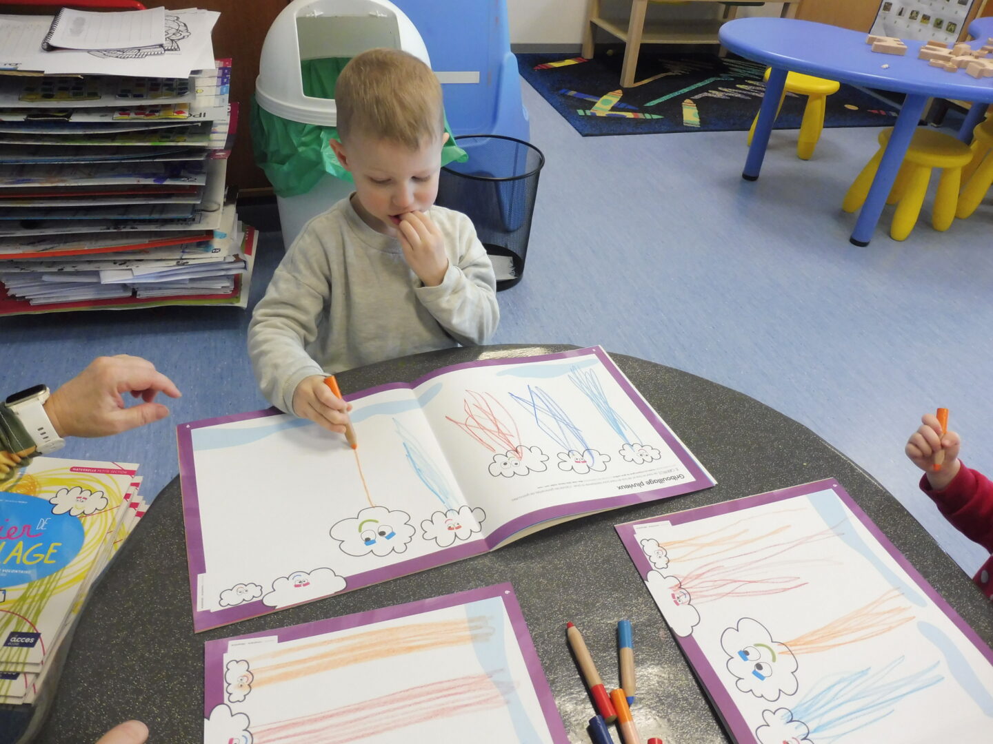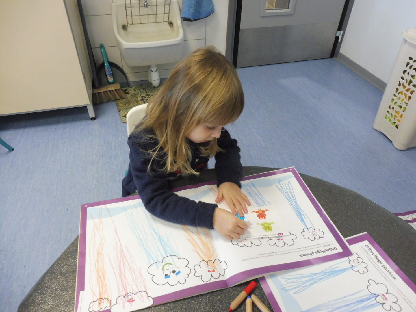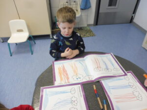 En graphisme, nous avons continué notre travail sur le trait vertical. Sur notre cahier de gribouillage, nous avons dessiné la pluie qui tombe des nuages.