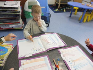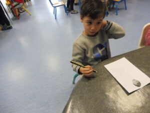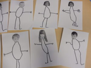 Ensuite, lors d’une séance de dessin dirigé avec la maîtresse, nous avons dessiné les parties manquantes de notre corps.