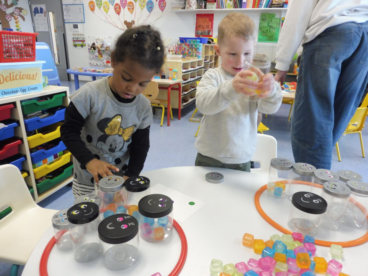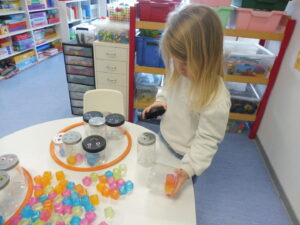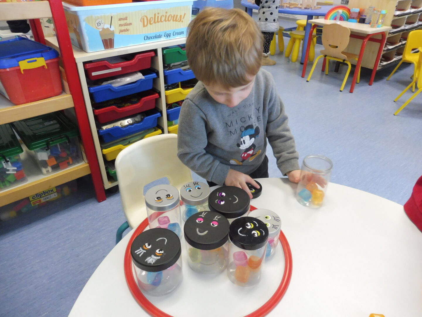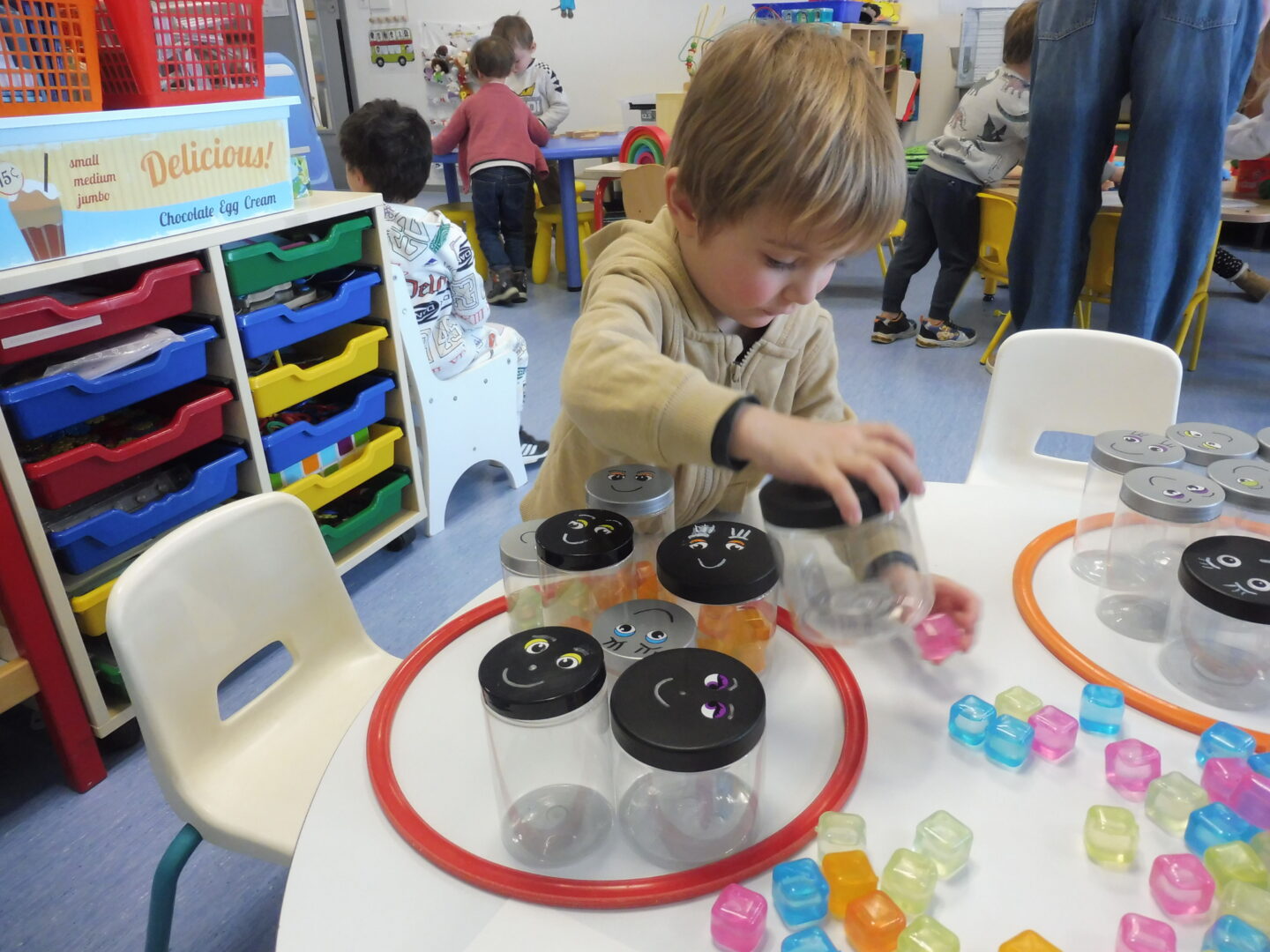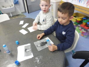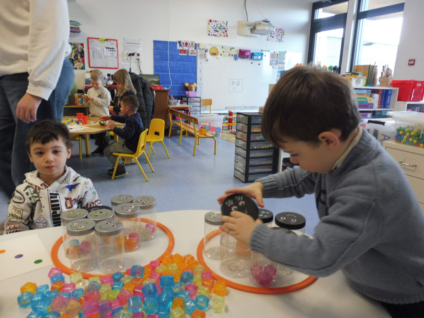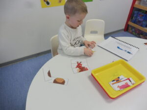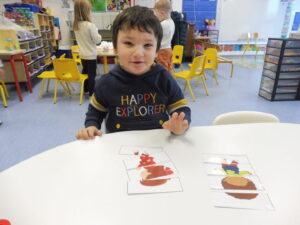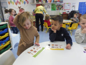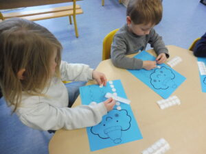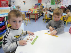 En numération, nous avons joué à Croque le 3 pour apprendre à construire des collections de 3 objets. Nous avons placé trois bonbons dans chaque boîte bonhomme.