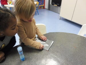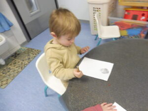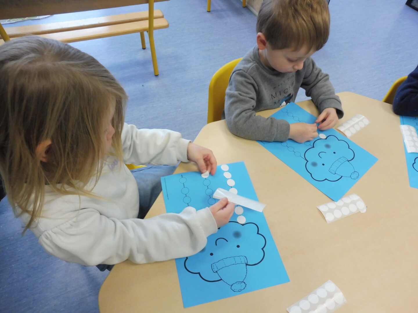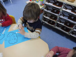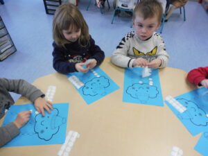 En motricité fine, nous avons placé une gommette sur chaque rond dessiné pour représenter la neige qui tombe.