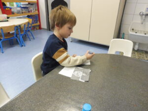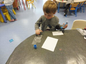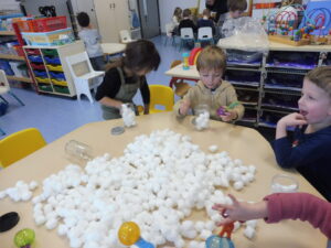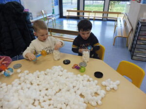 Puis avec les ciseaux boule, nous avons placé des boules de coton dans les boites pour faire des bonhommes de neige.