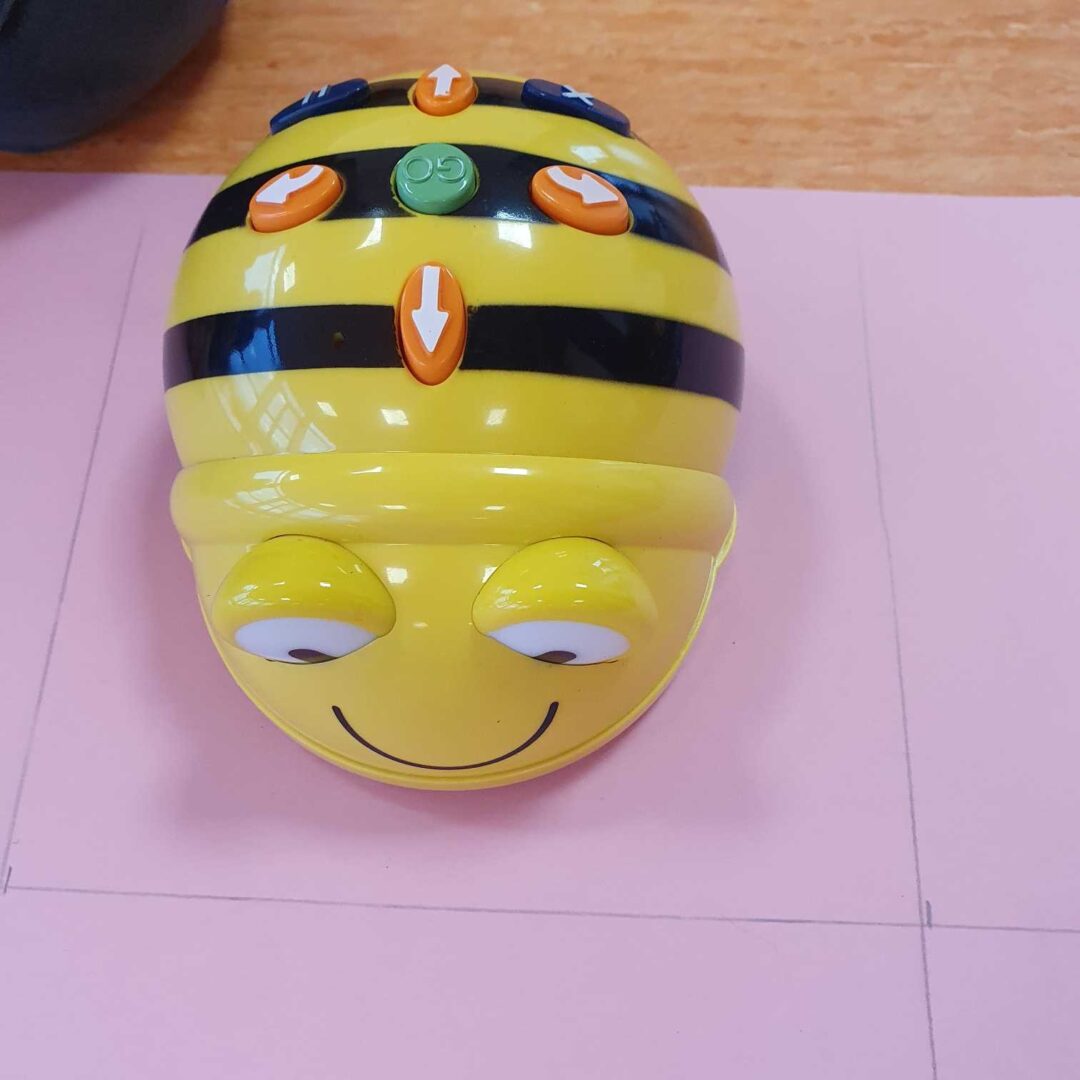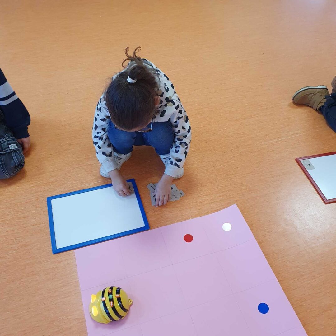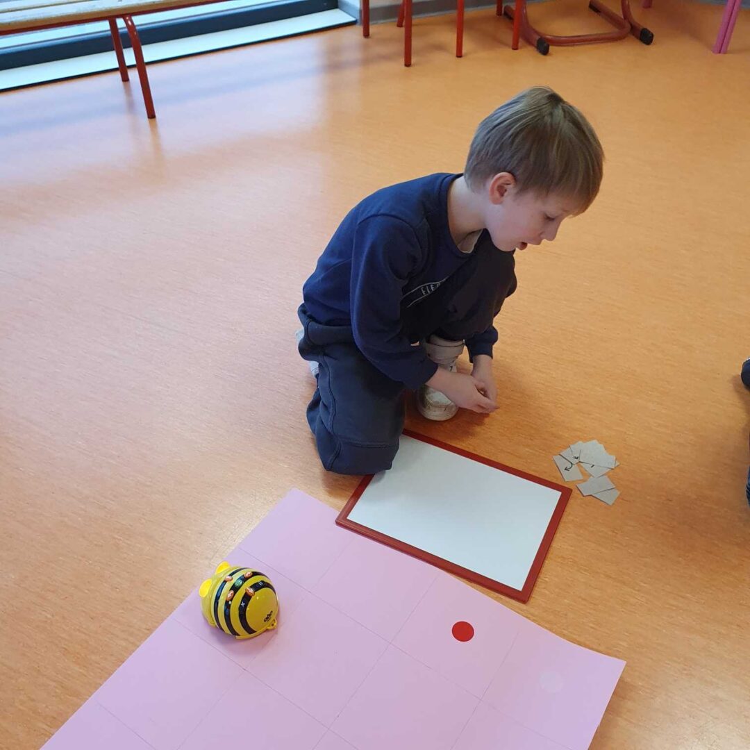 Depuis plusieurs semaines, nous jouons aussi avec un petit robot abeille que nous programmons pour qu’elle effectue les trajets demandés.