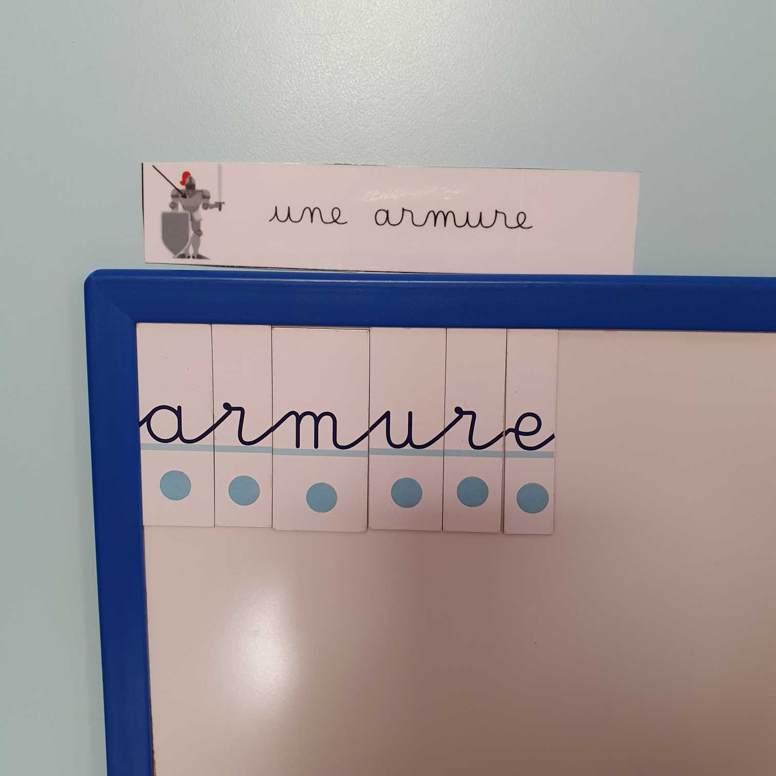 Nous avons donc commencé à découvrir le vocabulaire de la chevalerie. nous avons travaillé sur les mots en recomposant avec des lettres scriptes les modèles en capitales mais aussi juste avec des lettres cursives les modèles en cursif.