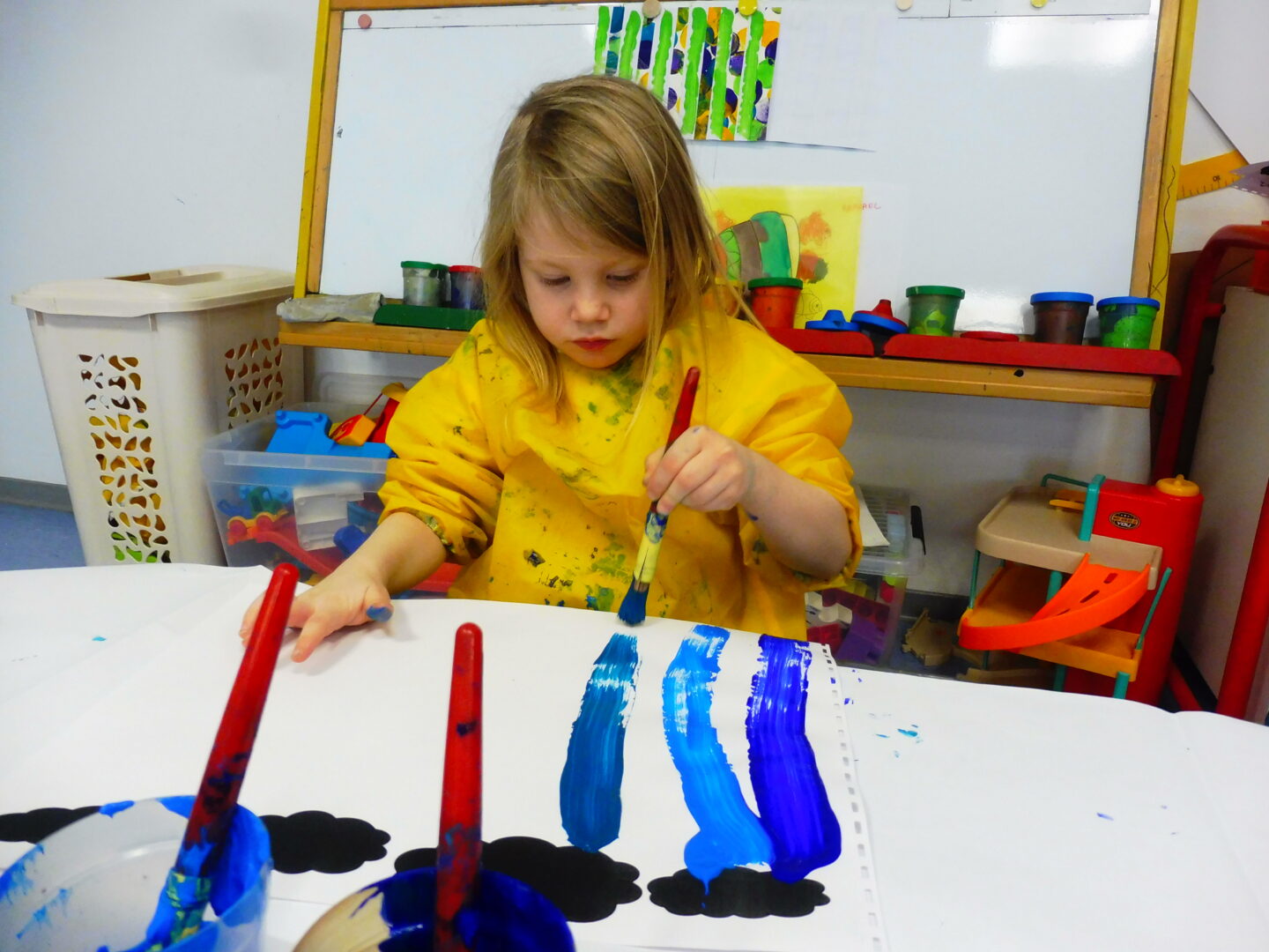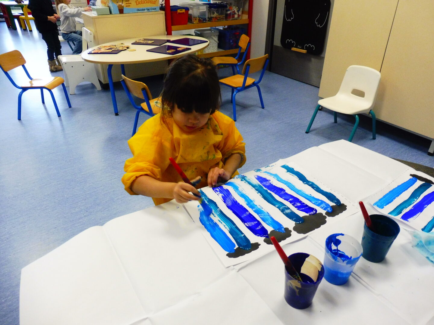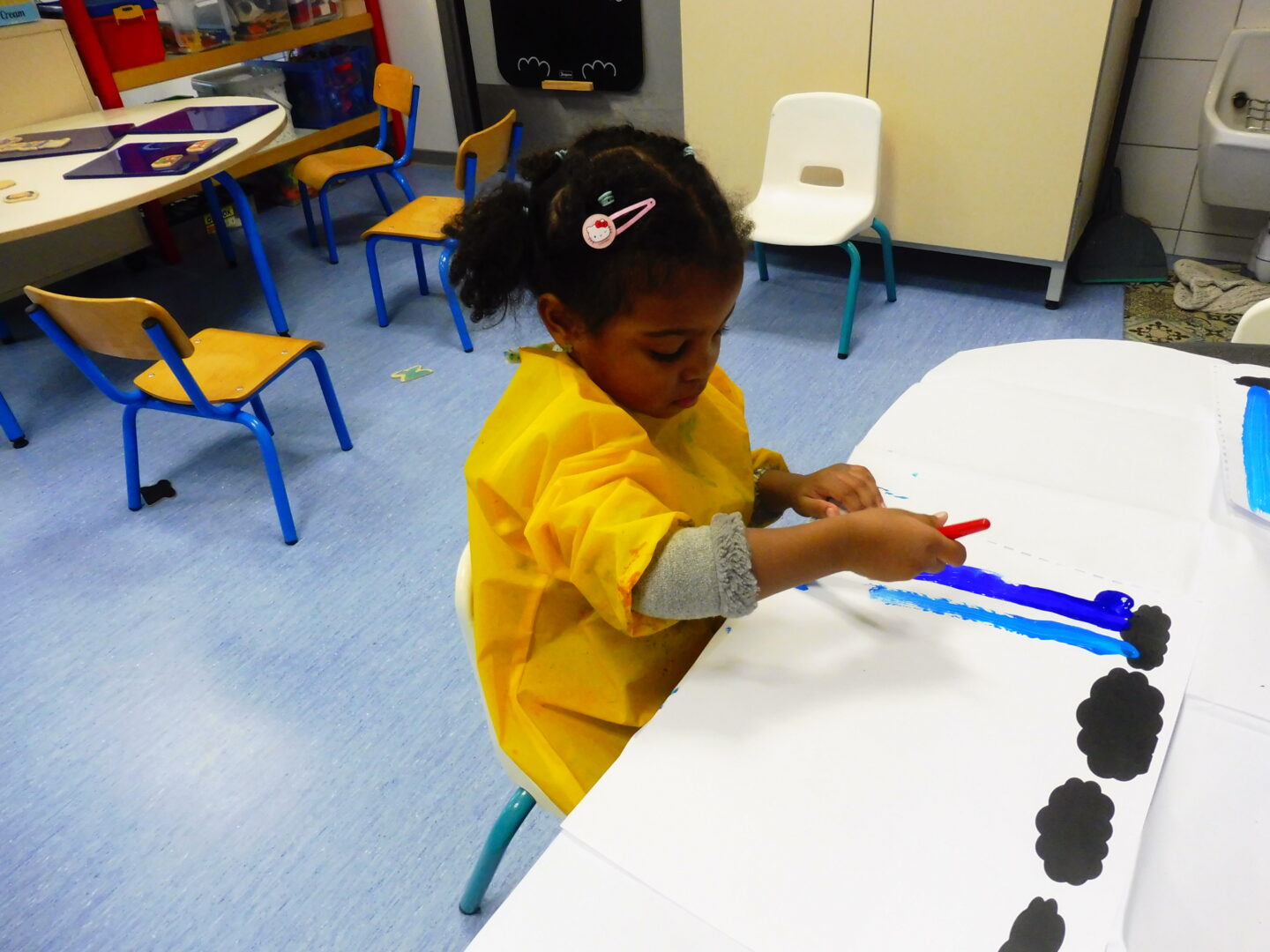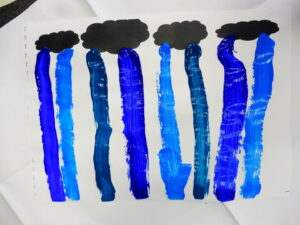 En graphisme, nous avons continué notre travail sur la ligne verticale. Avec le pinceau, nous avons fait la pluie qui tombe des nuages.