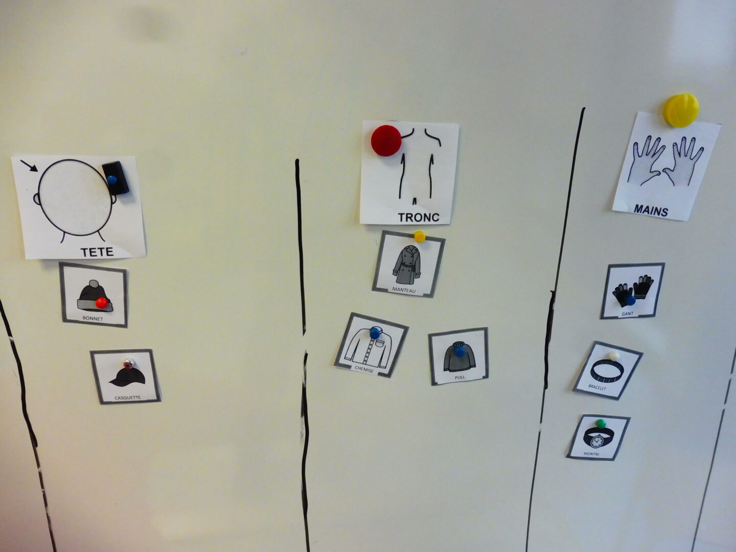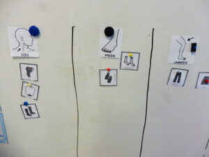 En langage oral, nous avons continué à associer le vêtement à la partie du corps. Nous devions dire le nom du vêtement et dire où nous le portions. Ensuite nous devions le ranger dans la bonne case du tableau.