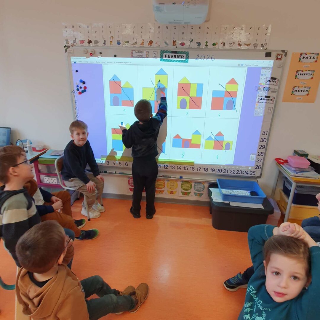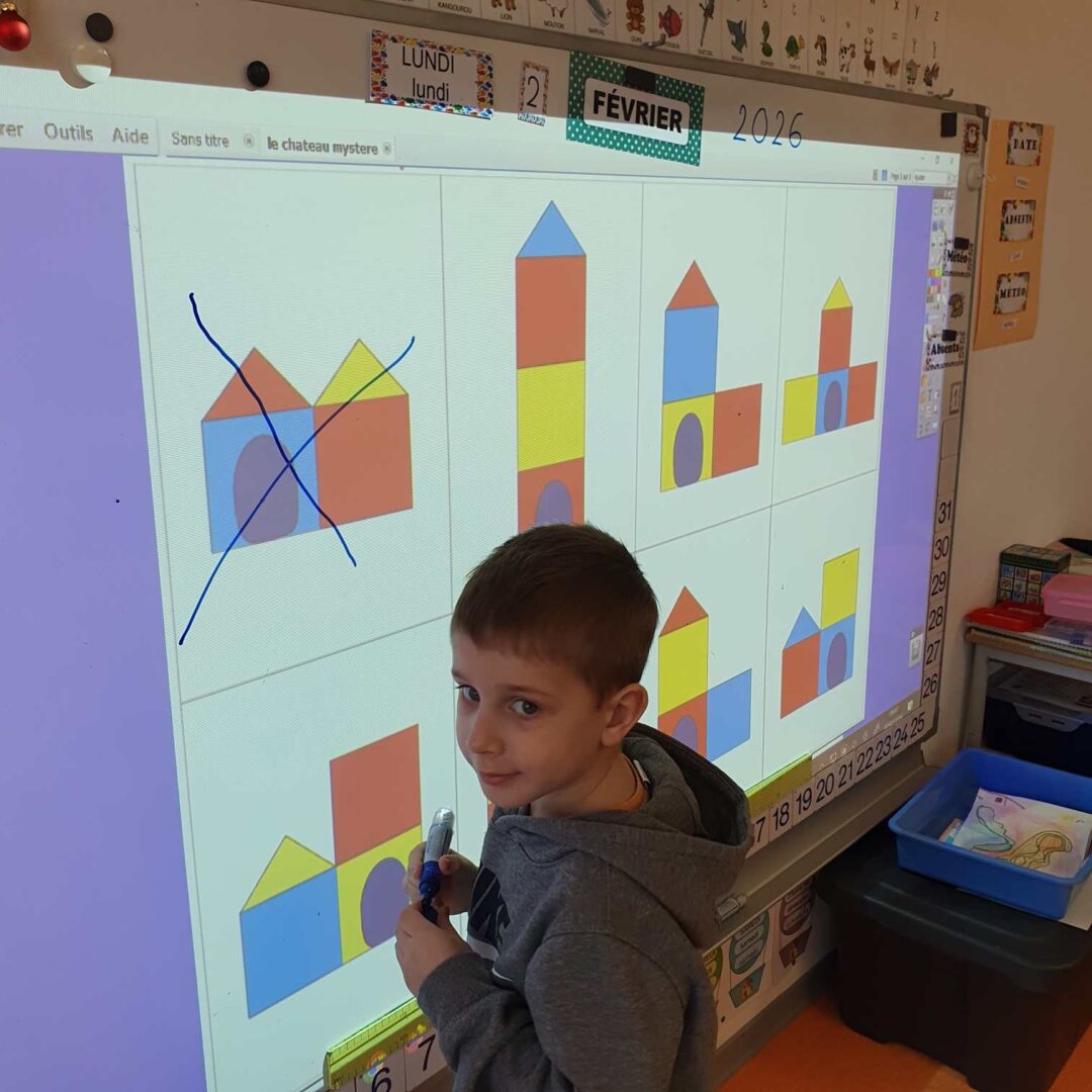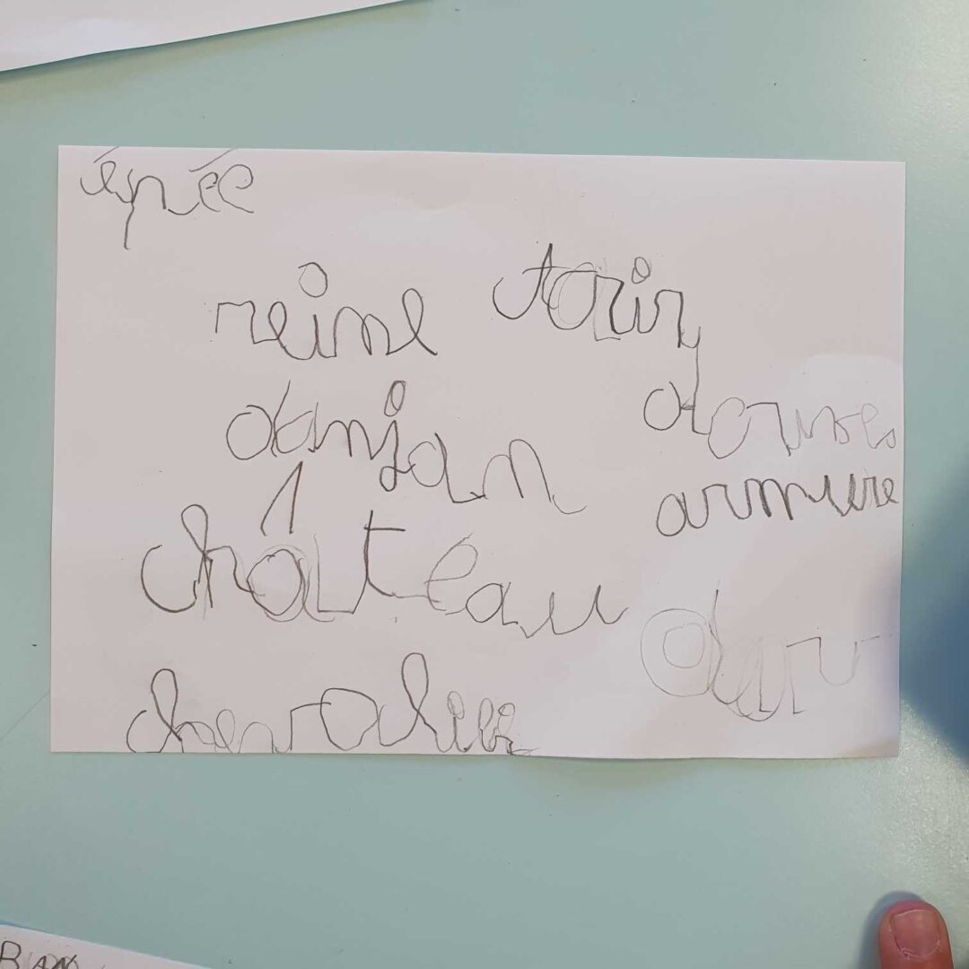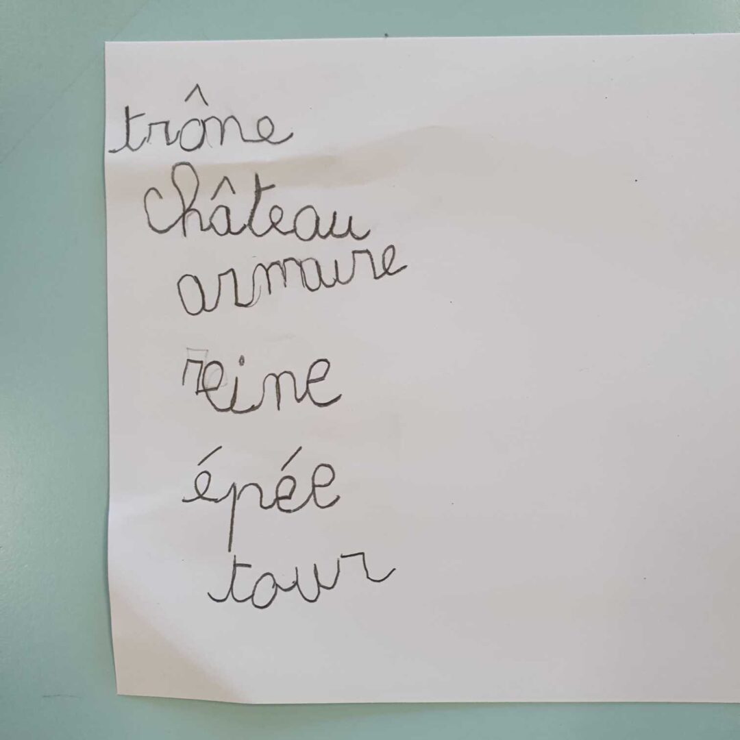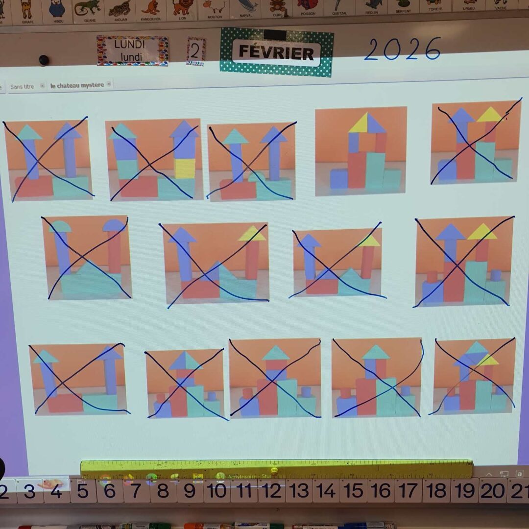 – en langage, nous avons cherché le château mystère. Plusieurs châteaux étaient affichés au tableau, la maitresse en choisissait un ; il fallait poser des questions syntaxiquement correctes pour l’identifier. La maîtresse ne pouvait répondre que par oui ou non, puis nous barrions les châteaux qui ne convenaient pas.