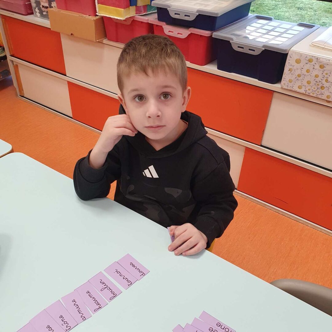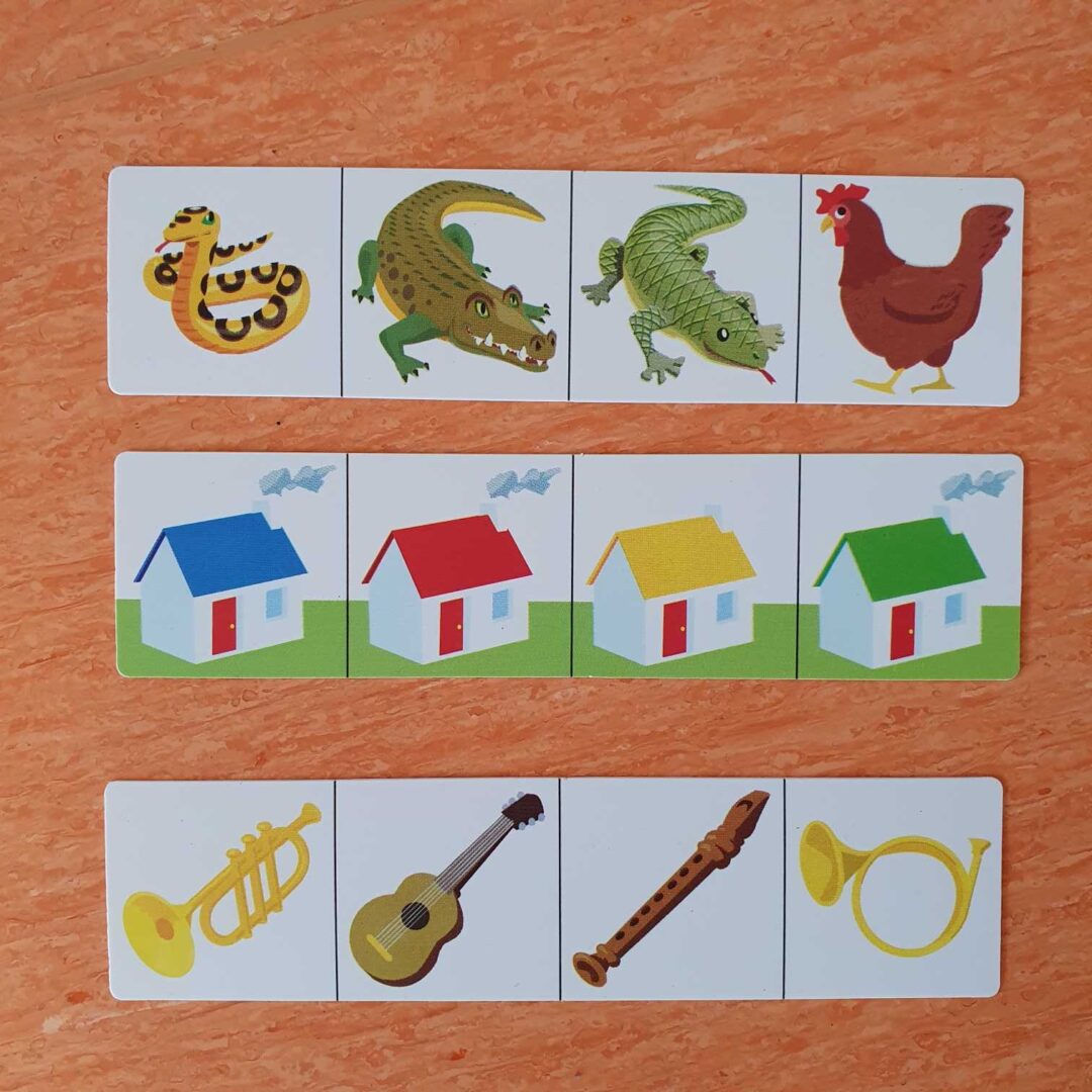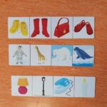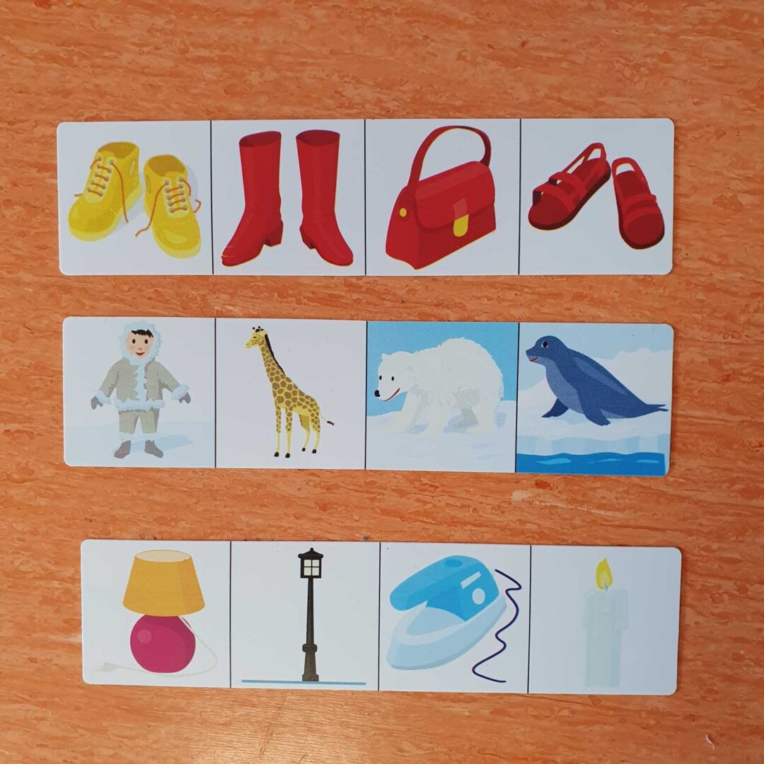 – nous avons aussi travaillé notre logique avec un jeu. Sur chaque bande, il fallait trouver un intrus et justifier pourquoi. Parfois il y avait plusieurs possibilités, l’important était de bien justifier son choix. Par exemple, l’intrus est l’objet jaune car tous les autres sont rouges ou l’intrus est le sac à main car tous les autres sont des chaussures.