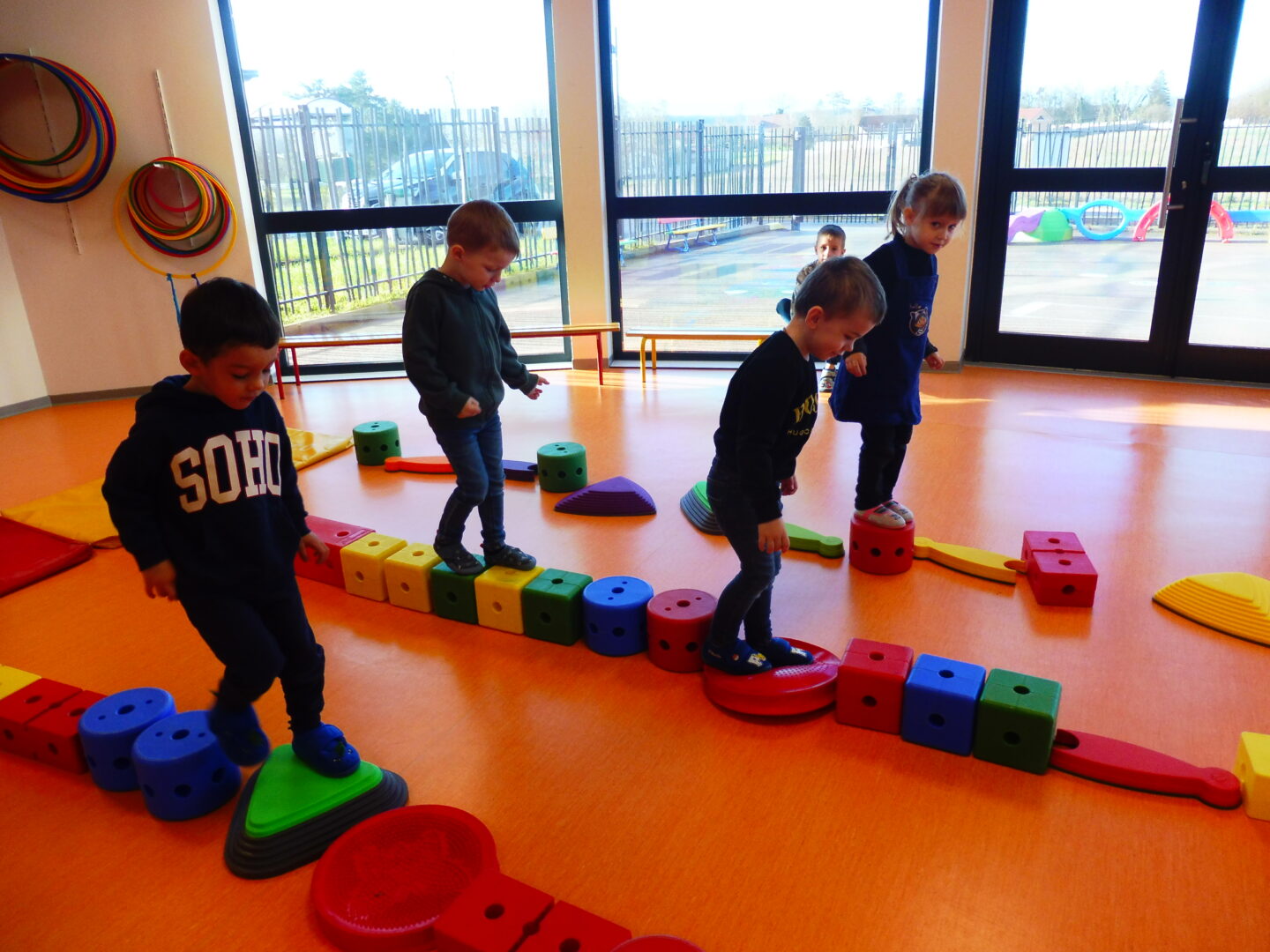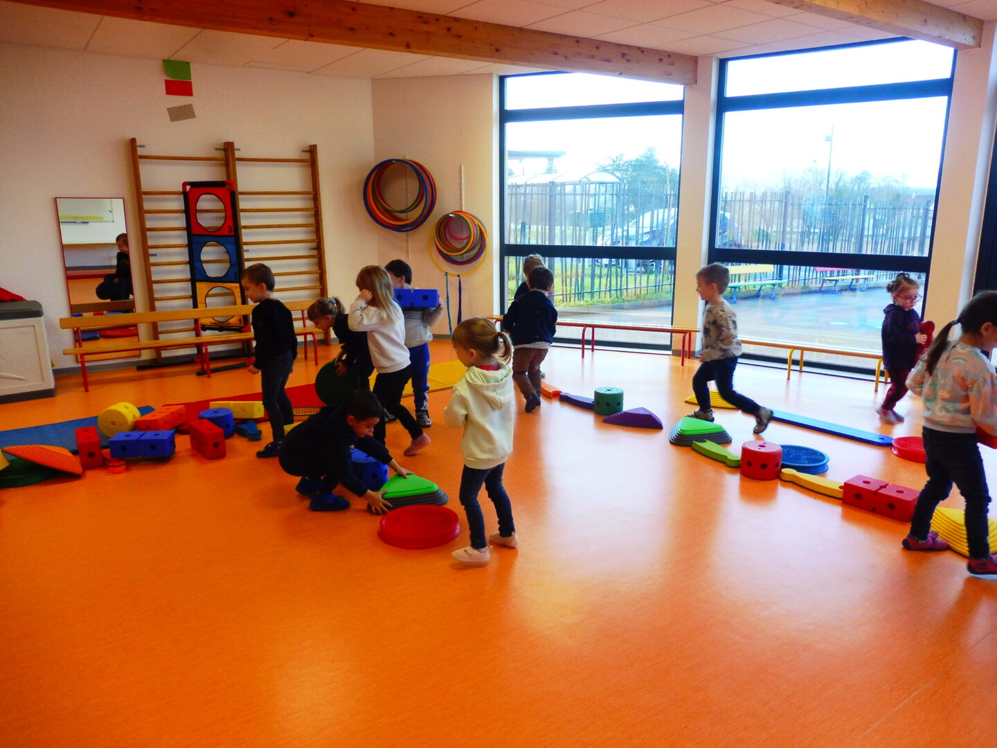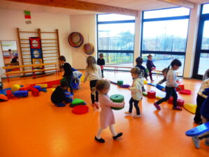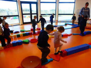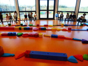 Nous sommes alors allés dans la salle de sport pour reproduire l’image avec le matériel de sport. Une fois nos objets placés horizontalement, nous avons pu marcher sur les parcours.